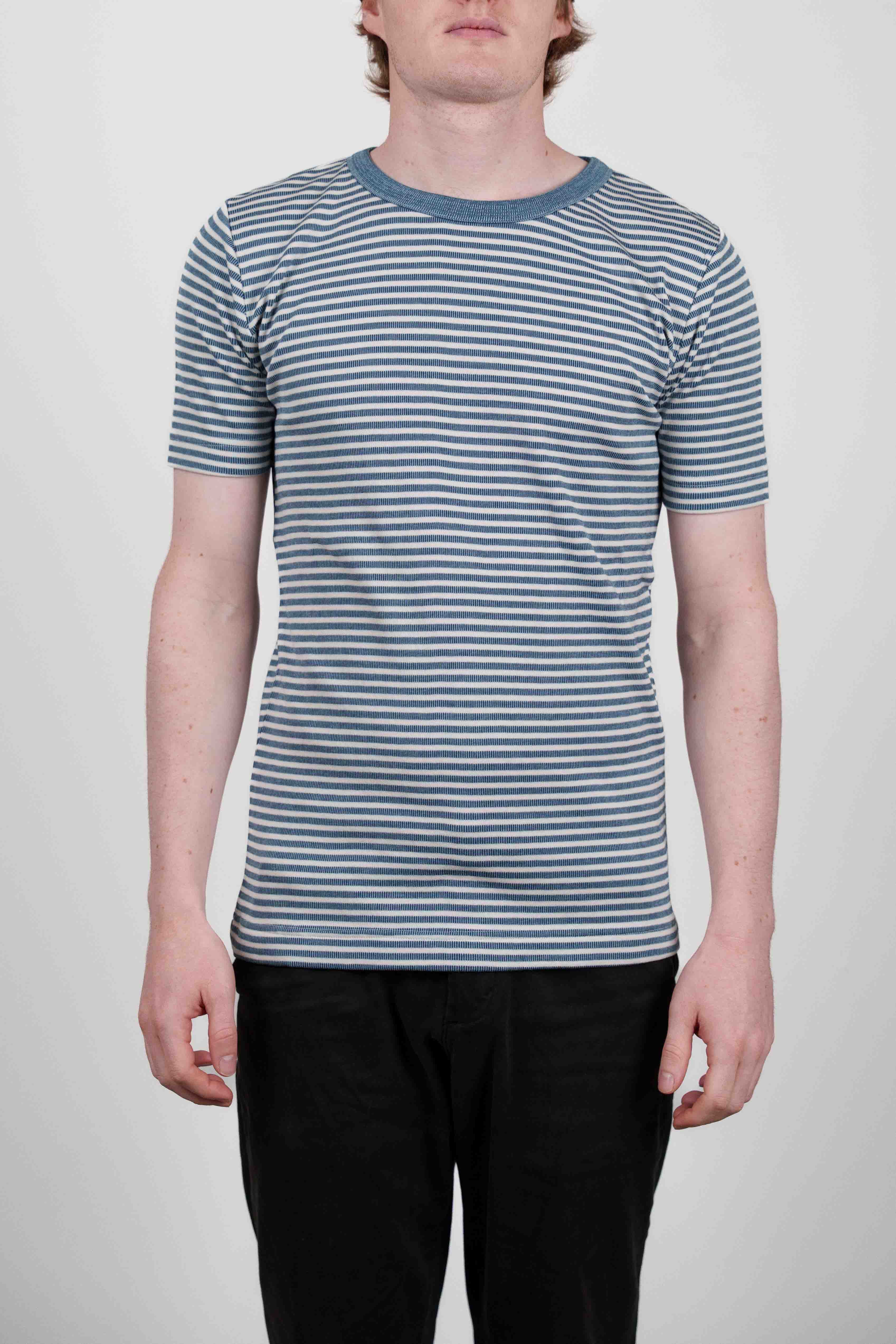 Crew neck T-shirt med horisontale blå og hvide striber fra W011-kollektionen. Stoffet er en finribbet strik, som giver den et let tekstureret udseende. Den har korte ærmer og en klassisk pasform, der sikrer en tidløs stil.
