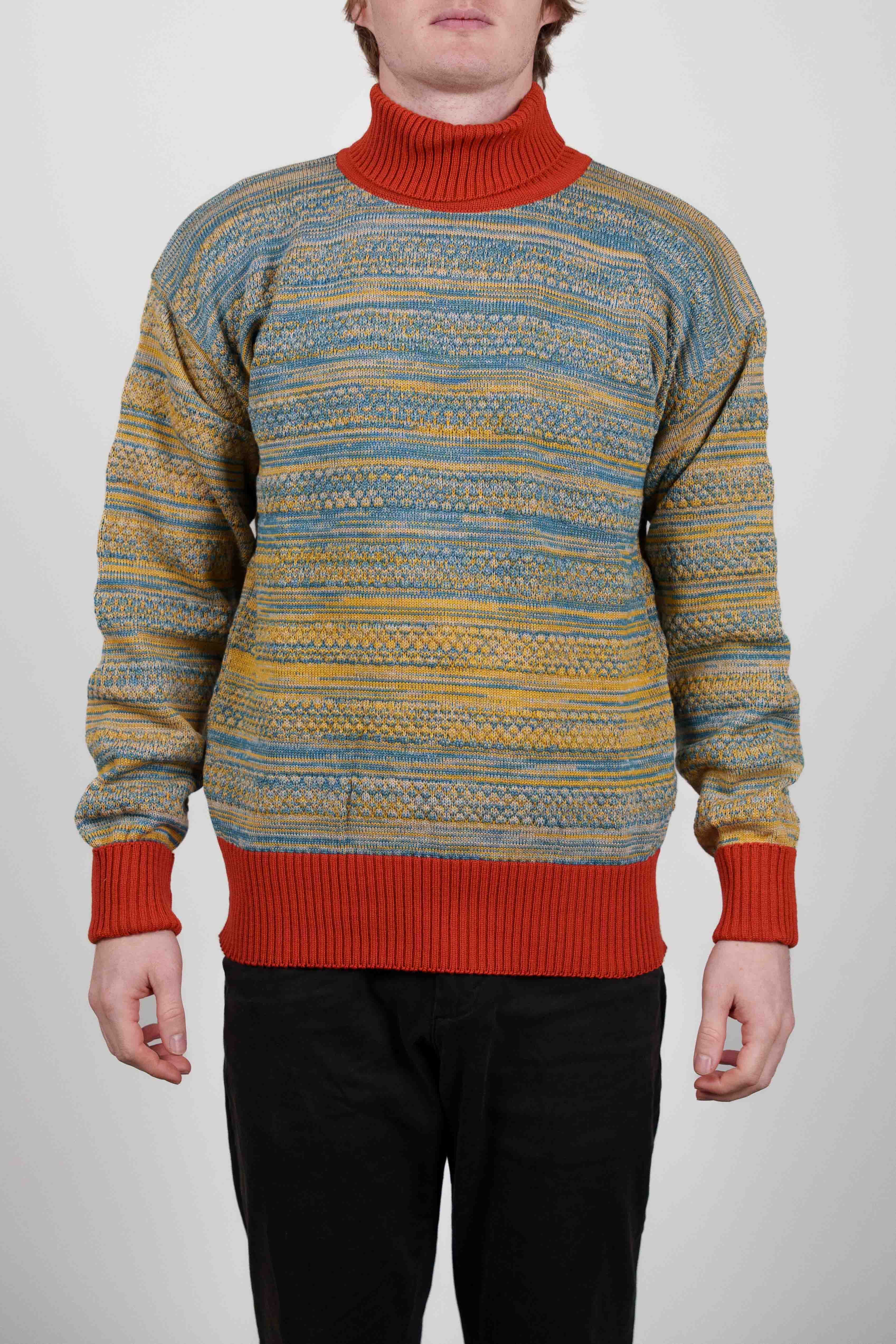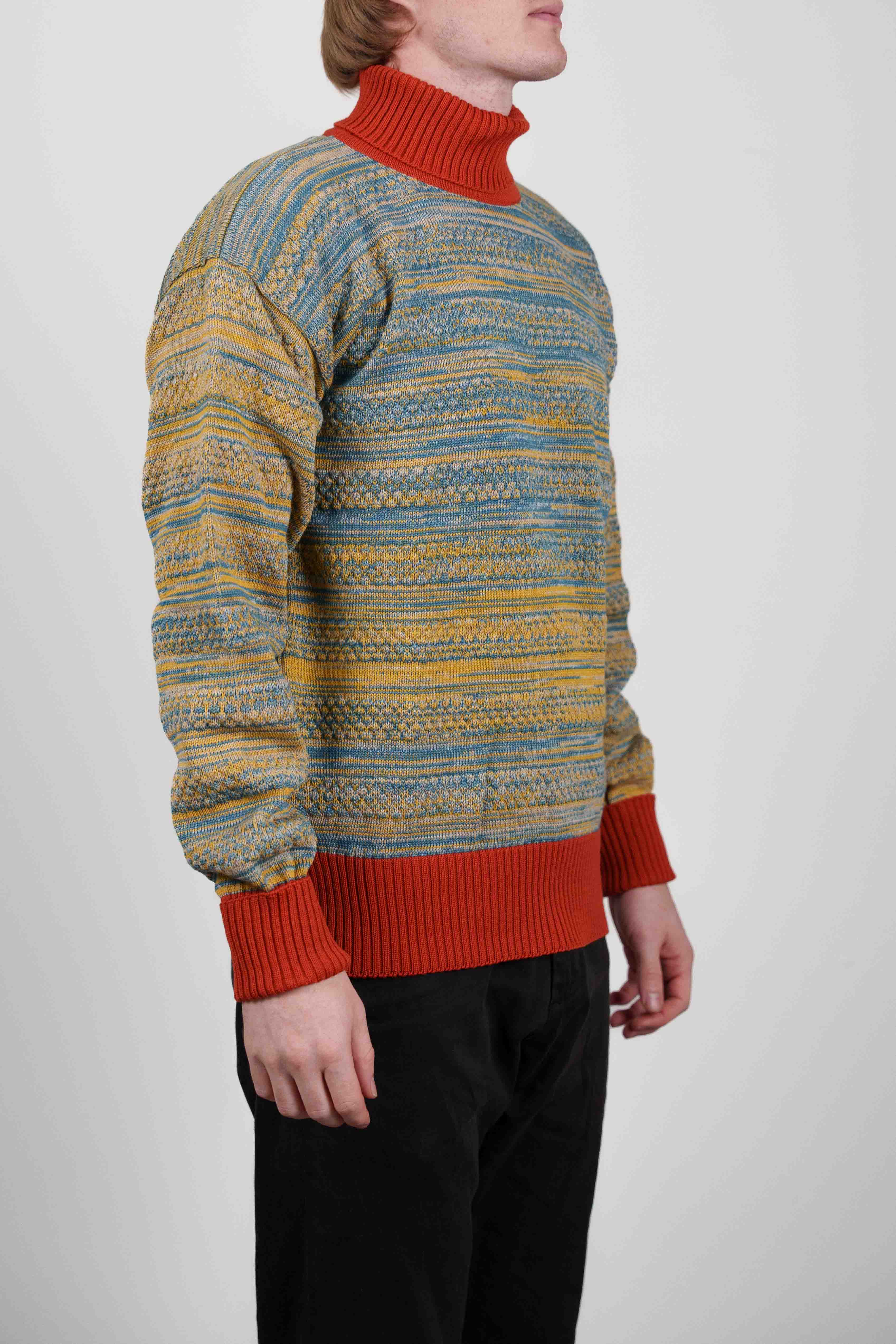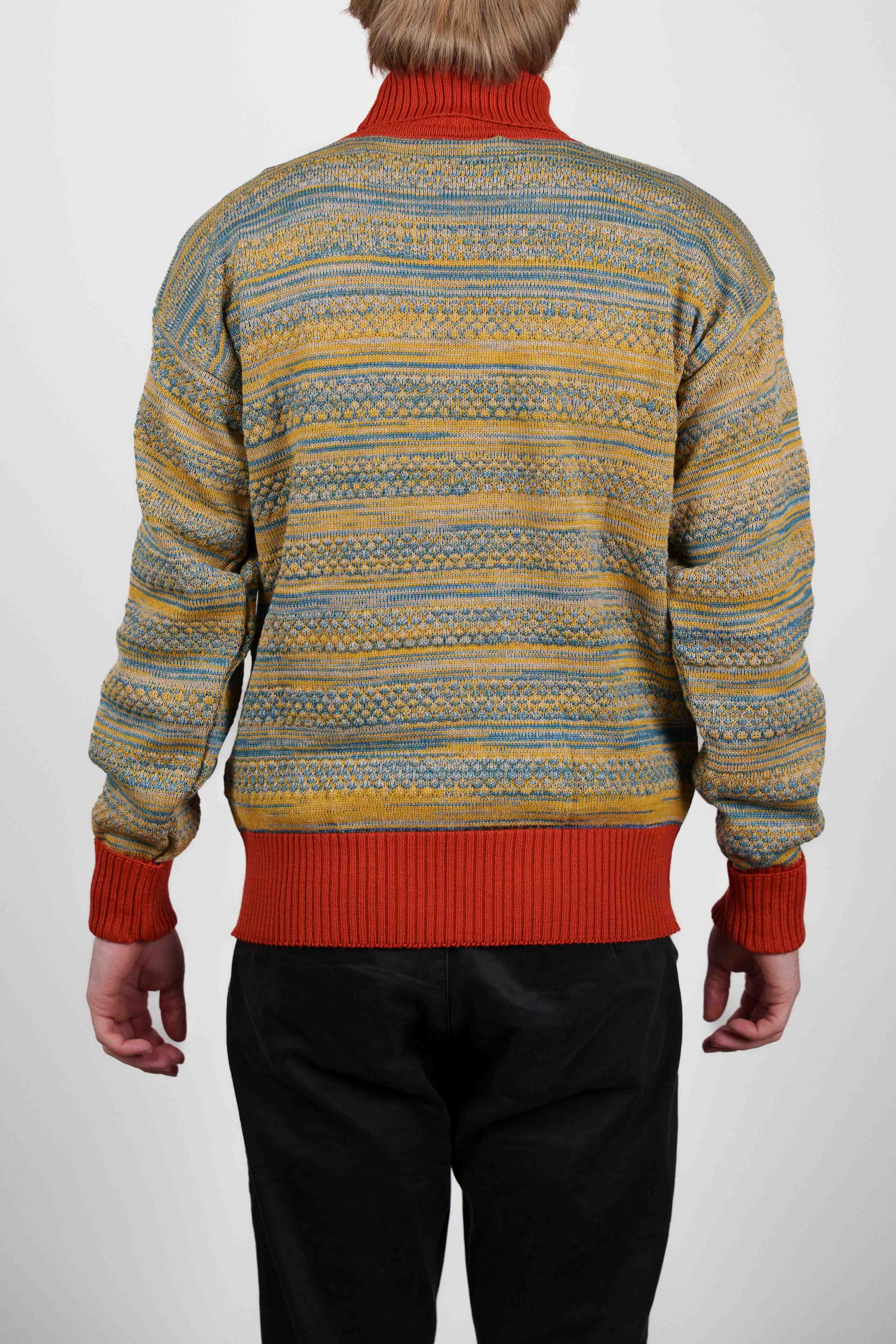 Ribstrikket, ensfarvet rød / orange krave, manchetter og kant giver en kontrastfuld accent.