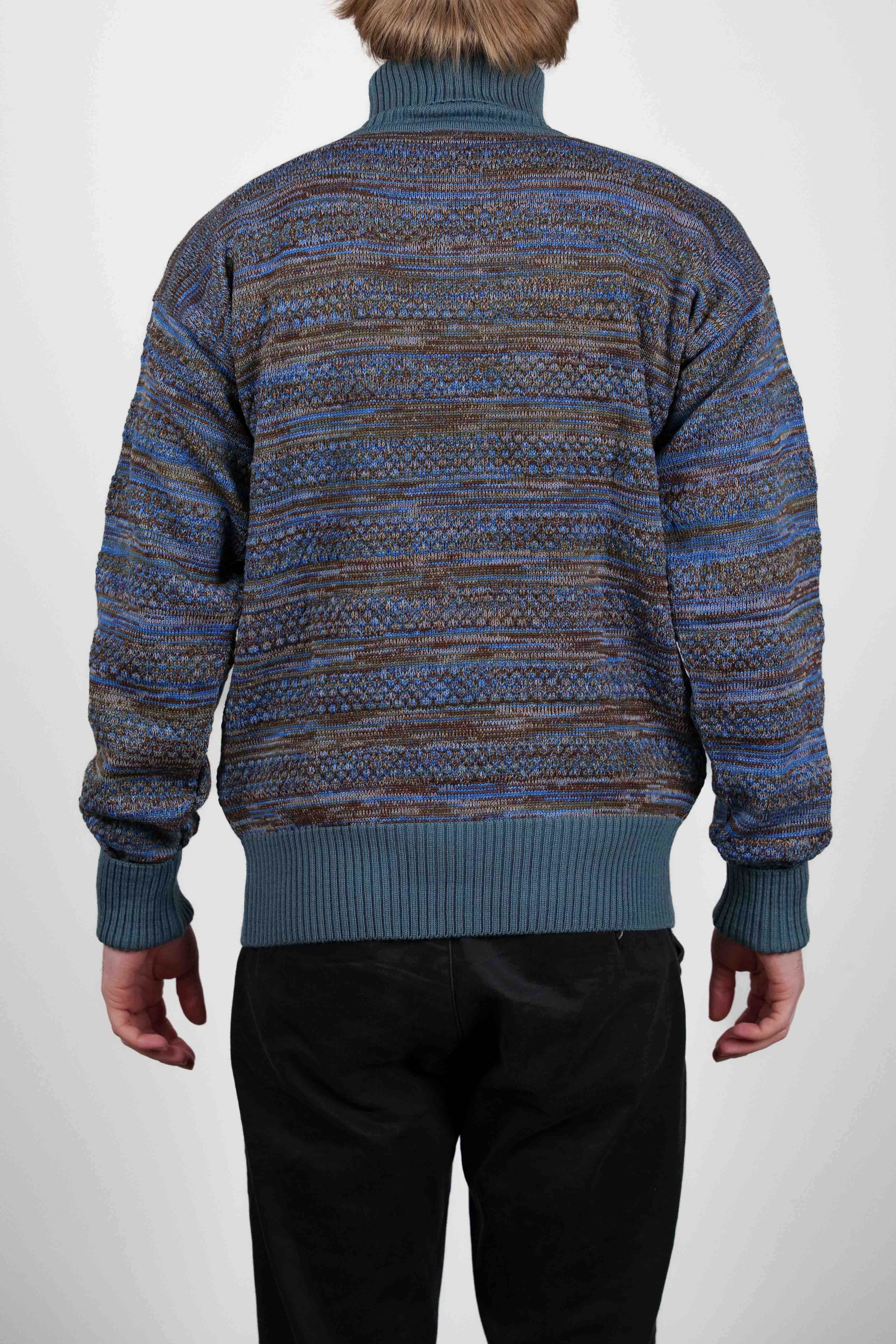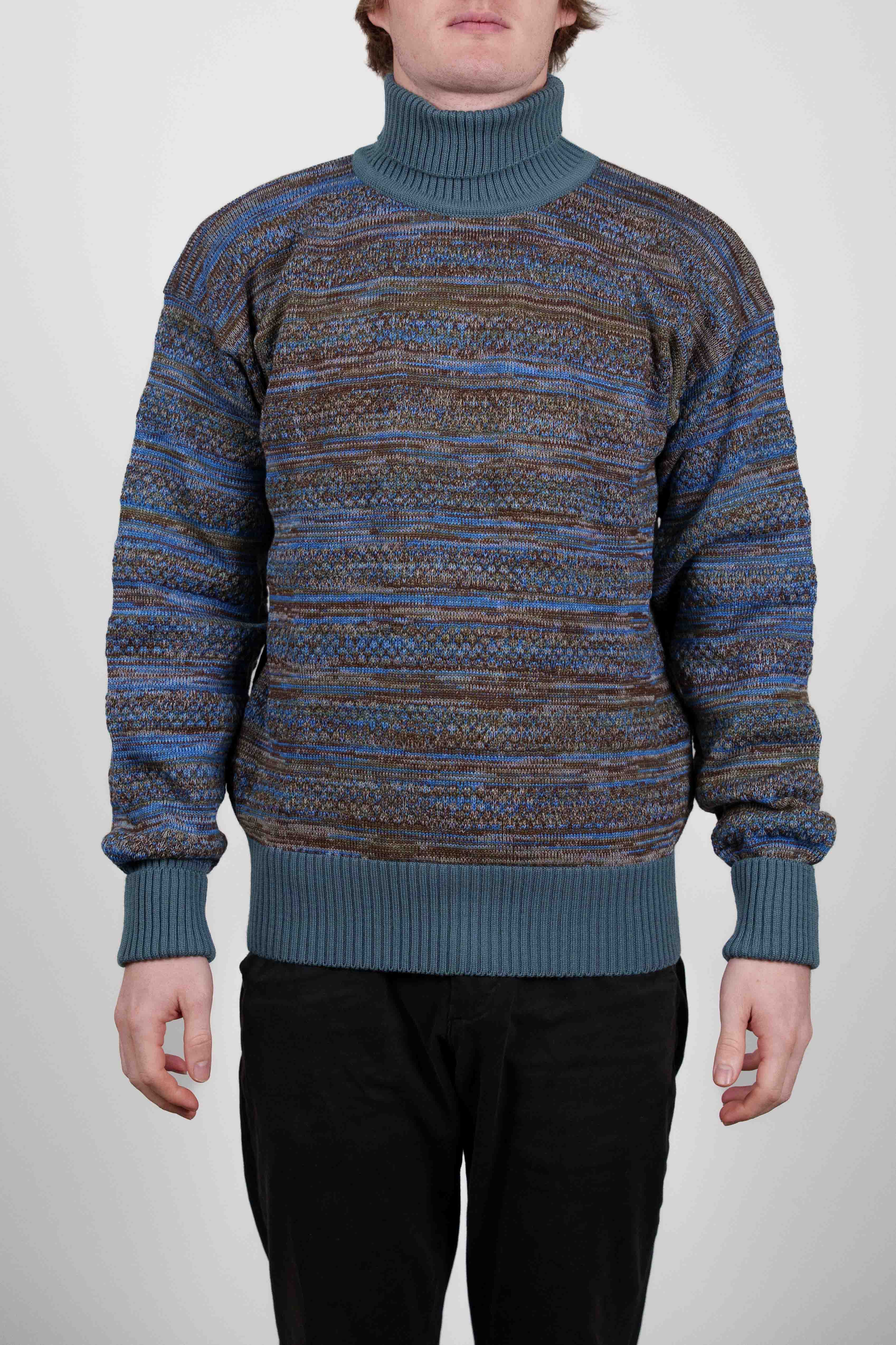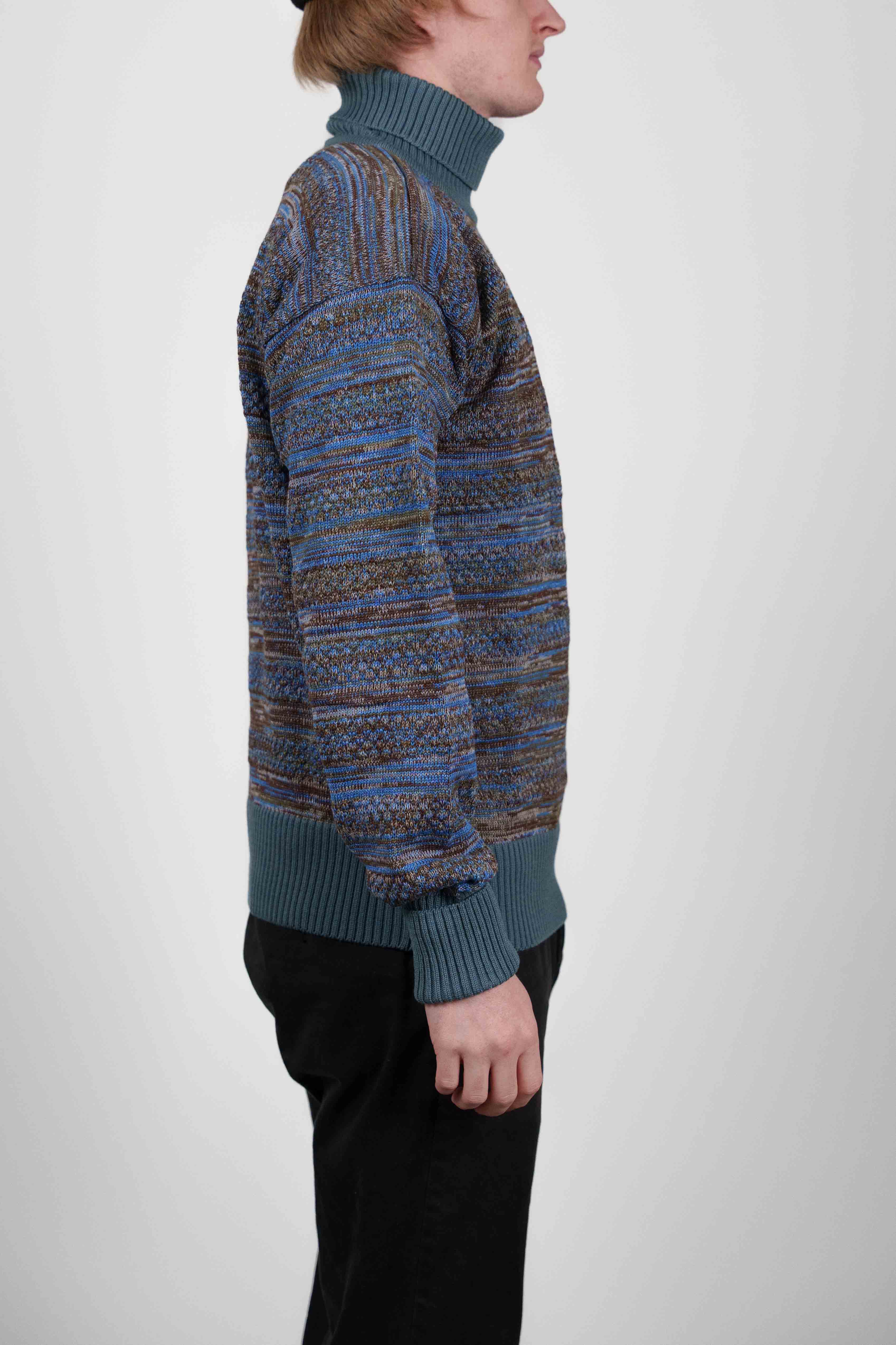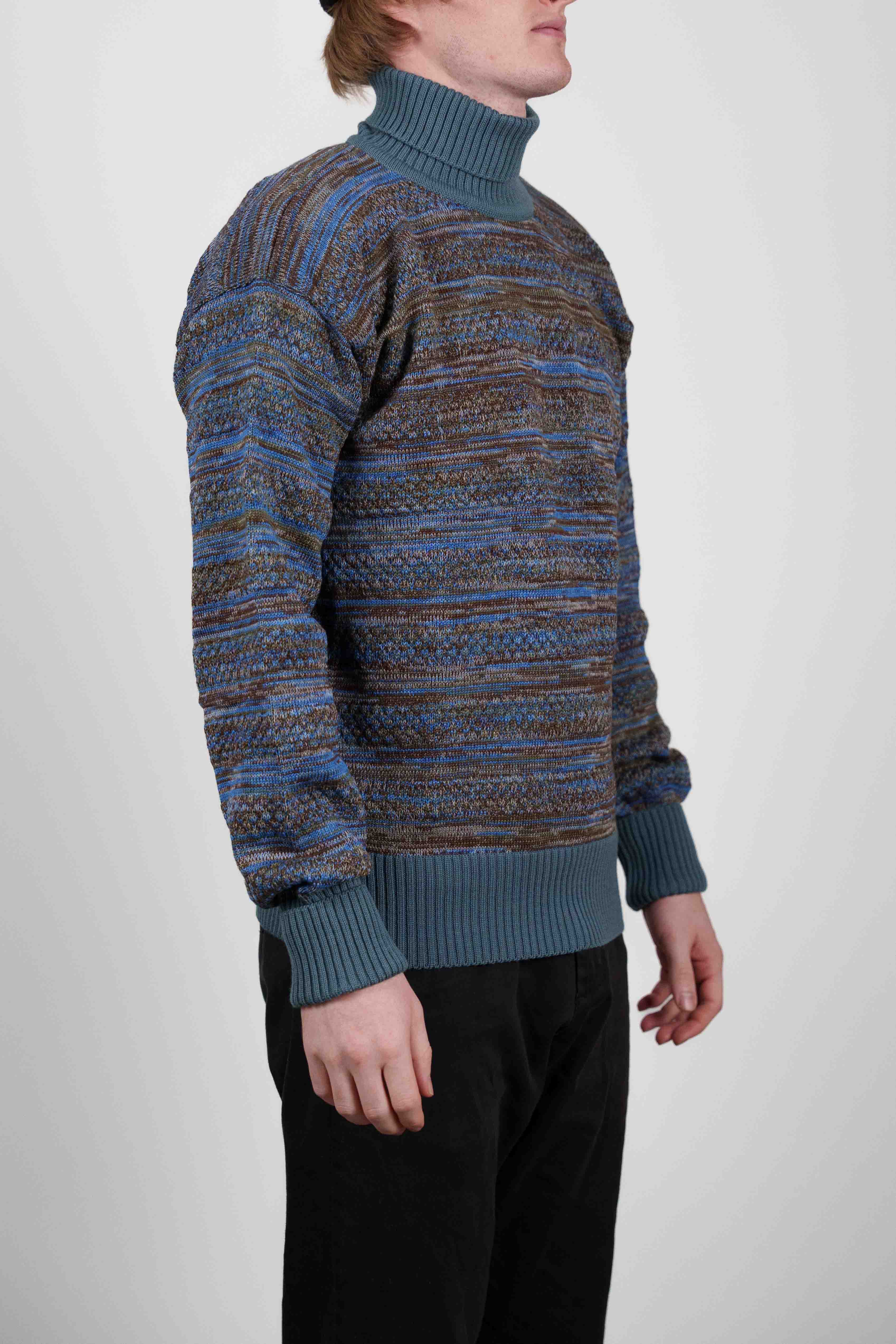Strikket rullekravetrøje fra W008-kollektionen med et varieret blå og brun stribet mønster. Den har en ribstrikket, ensfarvet turkis krave, manchetter og søm.