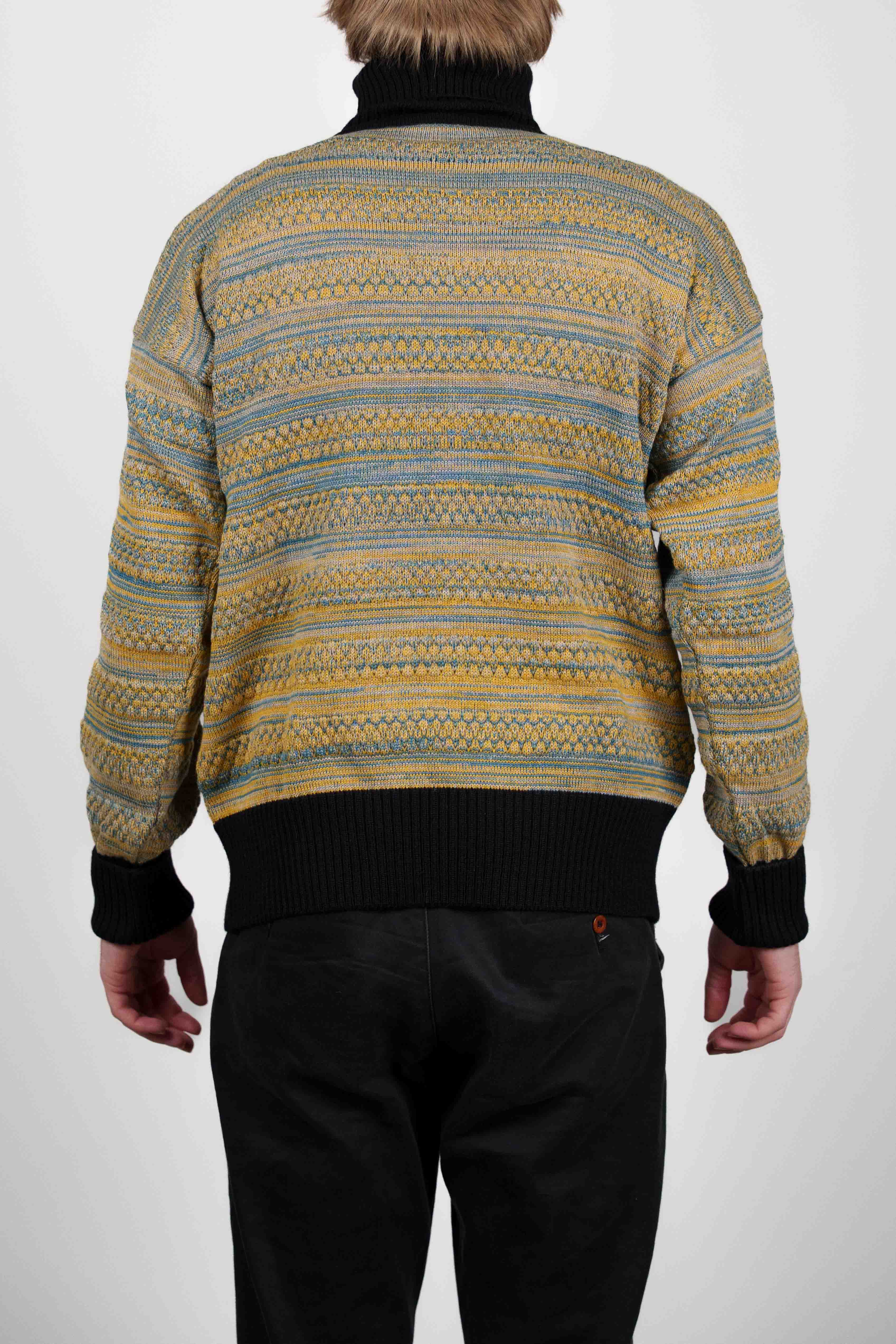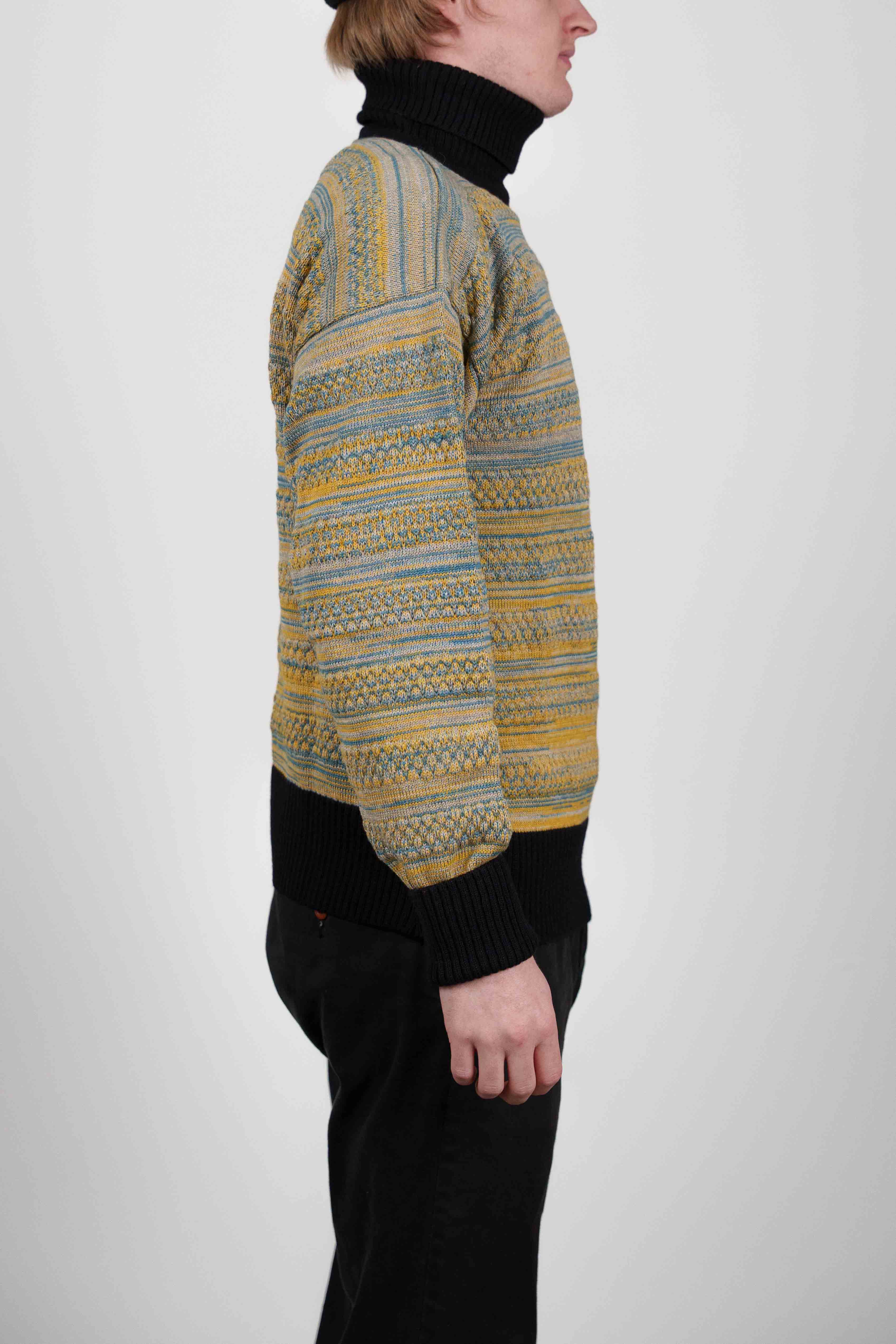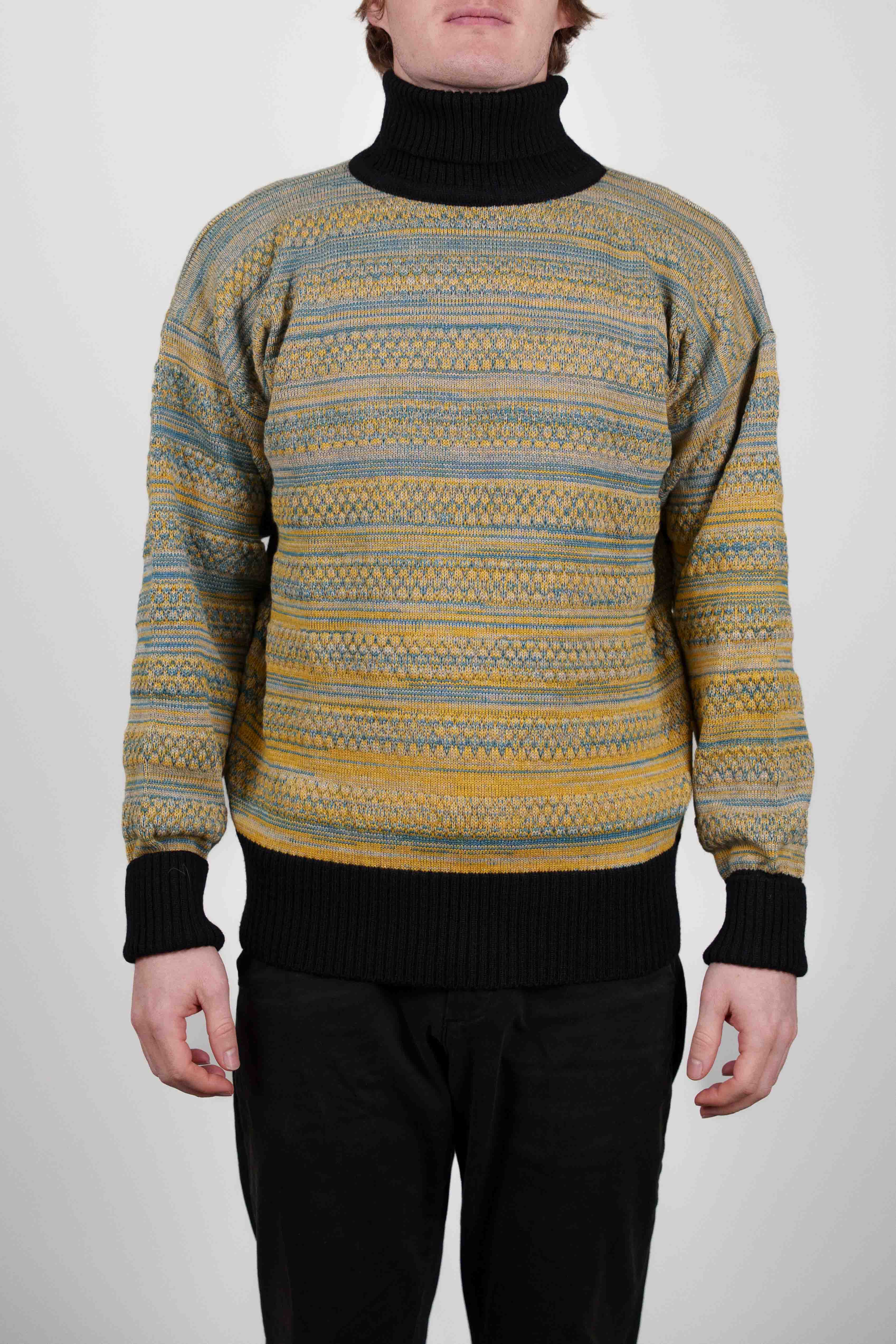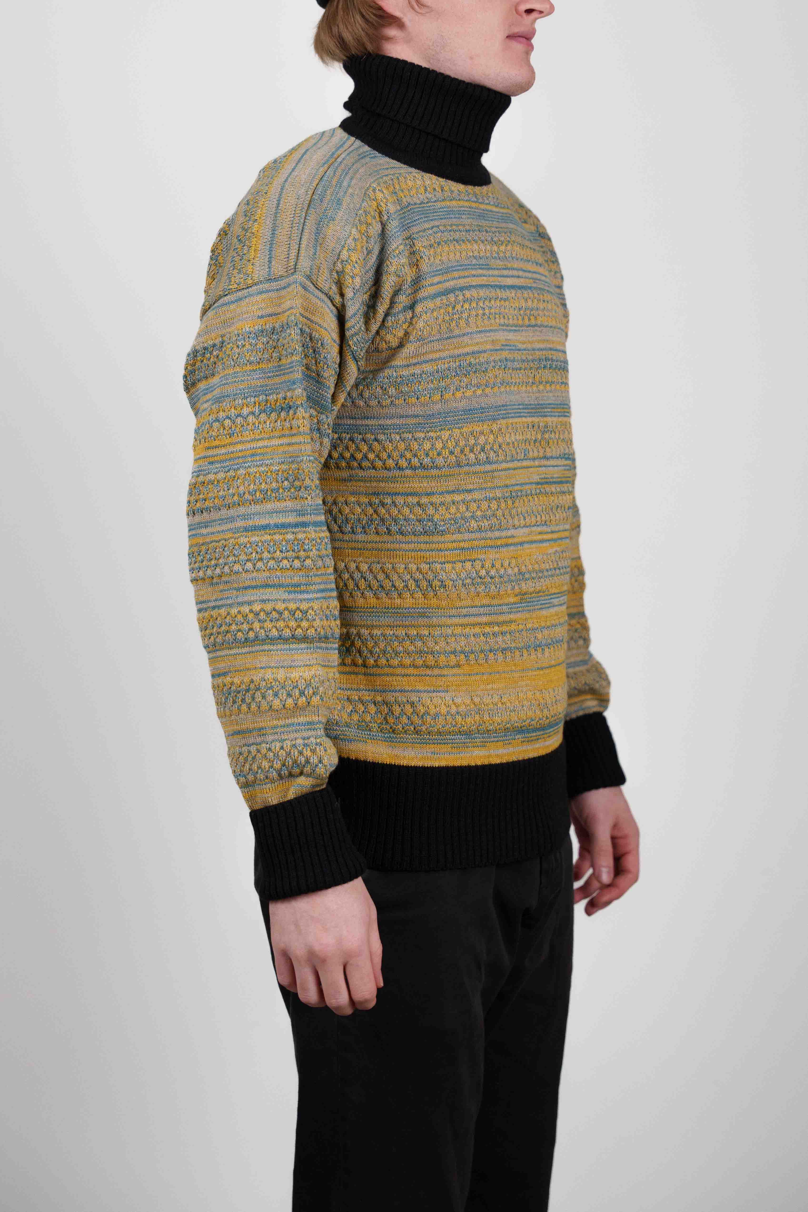 Højhalset sweater fra vores W008-kollektion med et komplekst strikmønster af horisontale striber og geometriske former i sennepsgul og blågrøn.