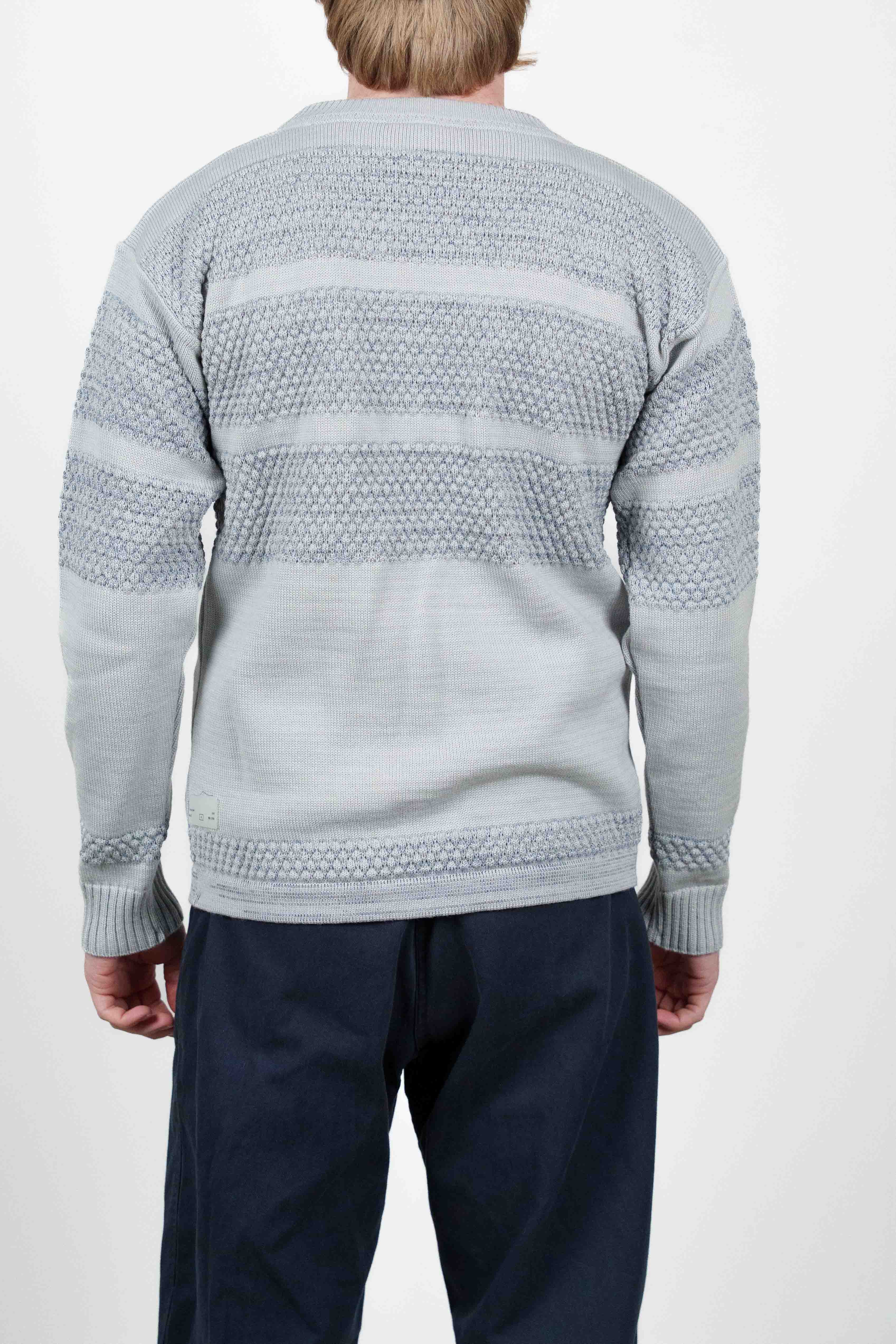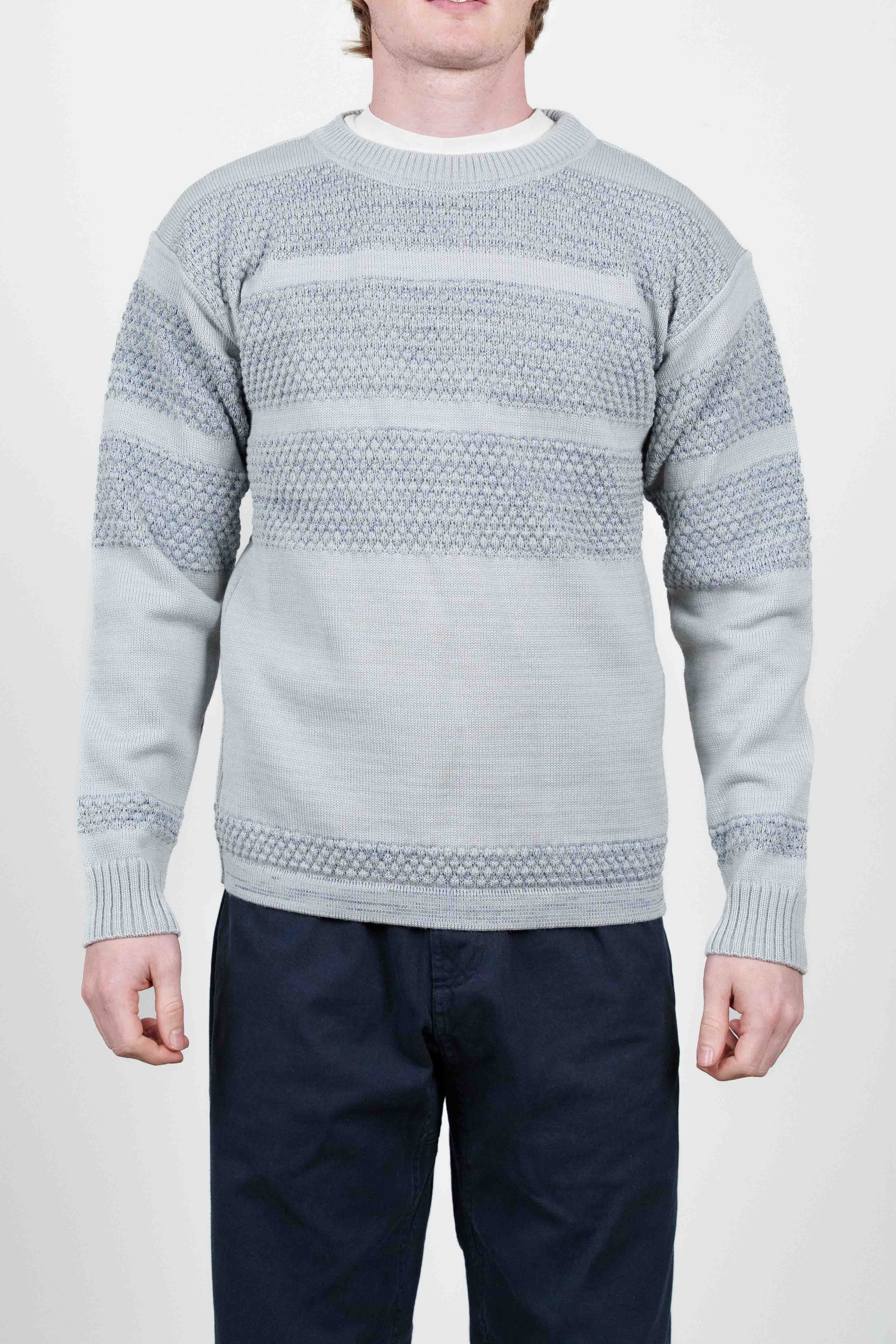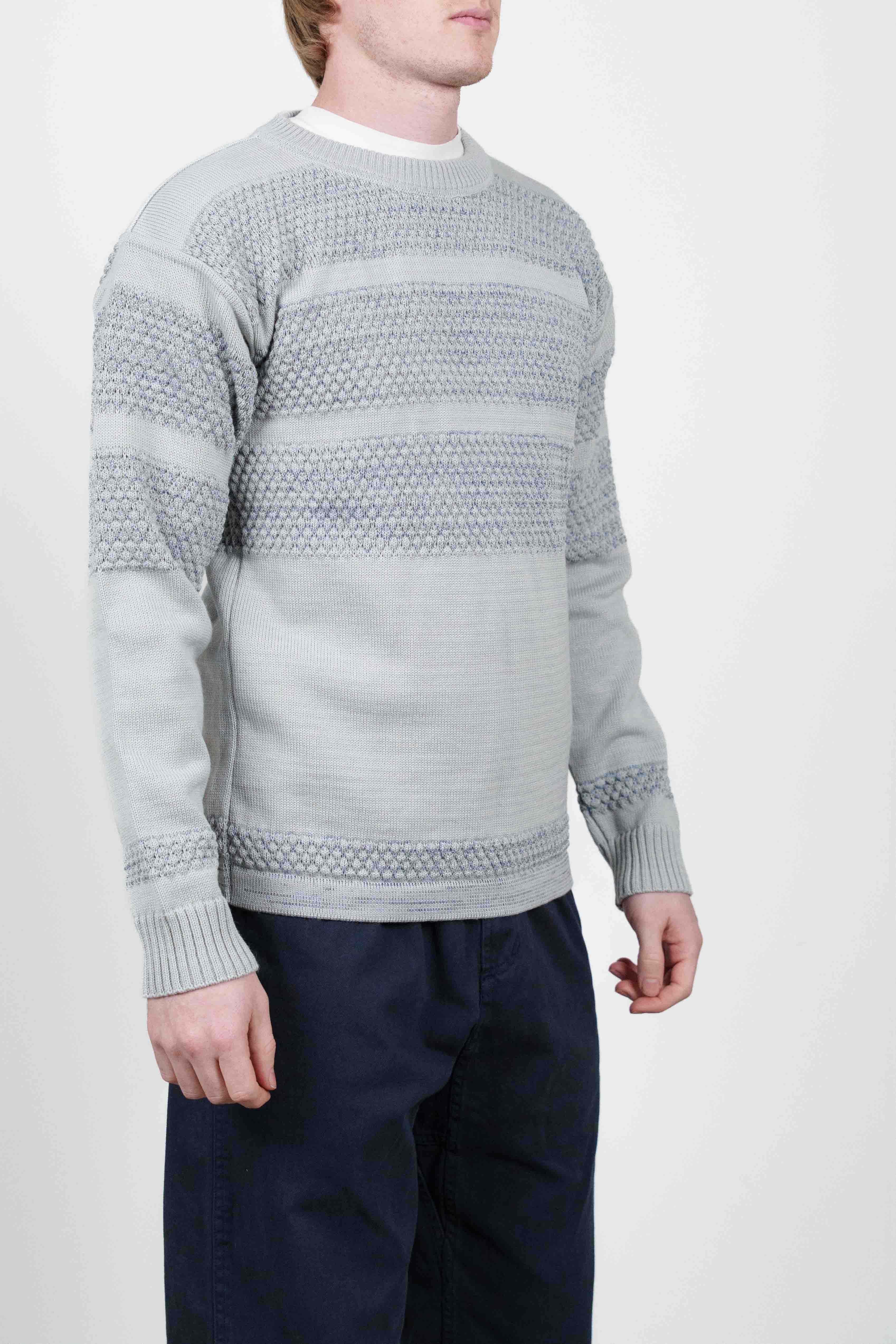 Lyseblå crew neck sweater fra W014-kollektionen med en flot tekstureret strik. Sweateren har horisontale bånd af mønsterstrik, der veksler med glattere strikkede sektioner, og afsluttes med ribkanter ved ærmer og forneden.