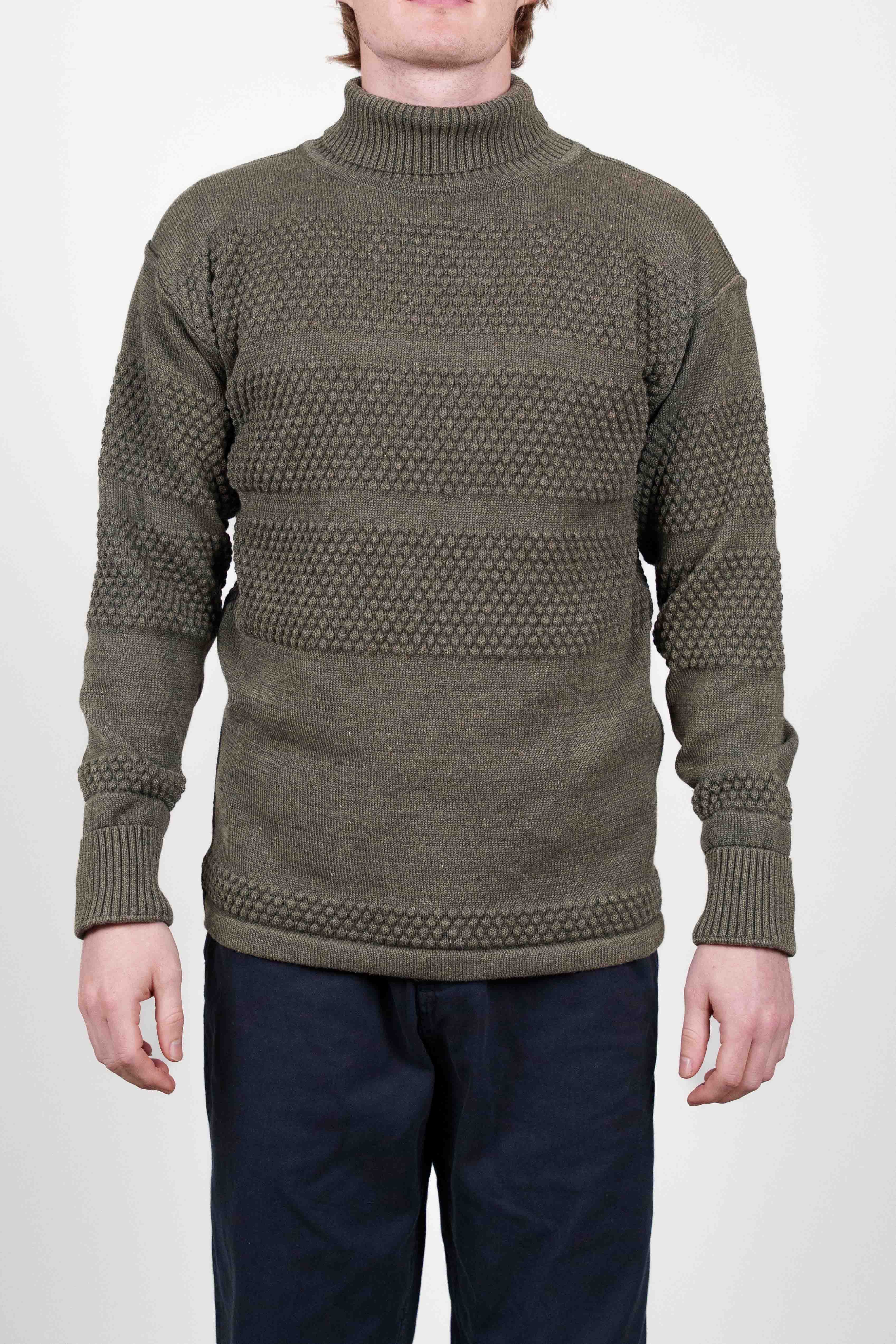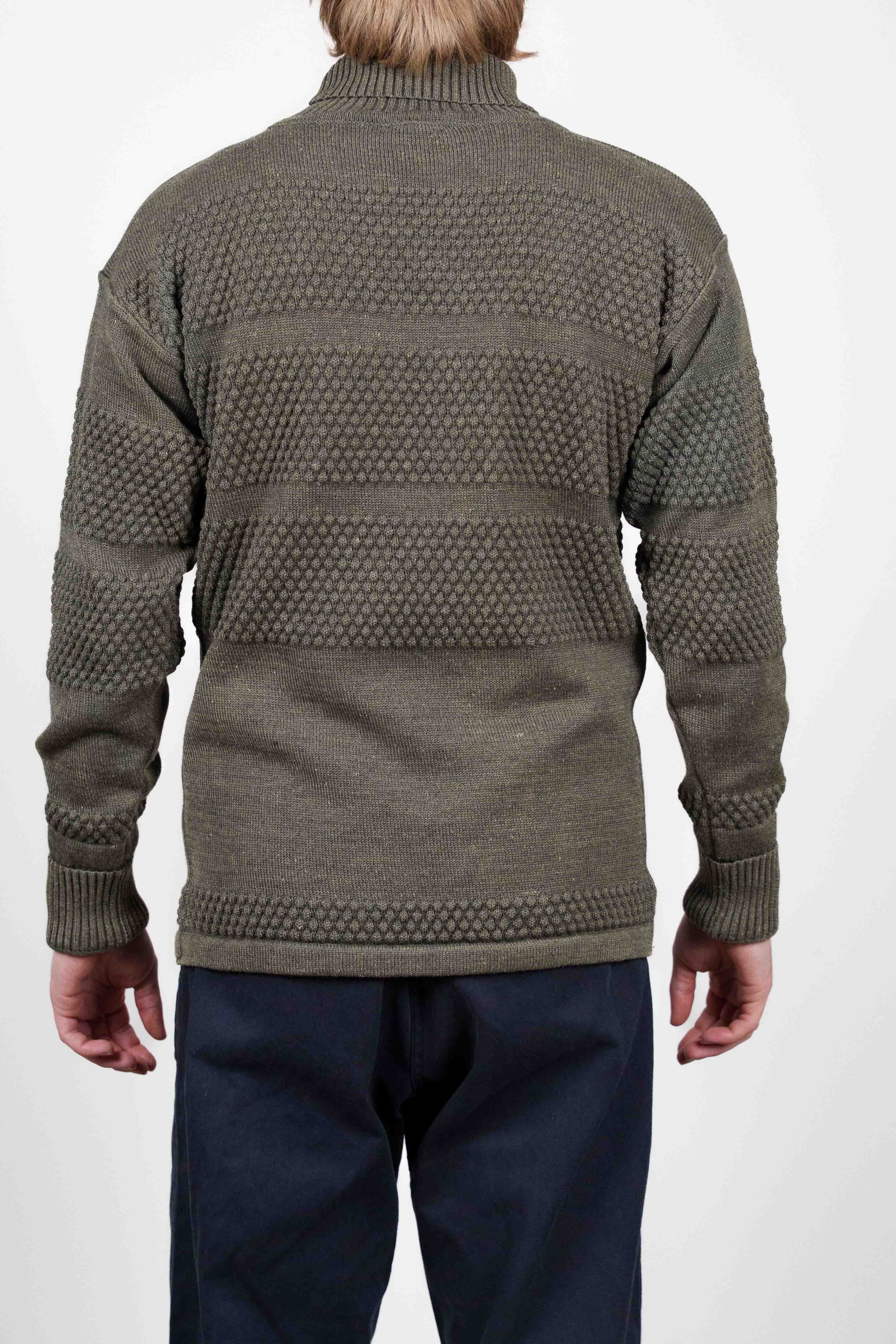 Mørk olivengrøn højhalset sweater fra W023-kollektionen med vandrette bånd af tekstureret boblestrikmønster på krop og ærmer. Har ribbet krave, manchetter og kant.