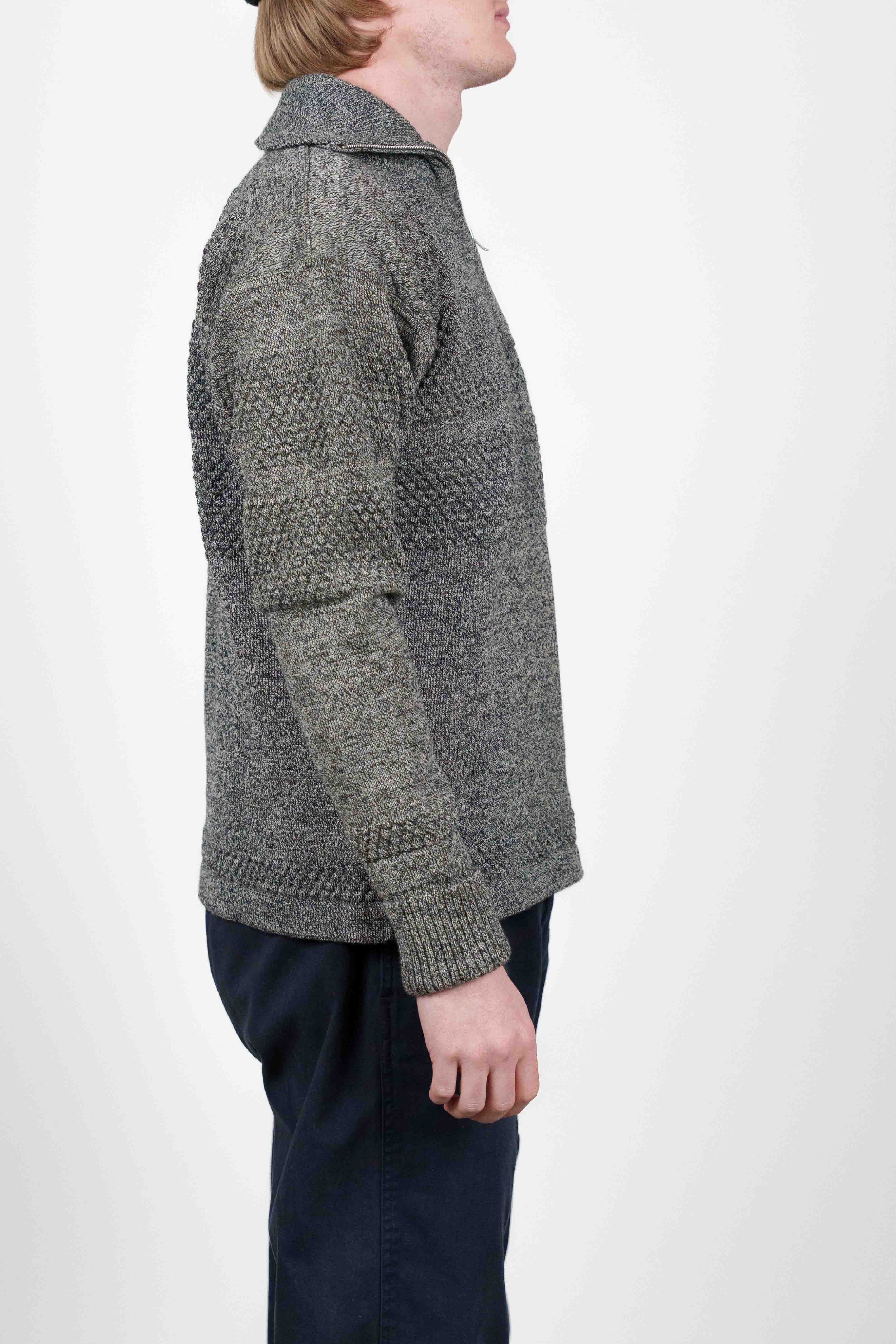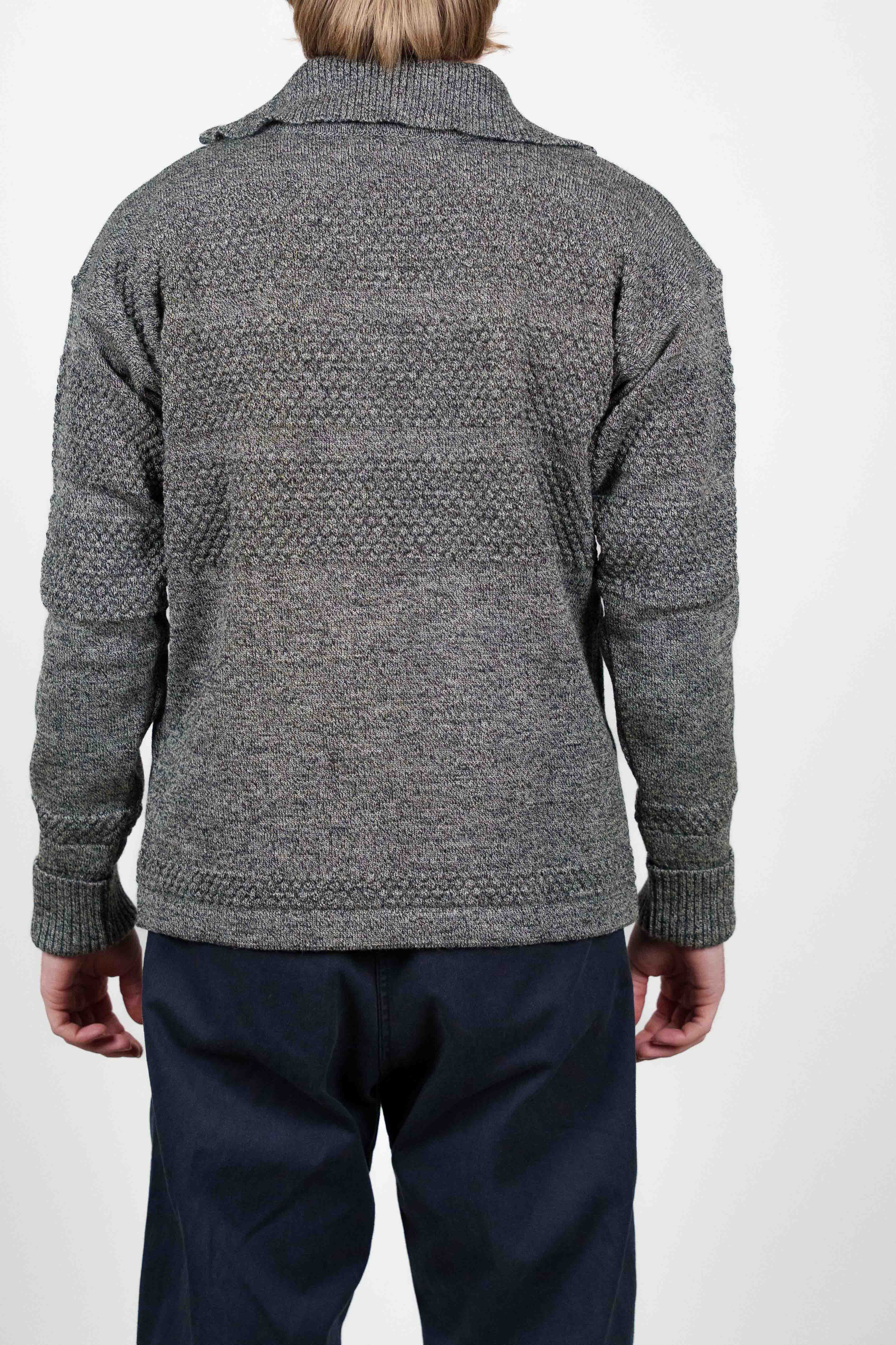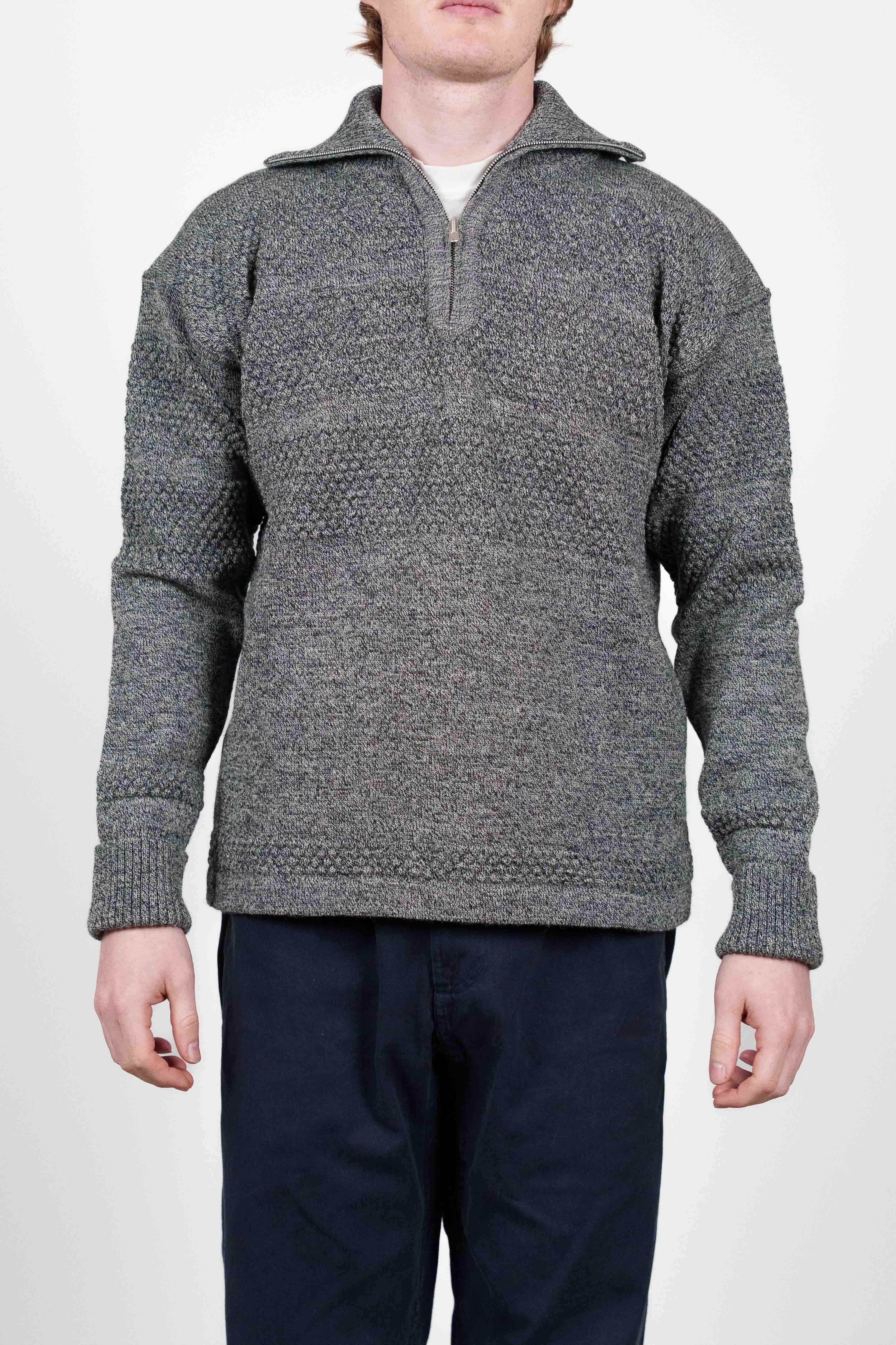 Gråmeleret half-zip sweater fra W023-kollektionen, med et raffineret, tekstureret strikmønster på ærmer og skuldre. Den er designet med ribkanter ved manchetter og forneden samt en opretstående krave med metallynlås, som er ideel til at holde på varmen.