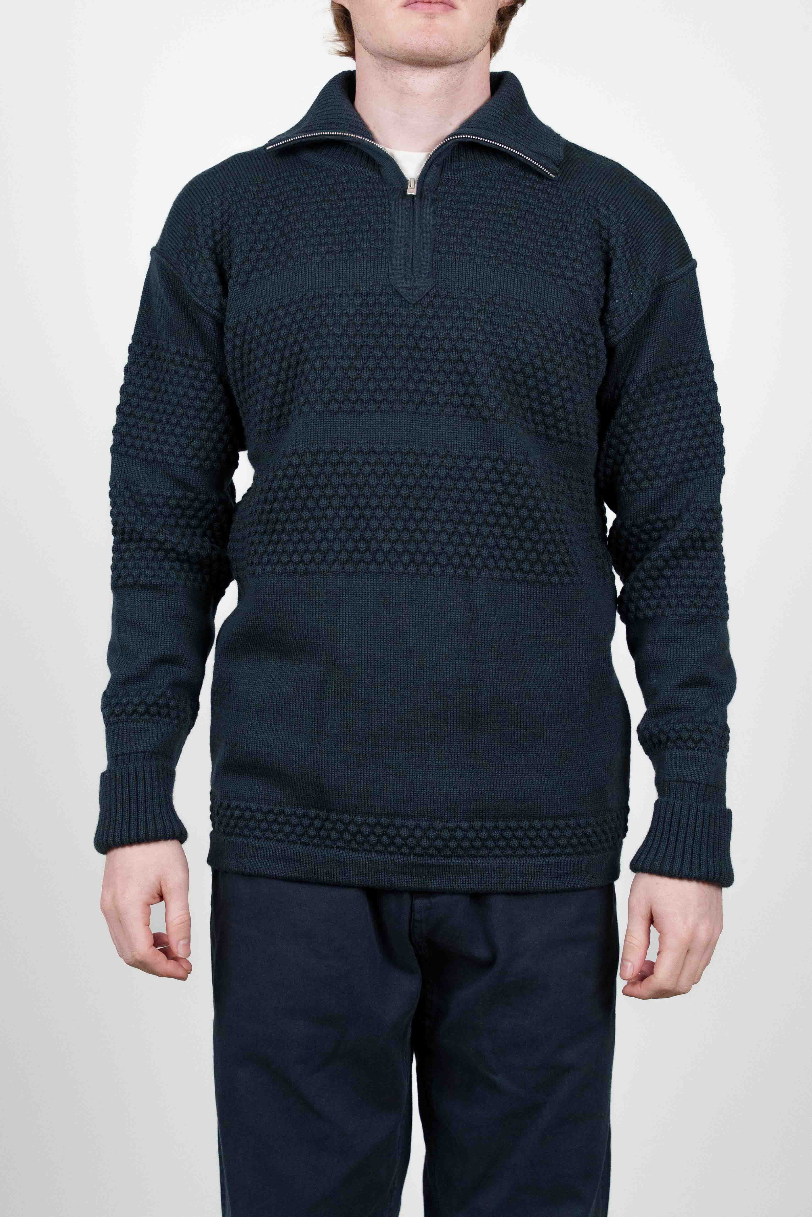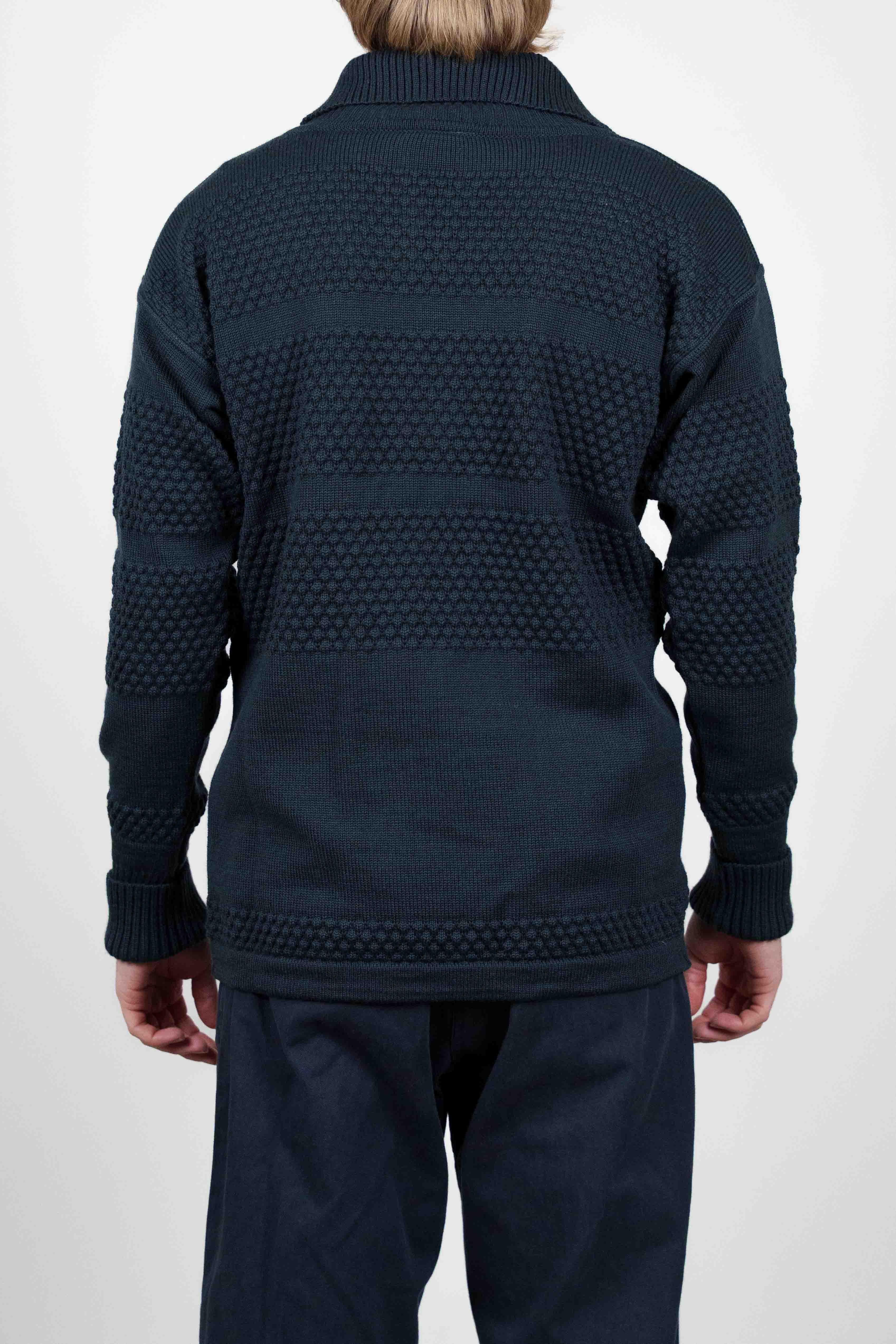 Den har et markant, tekstureret boblestrikmønster arrangeret i horisontale bånd på tværs af krop og ærmer, komplementeret af ribkanter ved manchetter og forneden. En varm og komfortabel strik, perfekt til de koldere måneder.