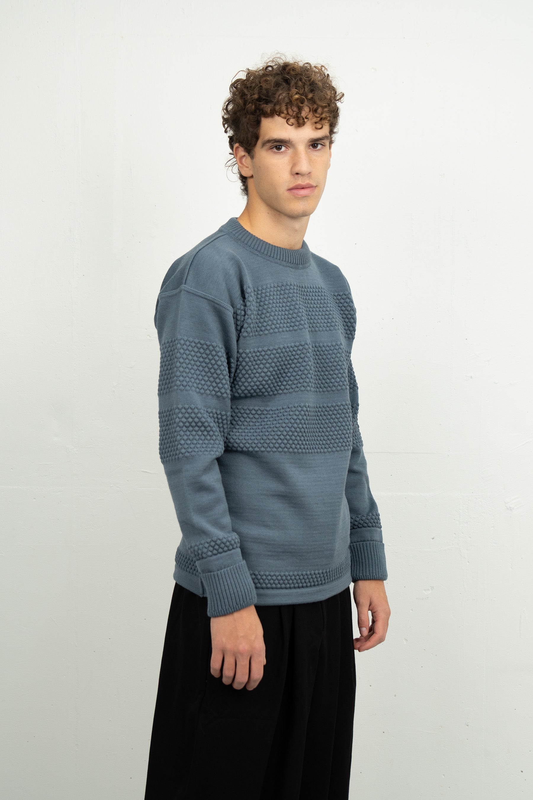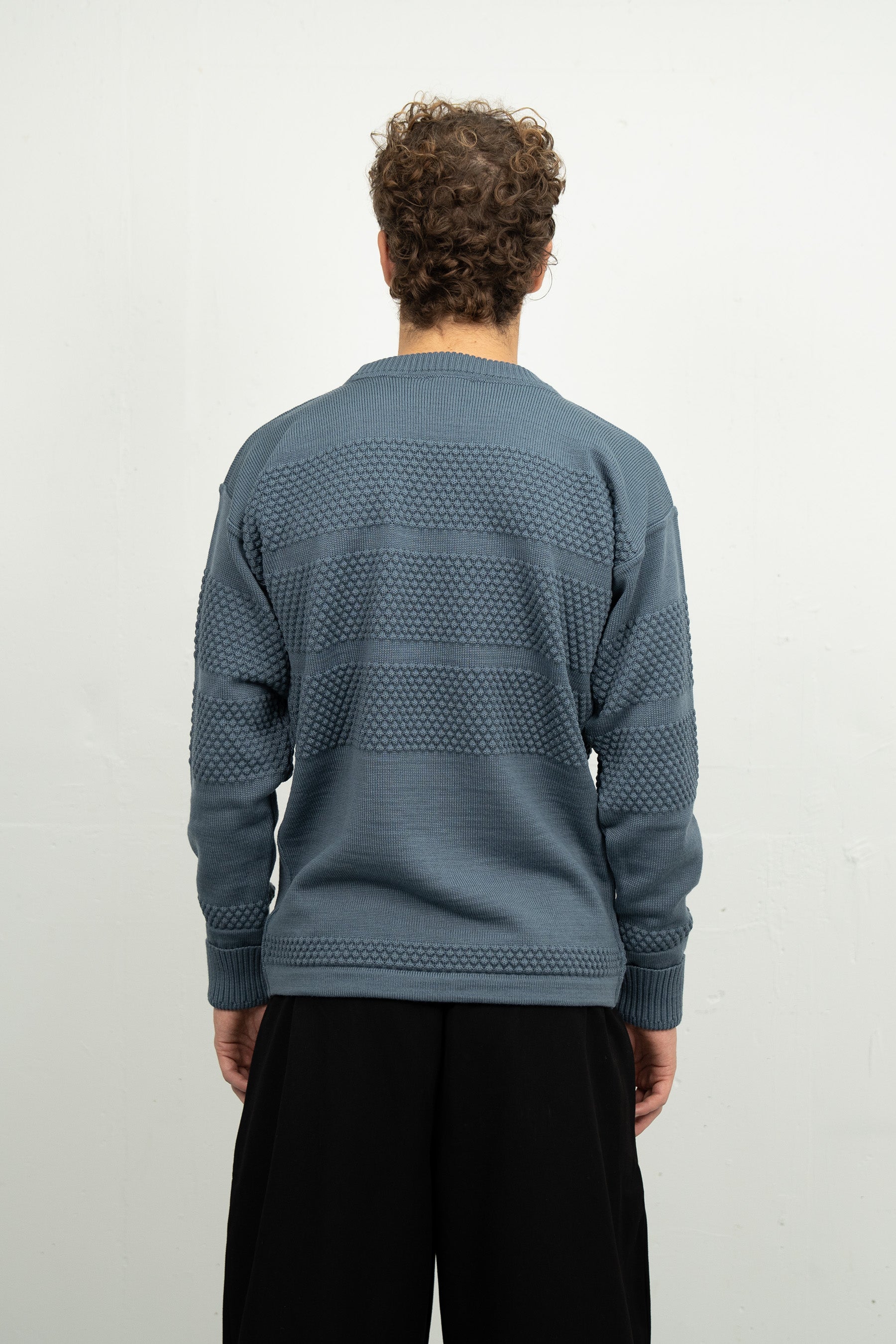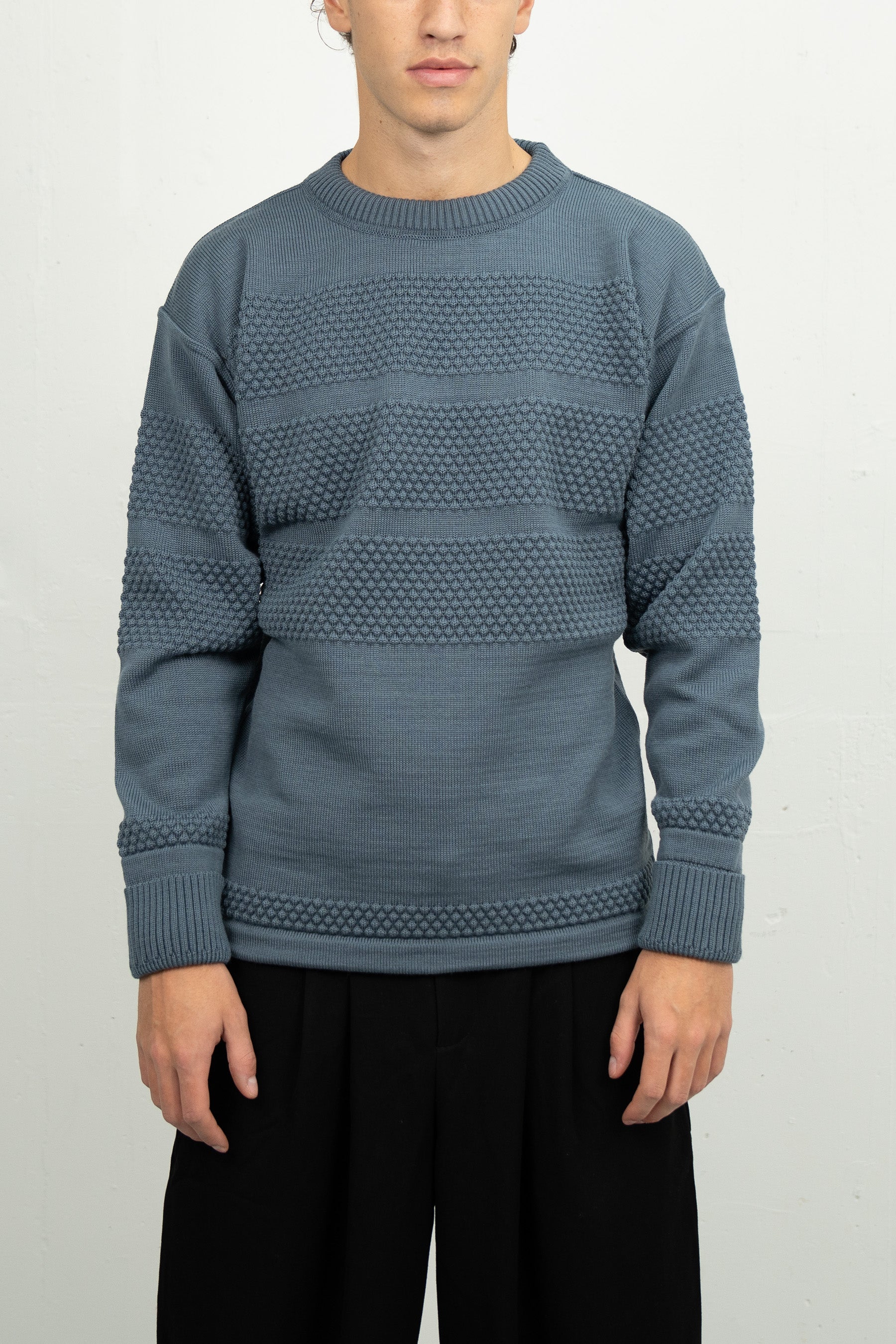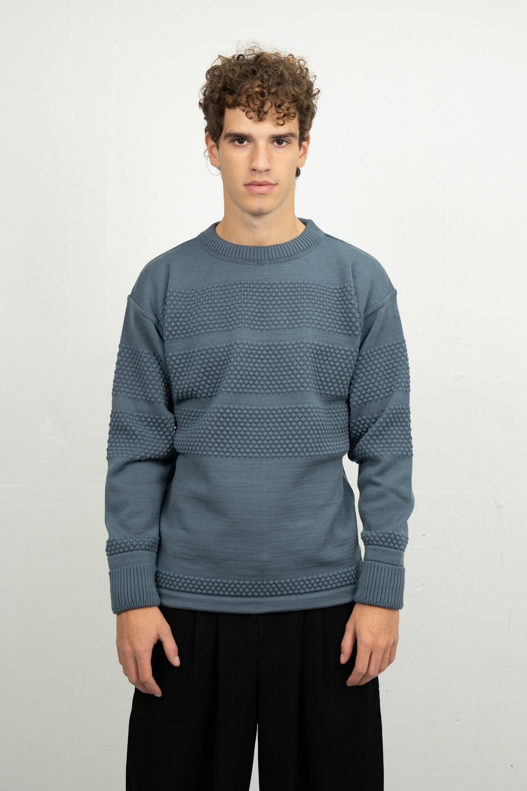 Sømandstrøje i rund hals. Mønster 1919. I produktion siden 1930. Vinklede ærmer reducerer garnspild og skaber vores karakteristiske dropped shoulder. Boblestrikkede felter blandet med glatstrik. Yderside i robust sømandsuld. Inderside i ekstra fin merino.