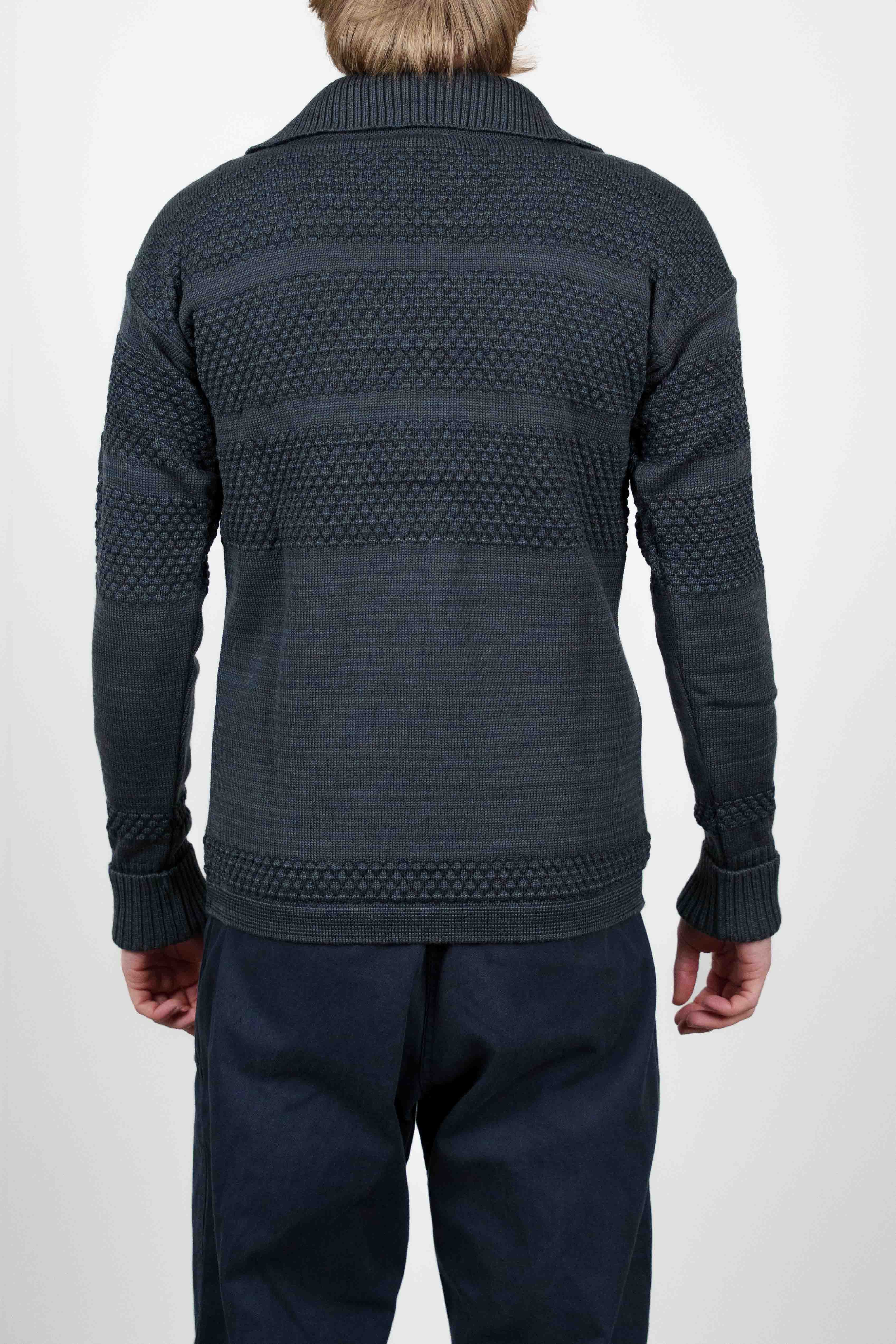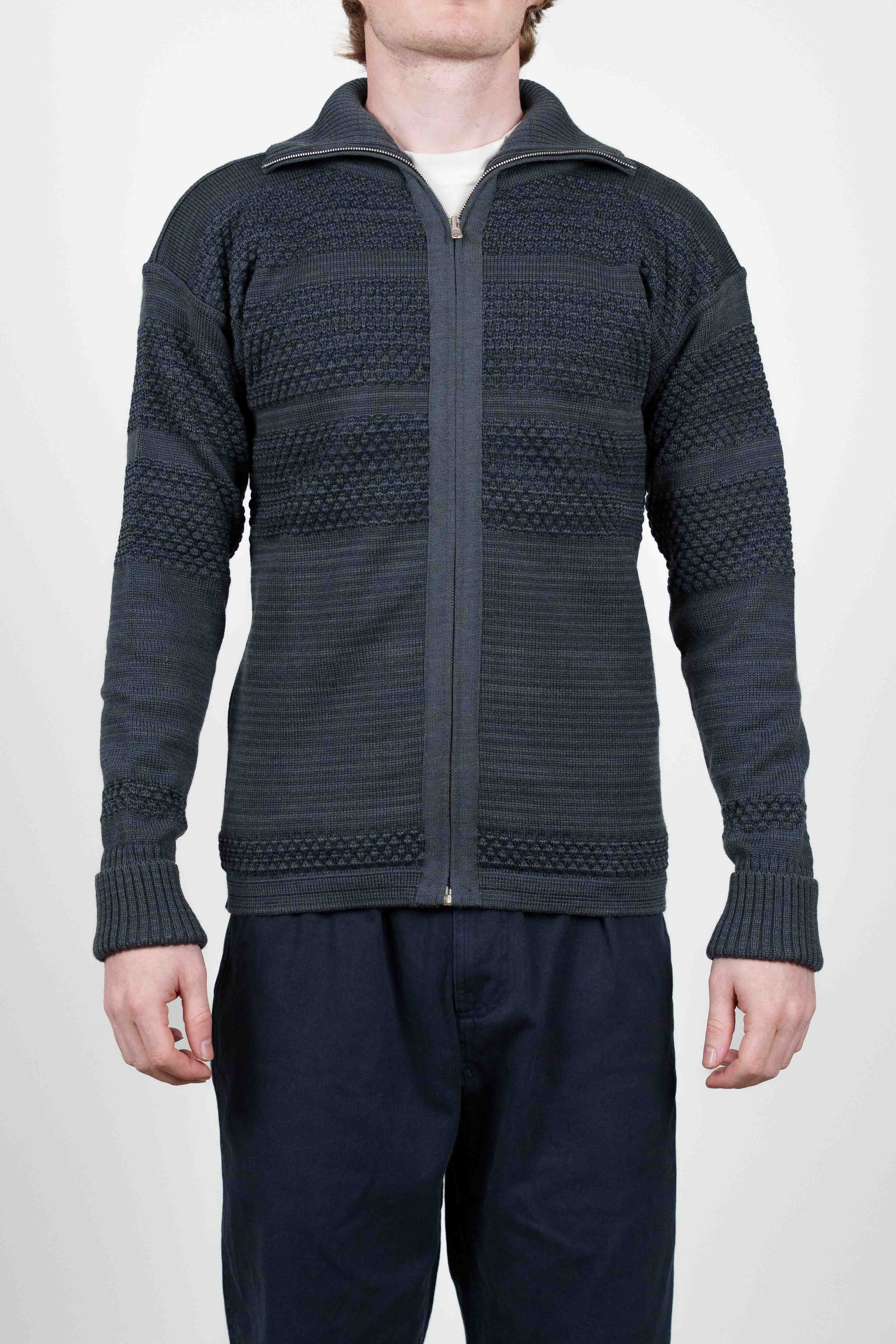Mørkeblå full-zip sweater fra W017-kollektionen med varierede strikkede teksturer, herunder vandrette bånd af rib- og boble-lignende strukturstrik. Den har en ribbet krave og manchetter samt en lynlåsstolpe.