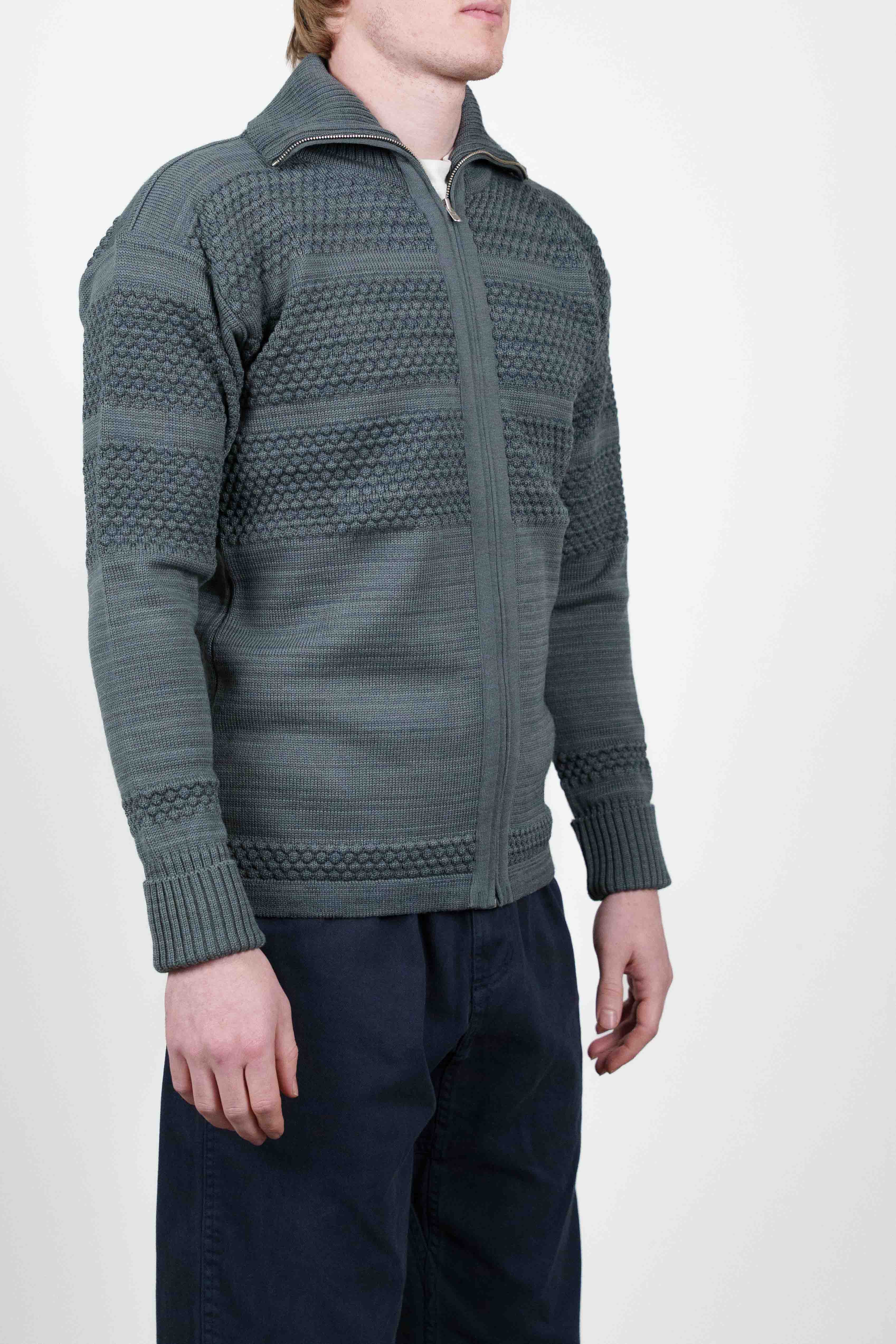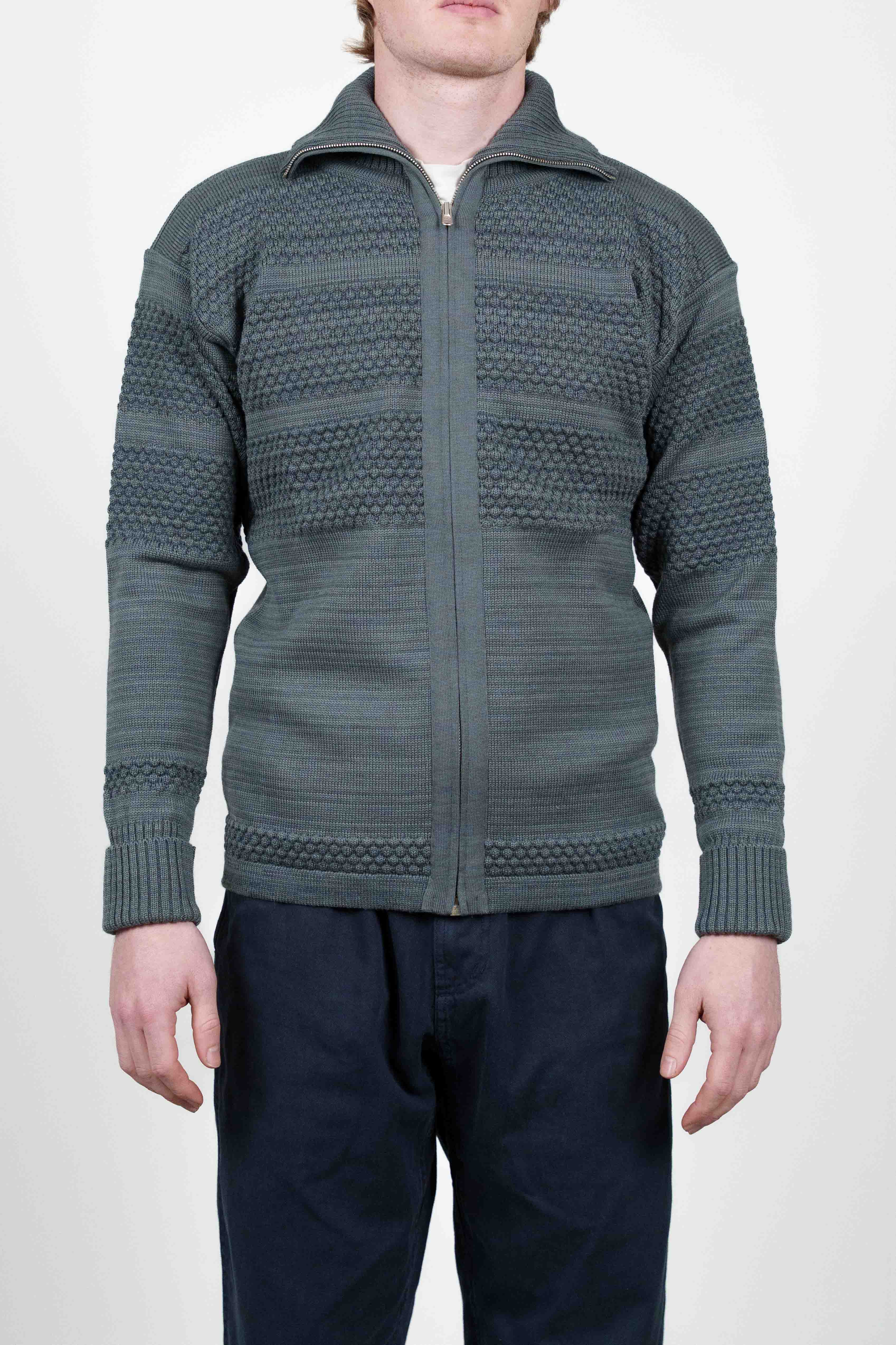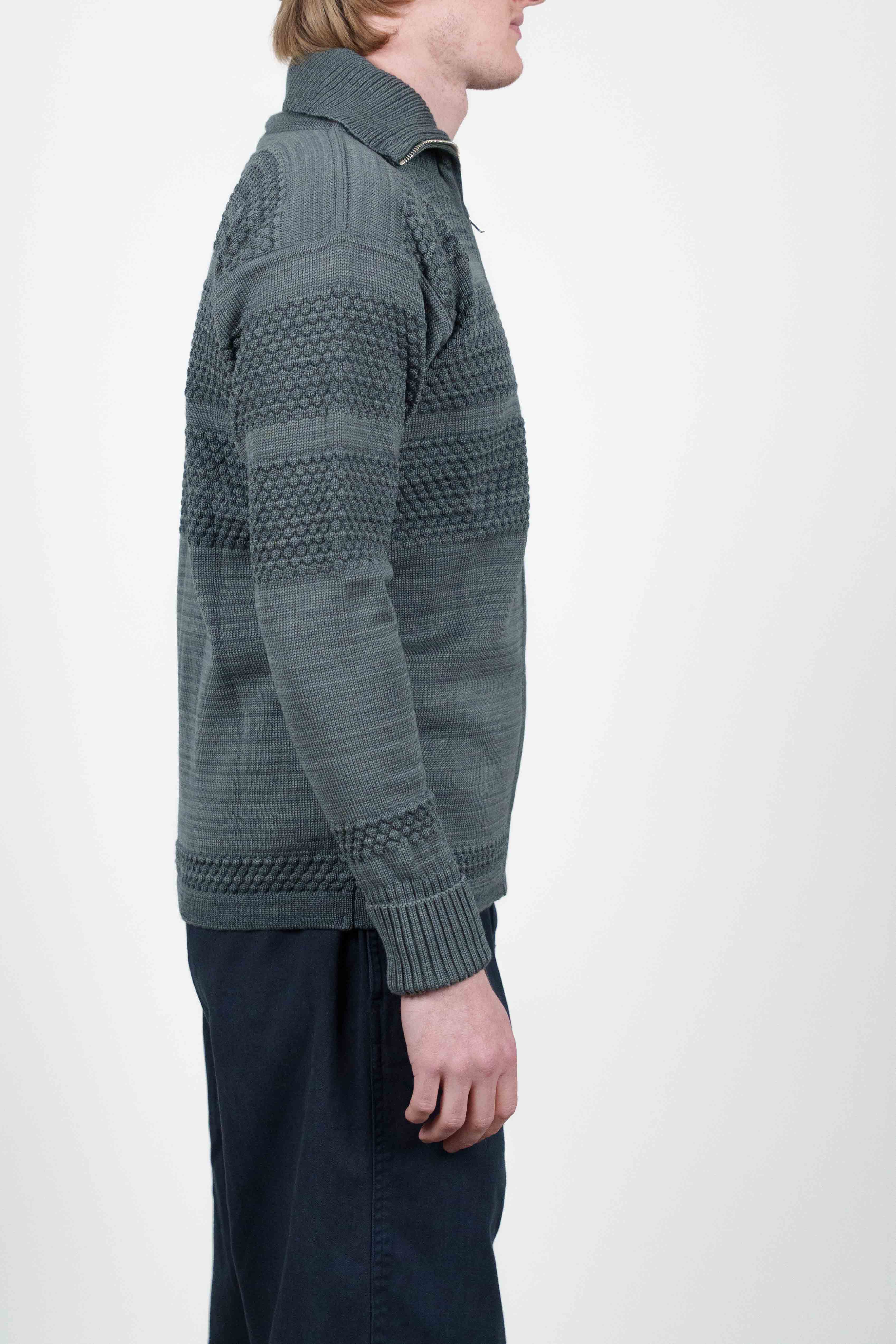 Dæmpet mørkegrøn striktrøje med lynlås fra W014-kollektionen, med ribbet krave og manchetter.