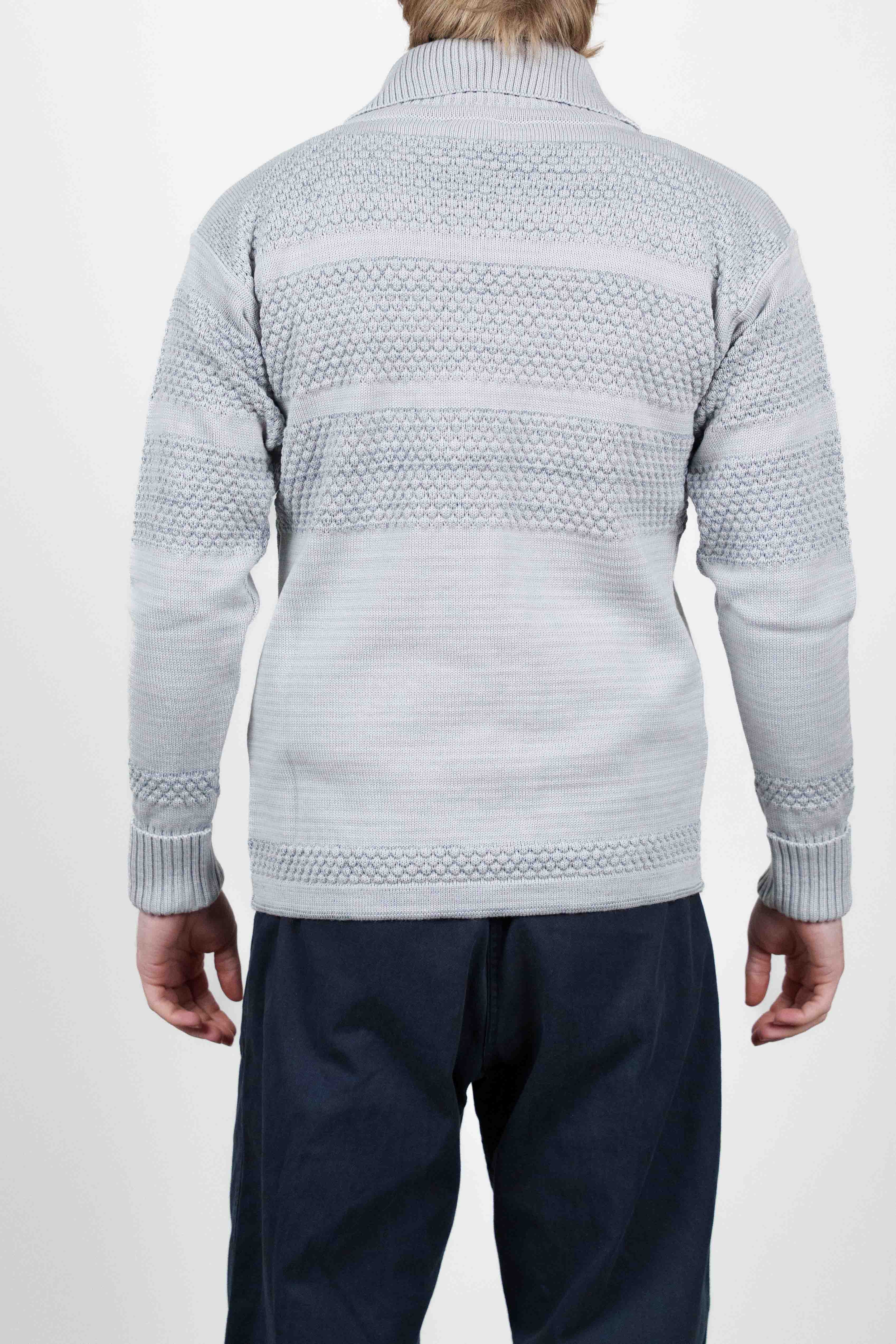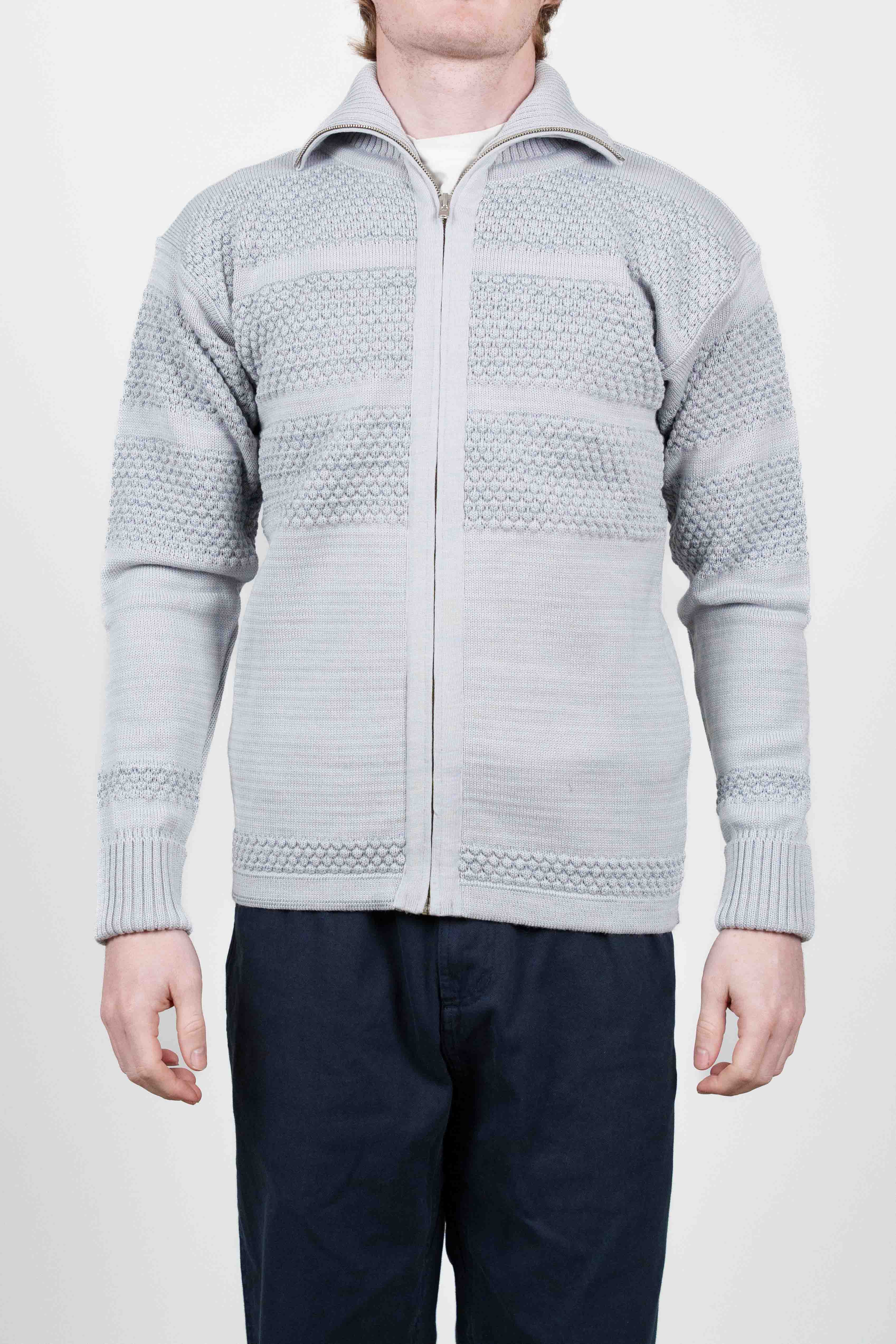 Lysegrå full-zip sweater med høj krave, designet med vekslende horisontale bånd af tekstureret boblestrik og glattere strikmønstre. Denne stil fra W014-kollektionen er afsluttet med ribstrikkede manchetter, kant og krave, hvilket sikrer en perfekt pasform og et sofistikeret look.