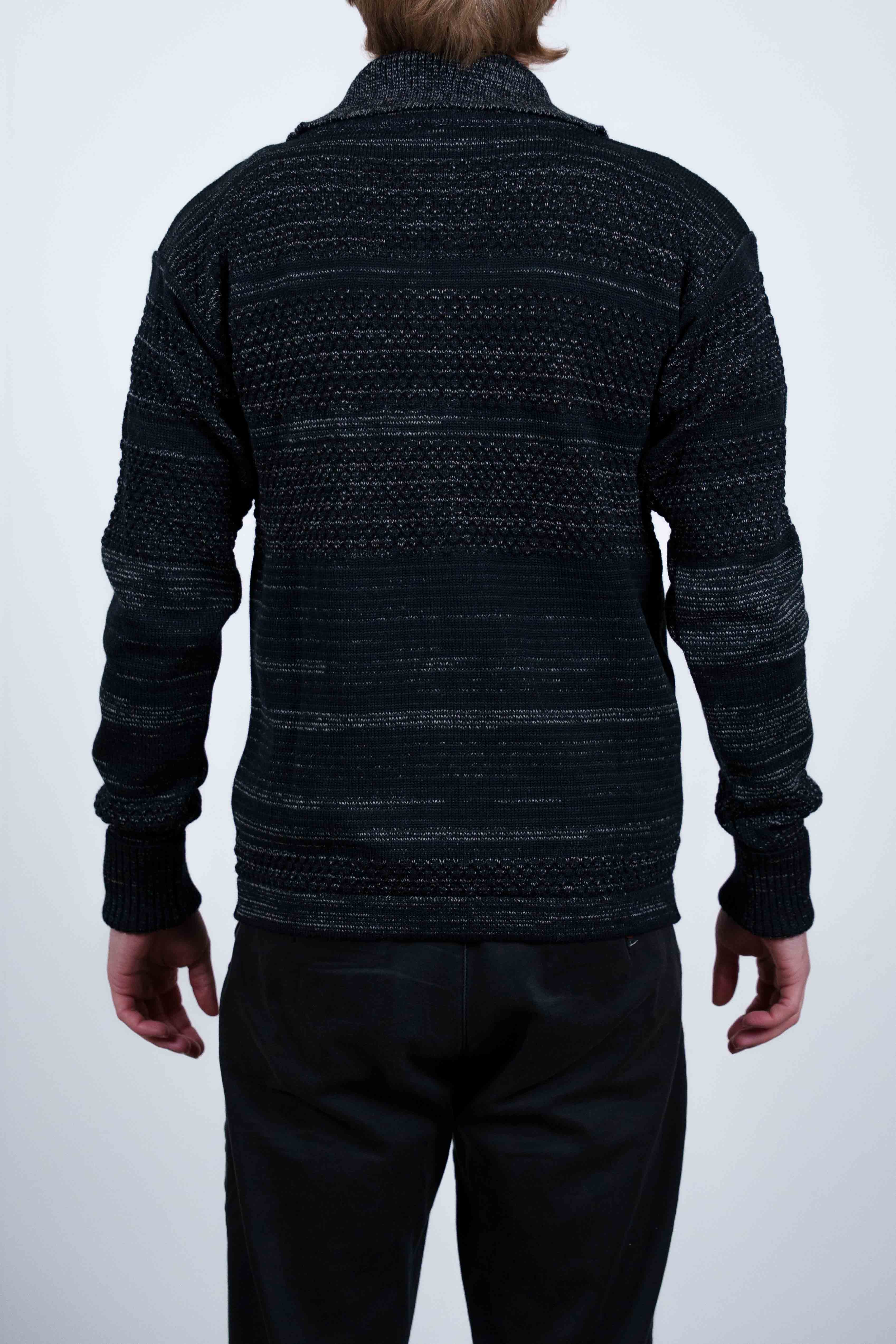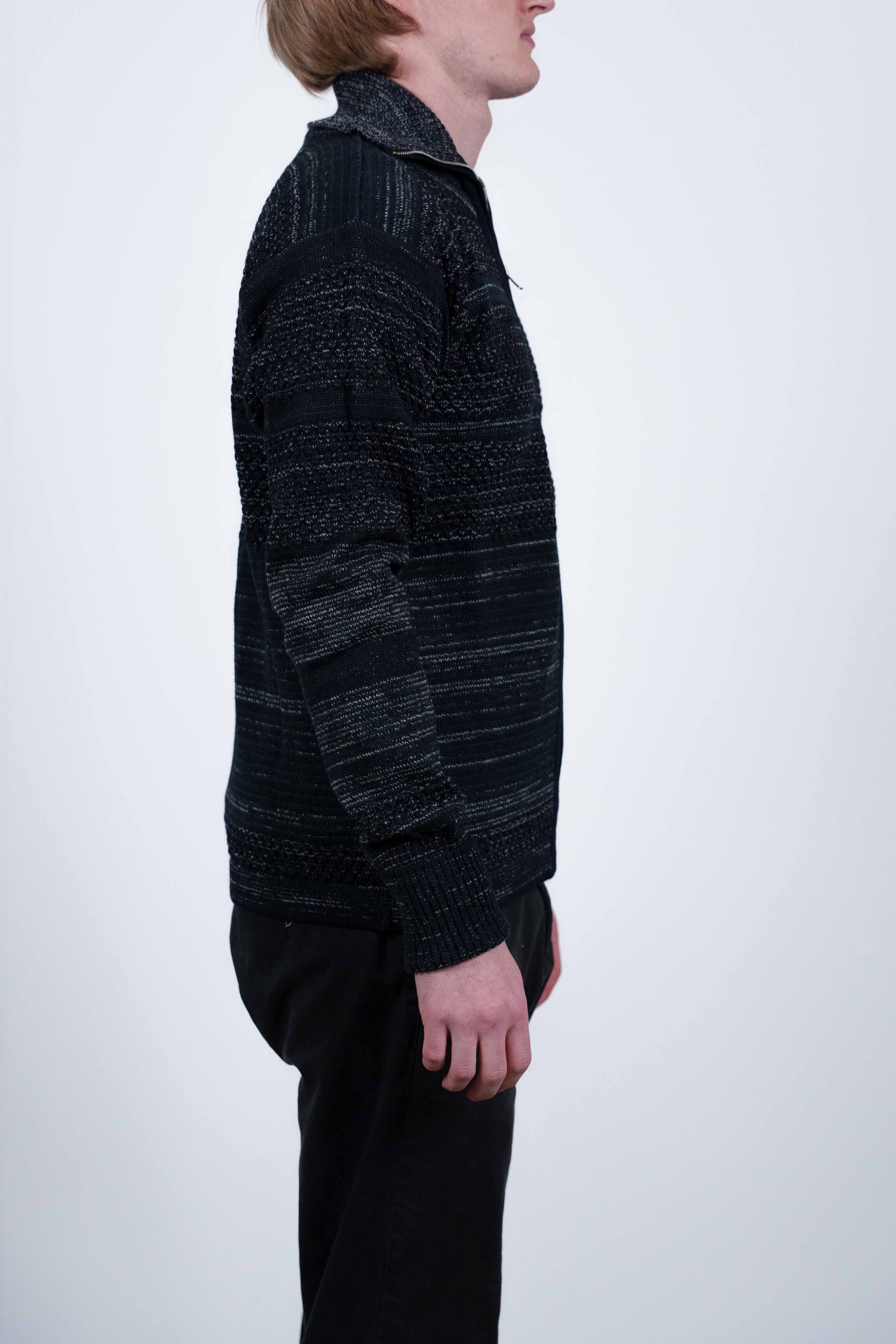 Full-zip sweater fra W014-kollektionen, designet med en opretstående krave og en kompleks, strikket tekstur. Det mørke stof er et meleret sort og hvidt garn, som skaber et unikt mønster med vandrette striber og varierende strikdesigns.