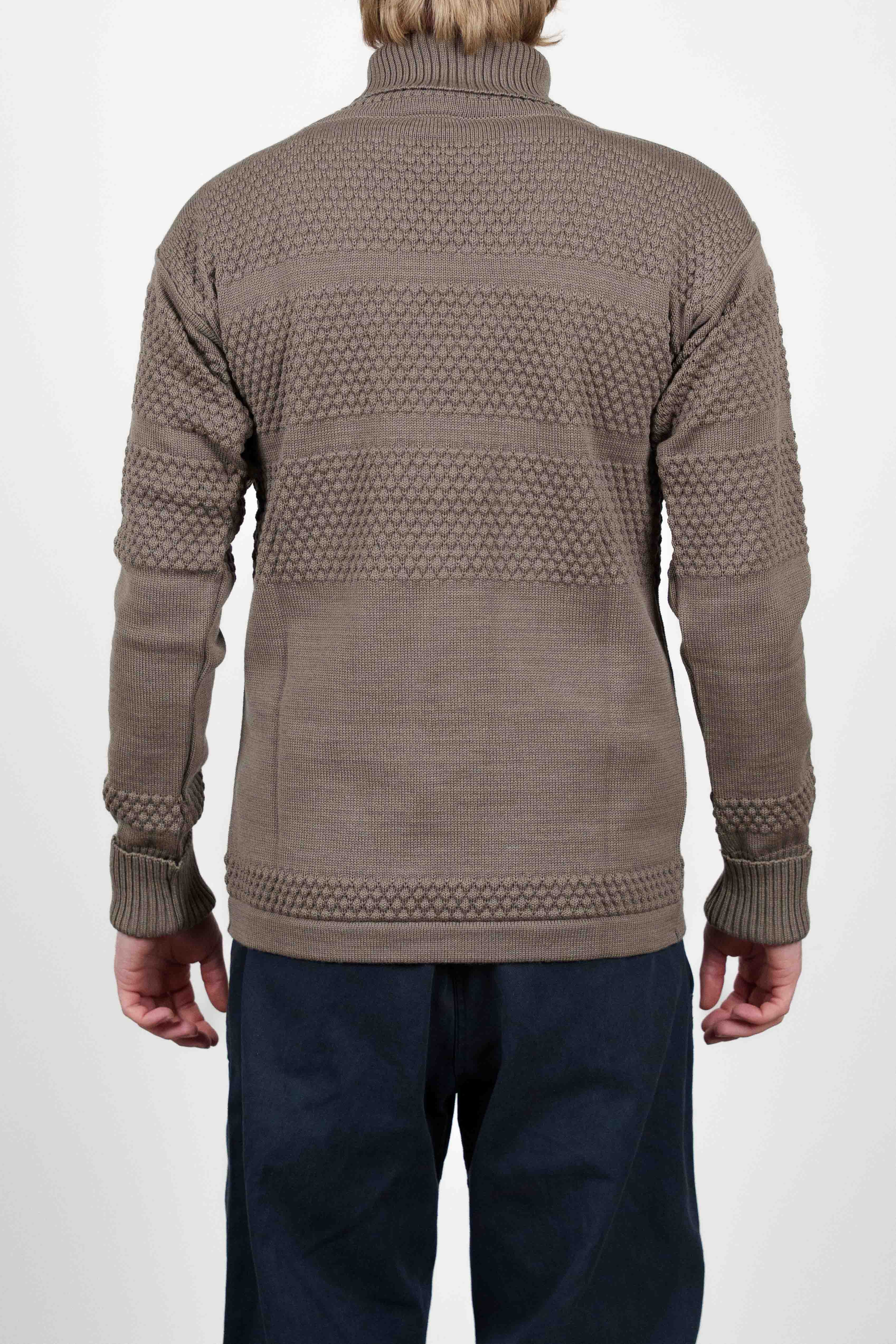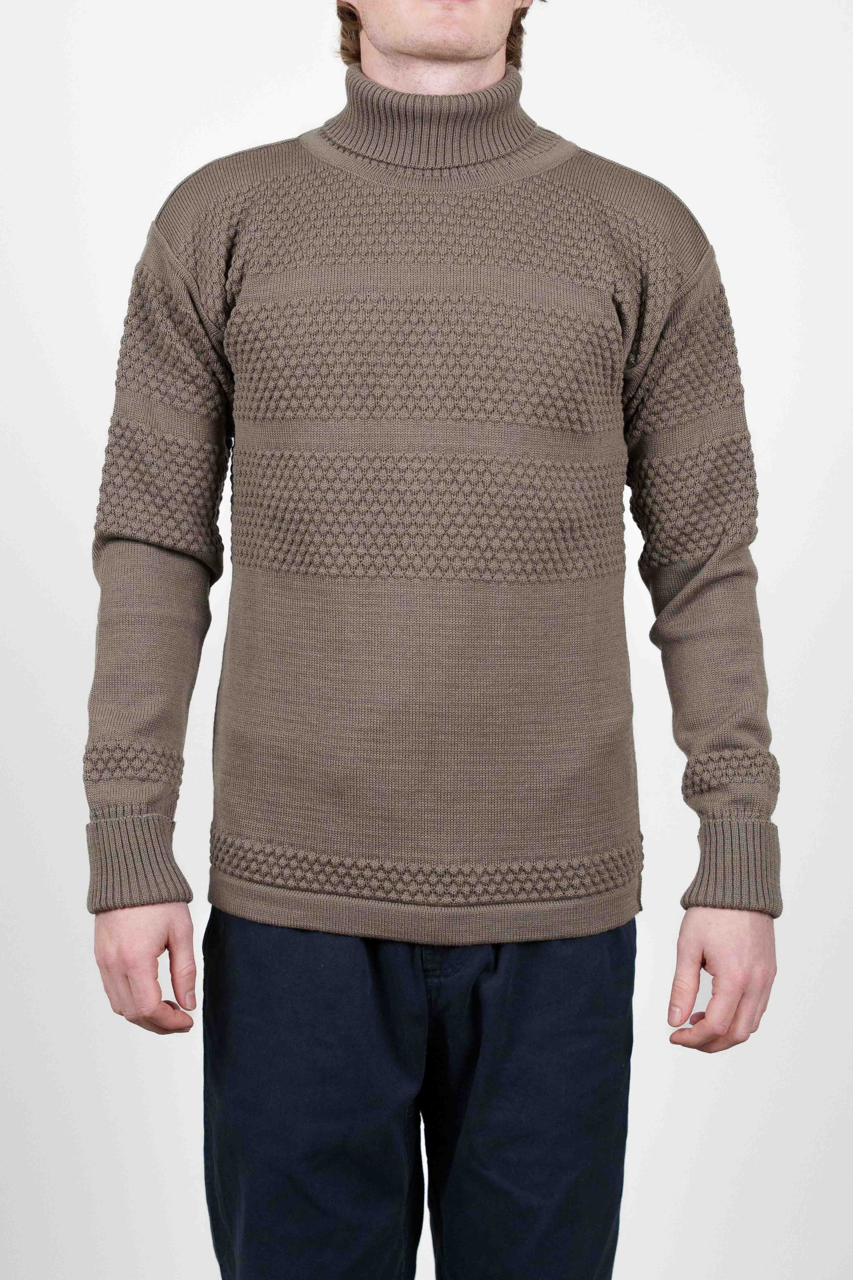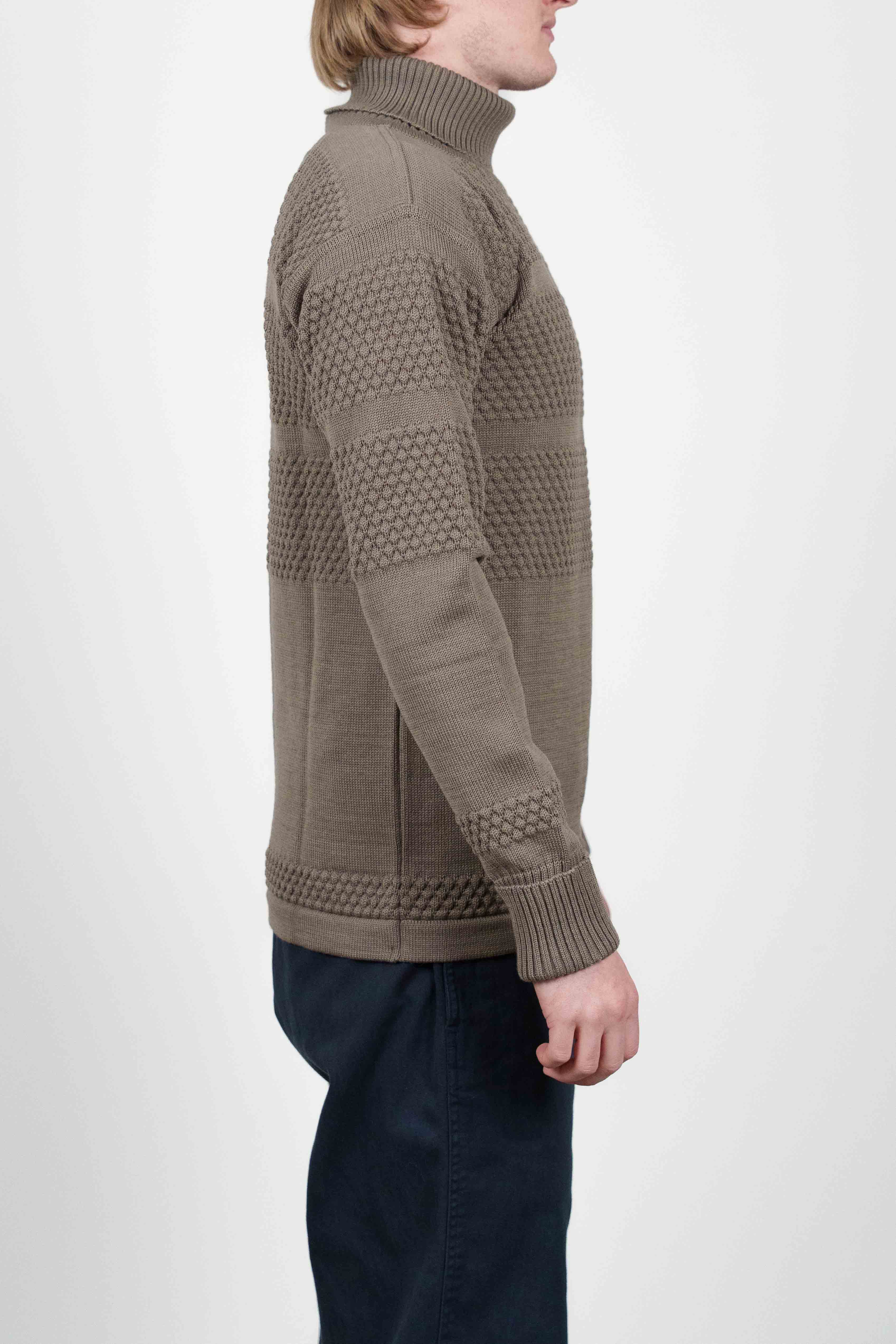 Neutral brun højhalset sweater fra W014-kollektionen med et tekstureret strikmønster med skiftende bånd af mønstrede og glatte masker på krop og ærmer, kompletteret med ribstrikket krave og manchetter.