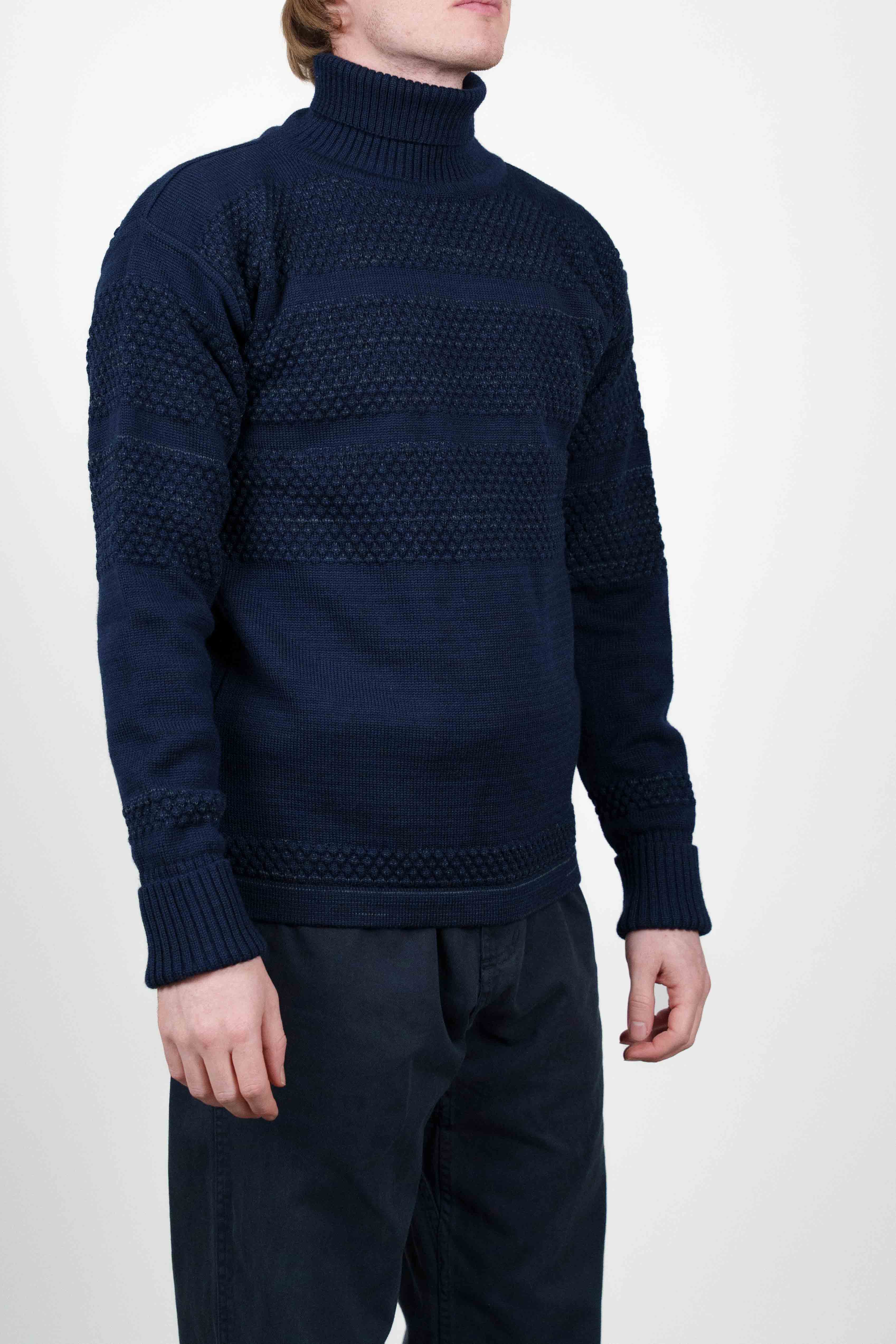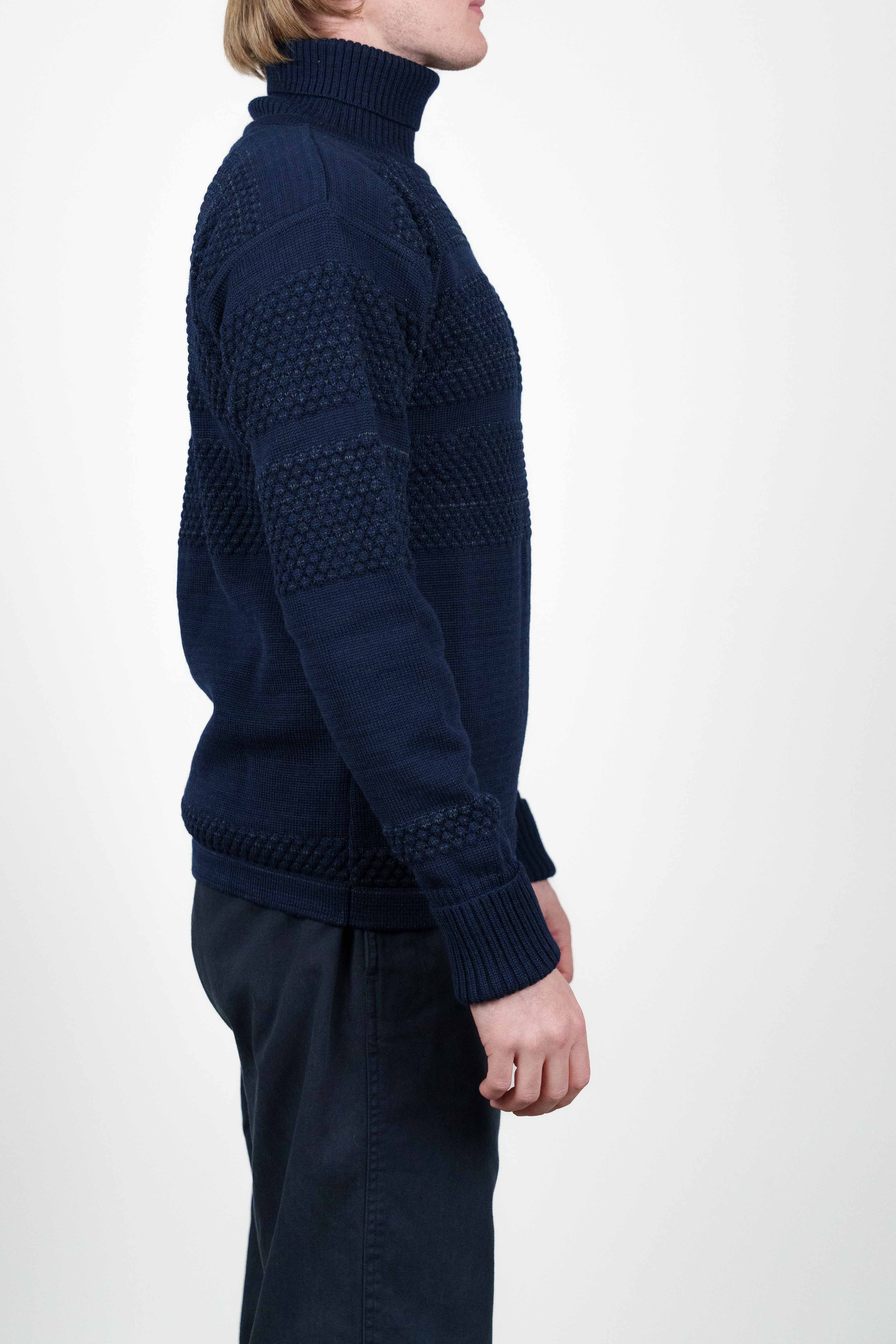 Mørkeblå højhalset sweater fra W014-kollektionen, kendetegnet ved vekslende vandrette bånd af tekstureret boblestrik og glatstrik på krop og ærmer, med ribkanter ved manchetter og forneden. Den rene, nye uld sikrer en luksuriøst blød fornemmelse og enestående varme, hvilket gør den til en essentiel del af garderoben i de koldere måneder.