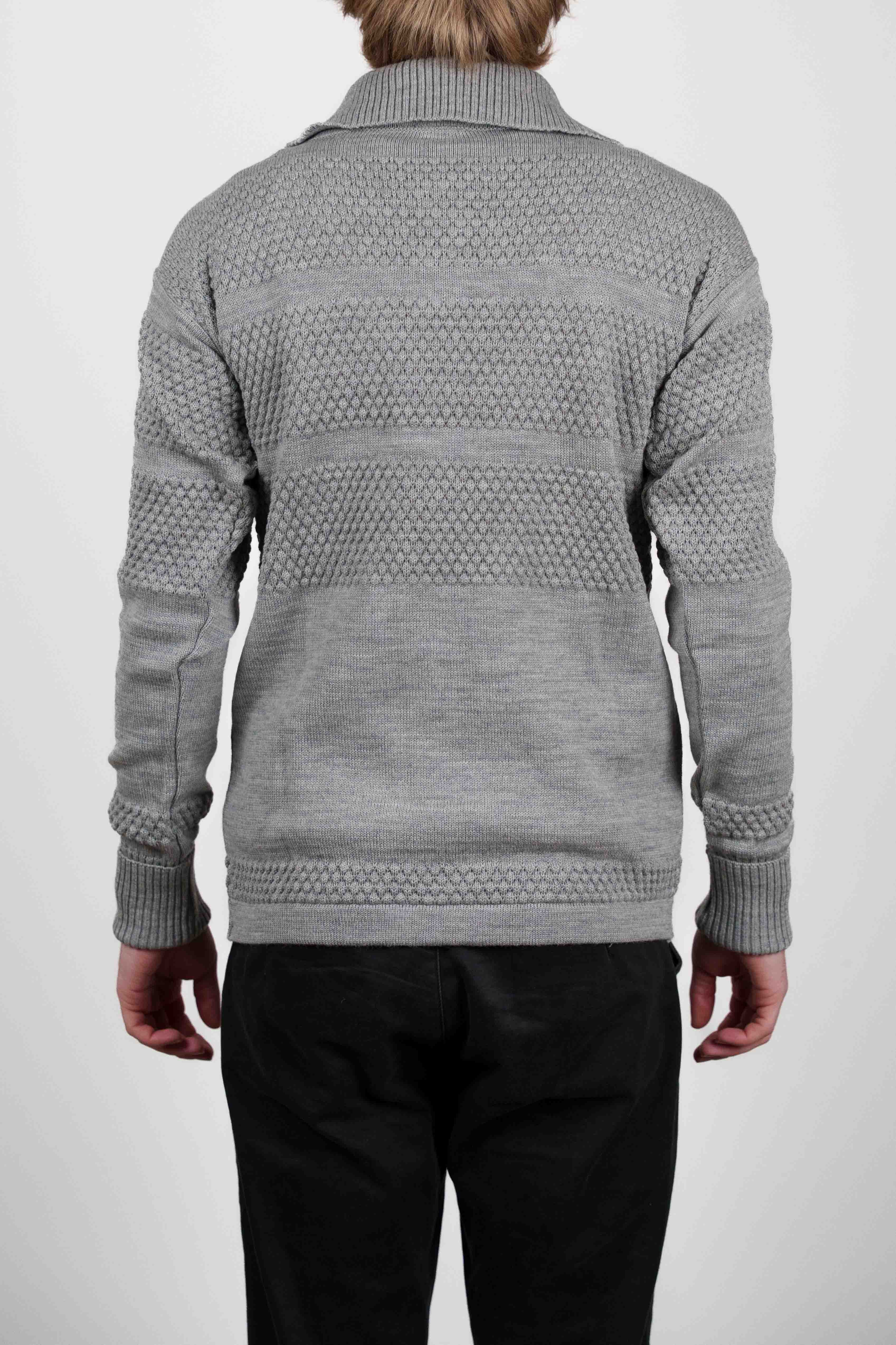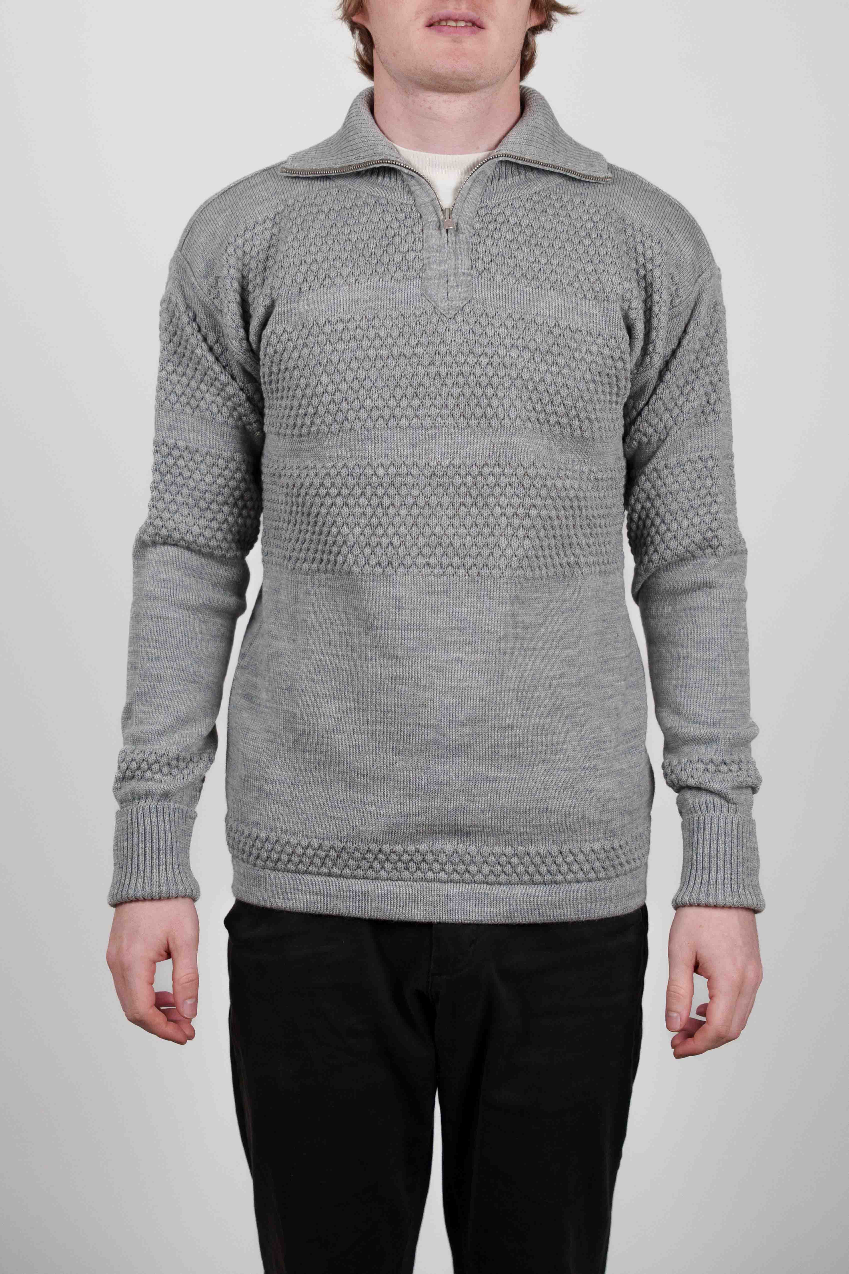 Grå half-zip sweater med en struktureret krave, en nøglestil fra vores W012-kollektion.