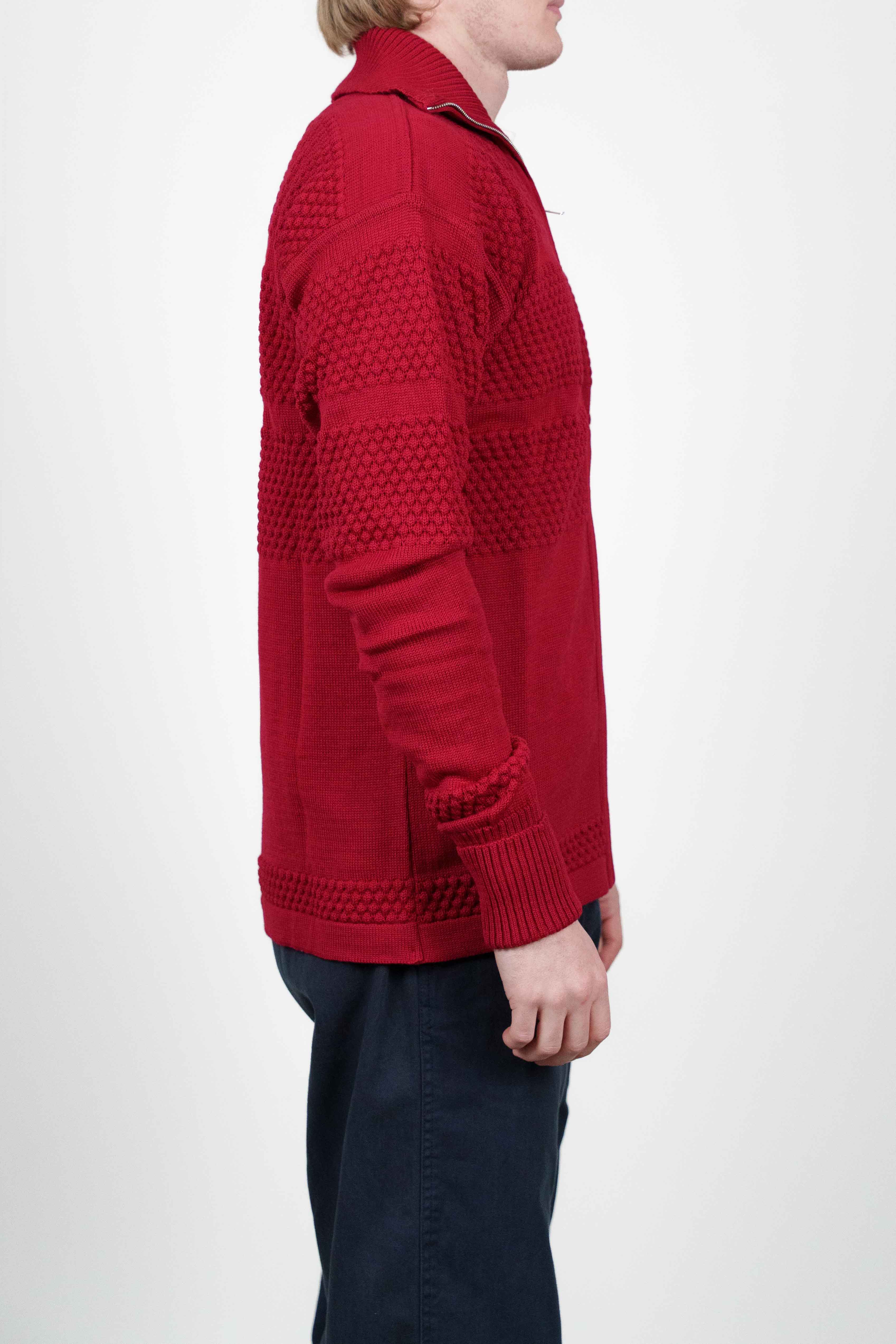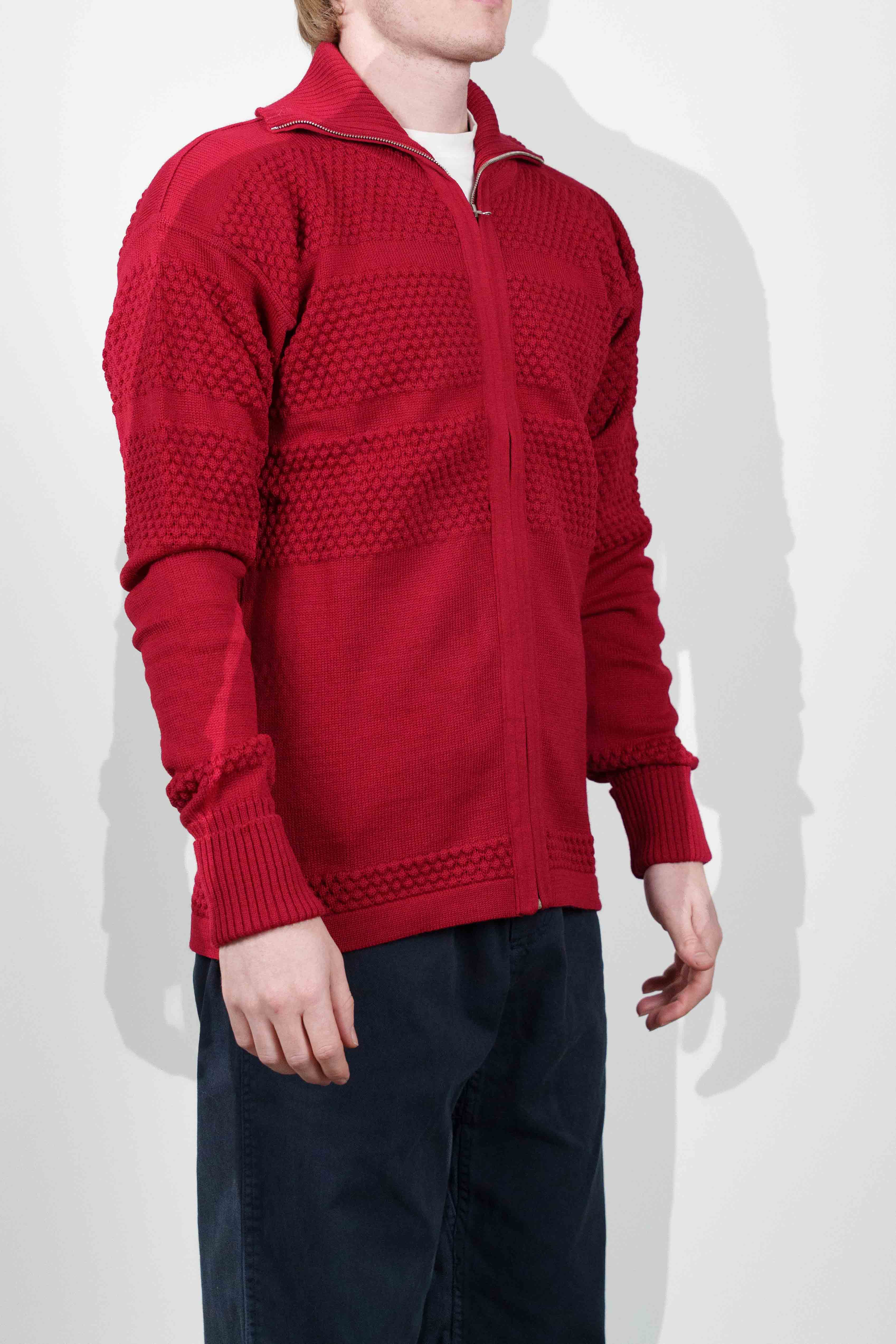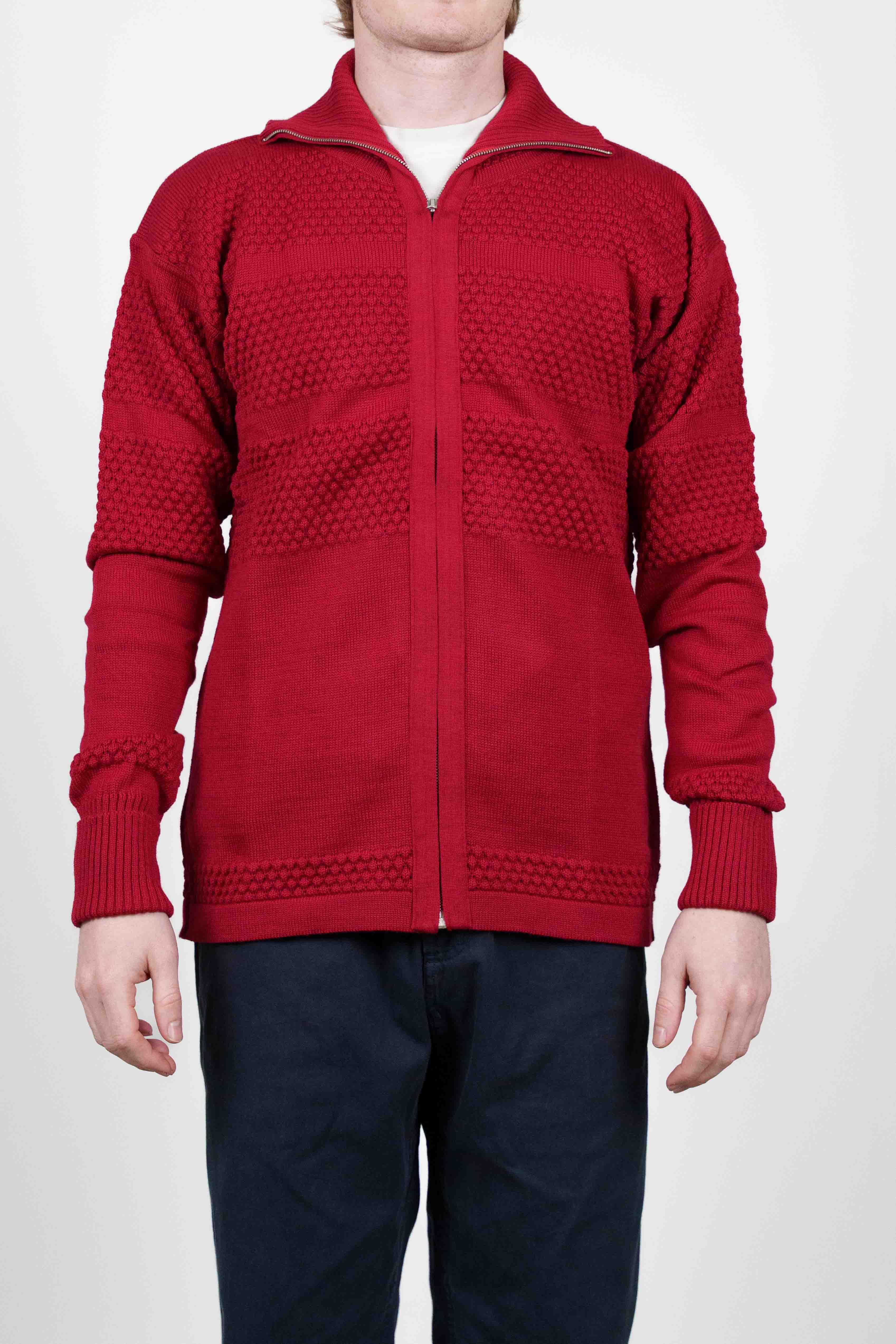 Den har en høj krave samt ribkanter ved ærmer og forneden.