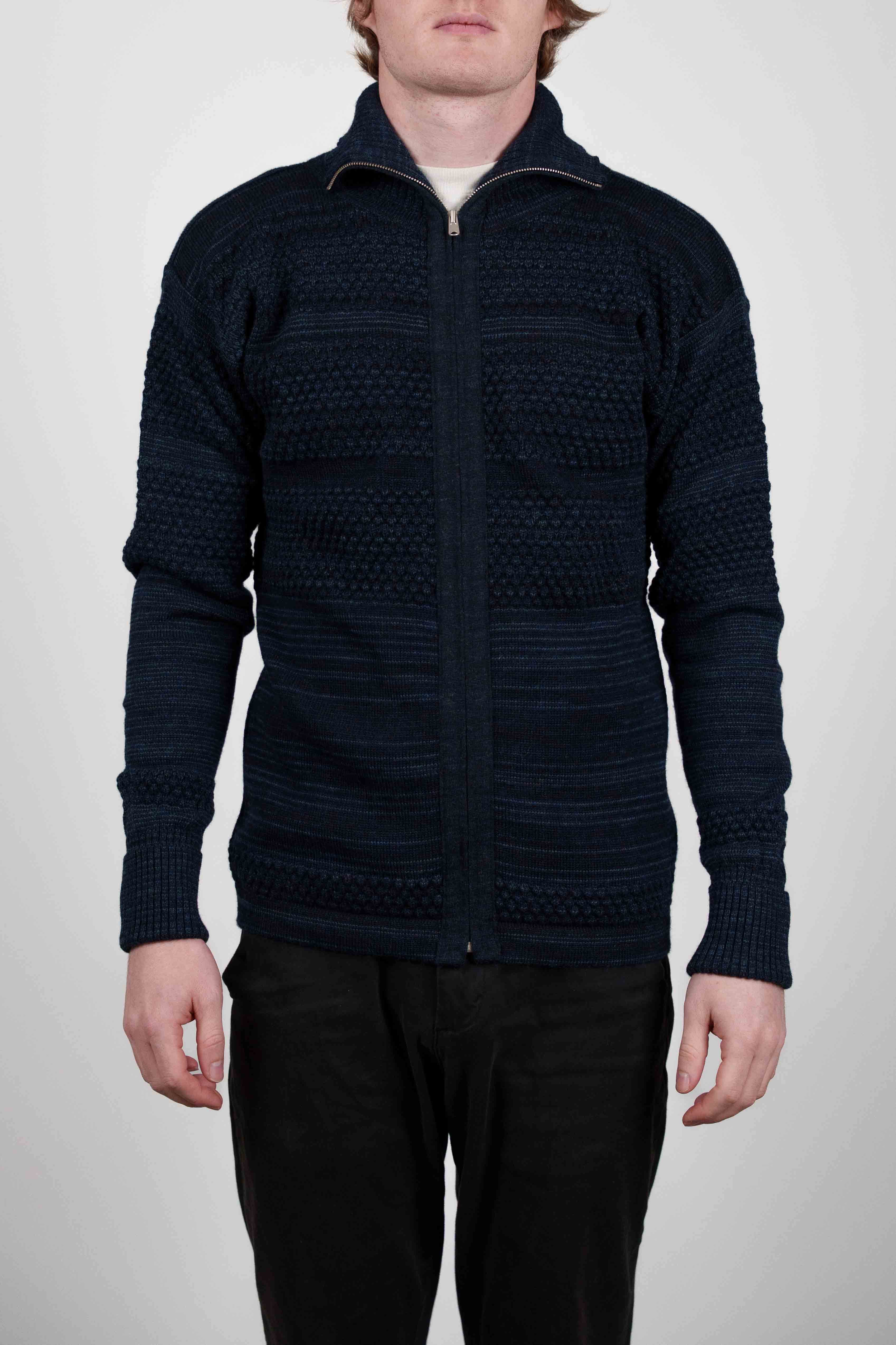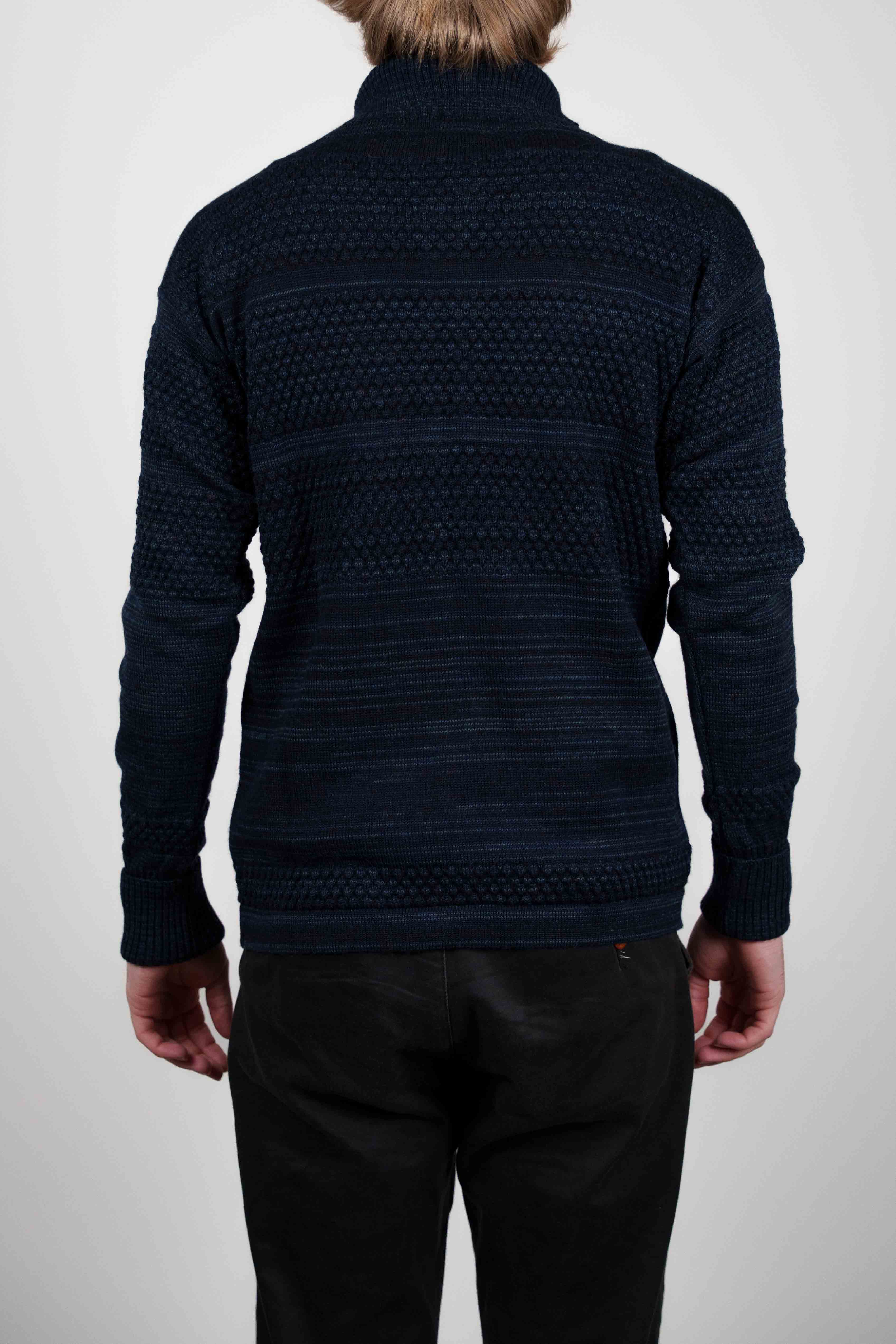 Mørkeblå fuld-lyn sweater fra W012-kollektionen, designet med et tekstureret strikmønster på krop og ærmer, afbrudt af vandrette ribkanter. Har en opretstående krave og ribkanter ved manchetterne.