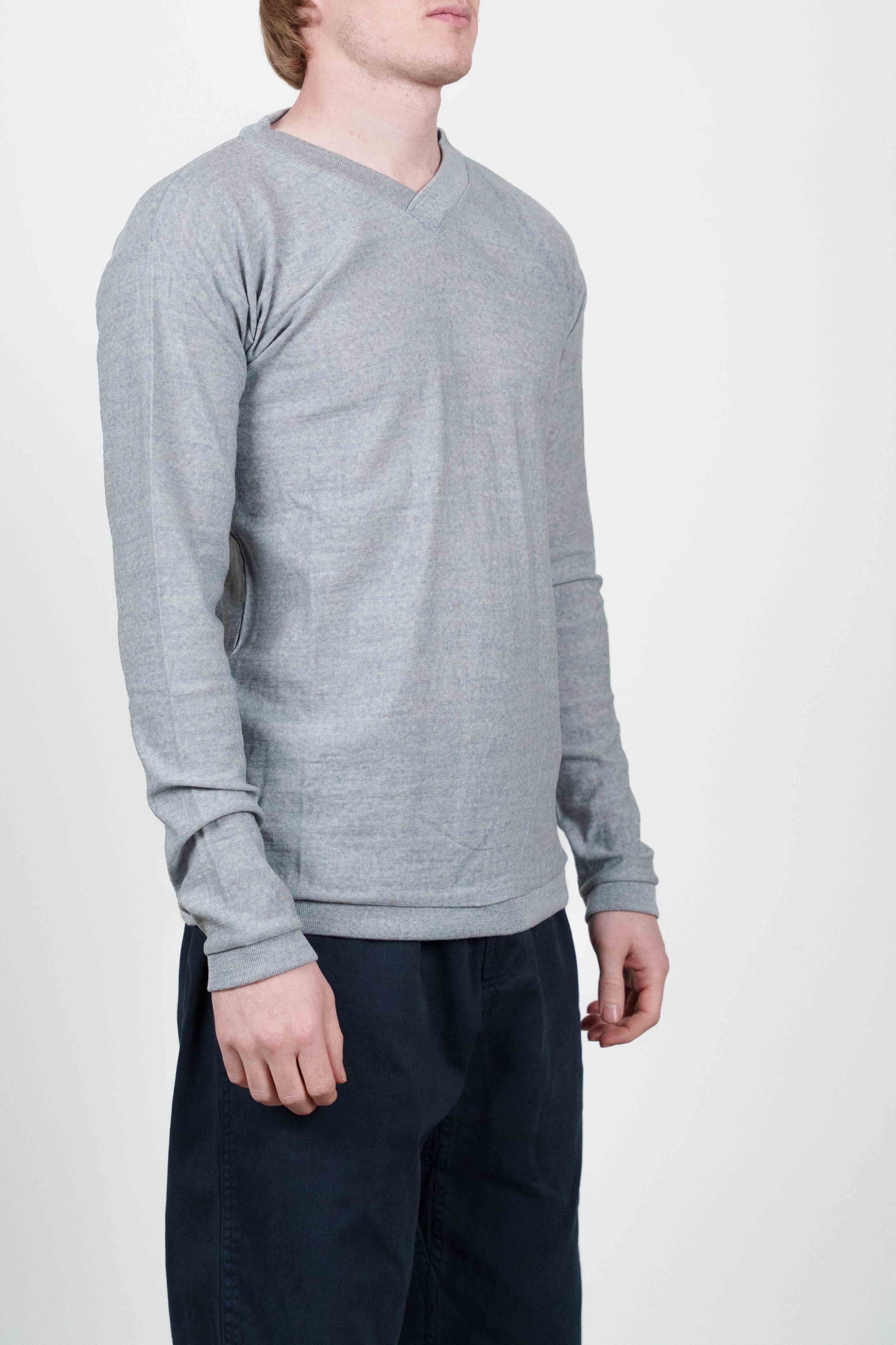 Lysegrå, langærmet V-hals top fra vores SS12 kollektion, fremstillet i en fin, blød jerseykvalitet. Den har en afslappet pasform og er afsluttet med ribkanter ved manchetter og forneden, hvilket giver den et afslappet udtryk.