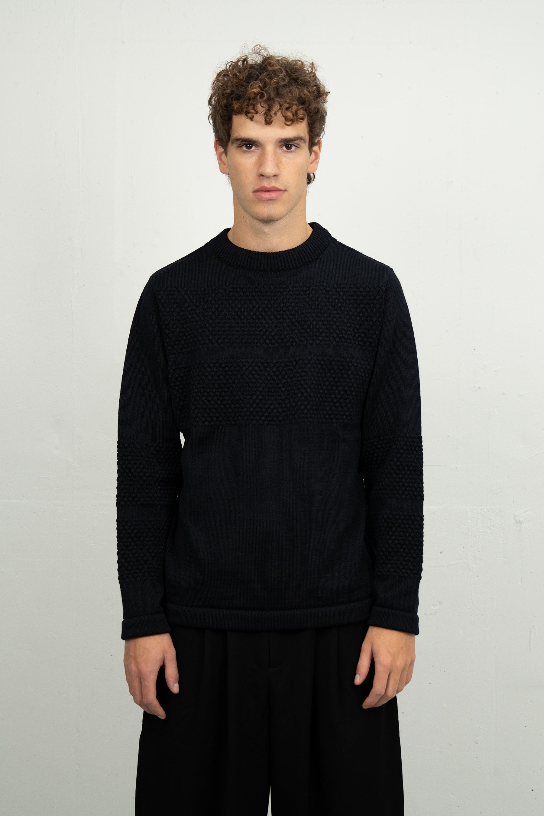 | TEKNISKE TRÆK | Kraven er en dobbeltlaget 2x1 rib, forstærket for at sikre, at den holder formen. Manchetterne er sømløst tubestrik for en ren og behagelig finish. Kanten er konstrueret med sømløst tubestrik for en ensartet og raffineret afslutning. |