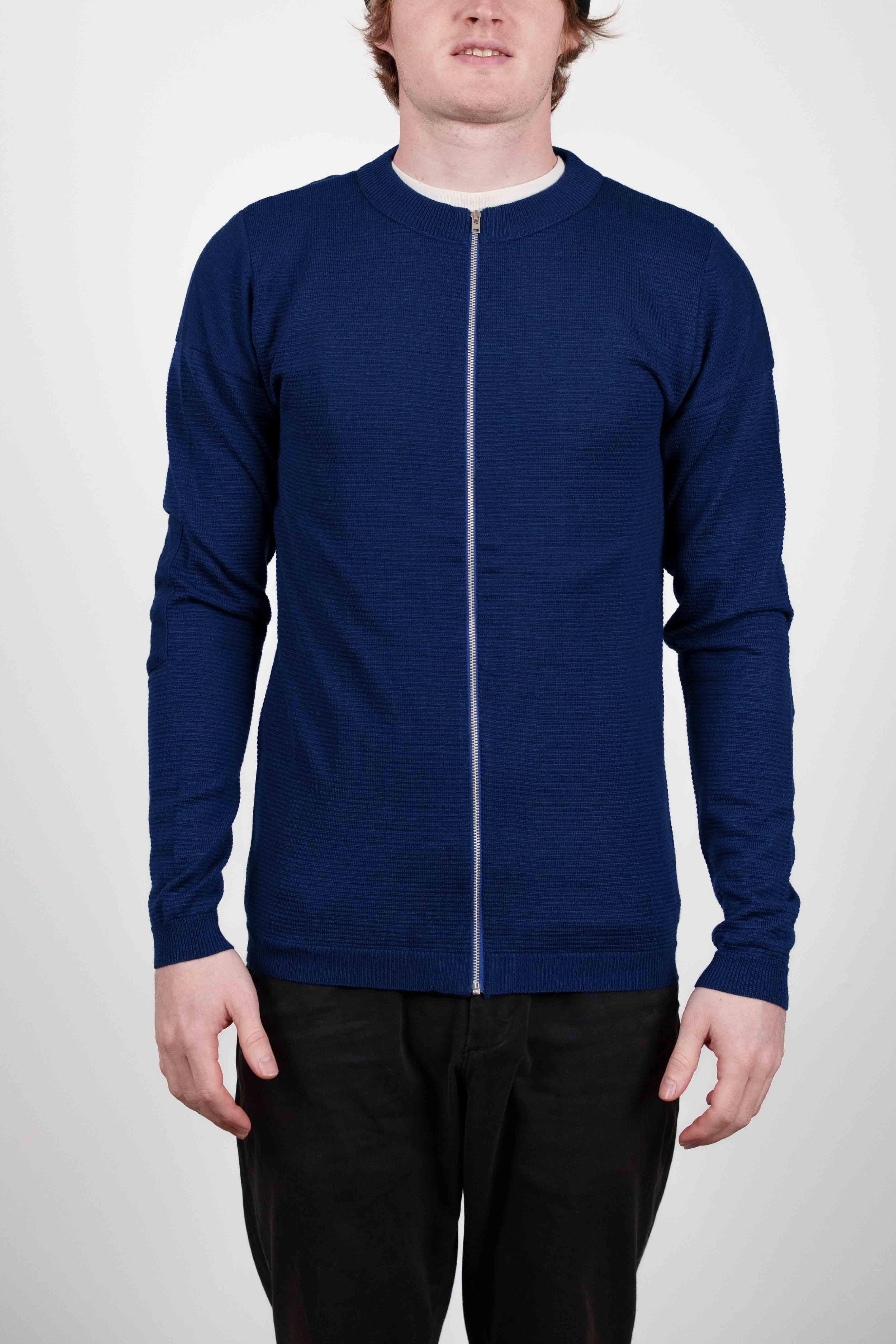 Den har en lynlås i metal foran samt ribstrikket rund hals og manchetter.