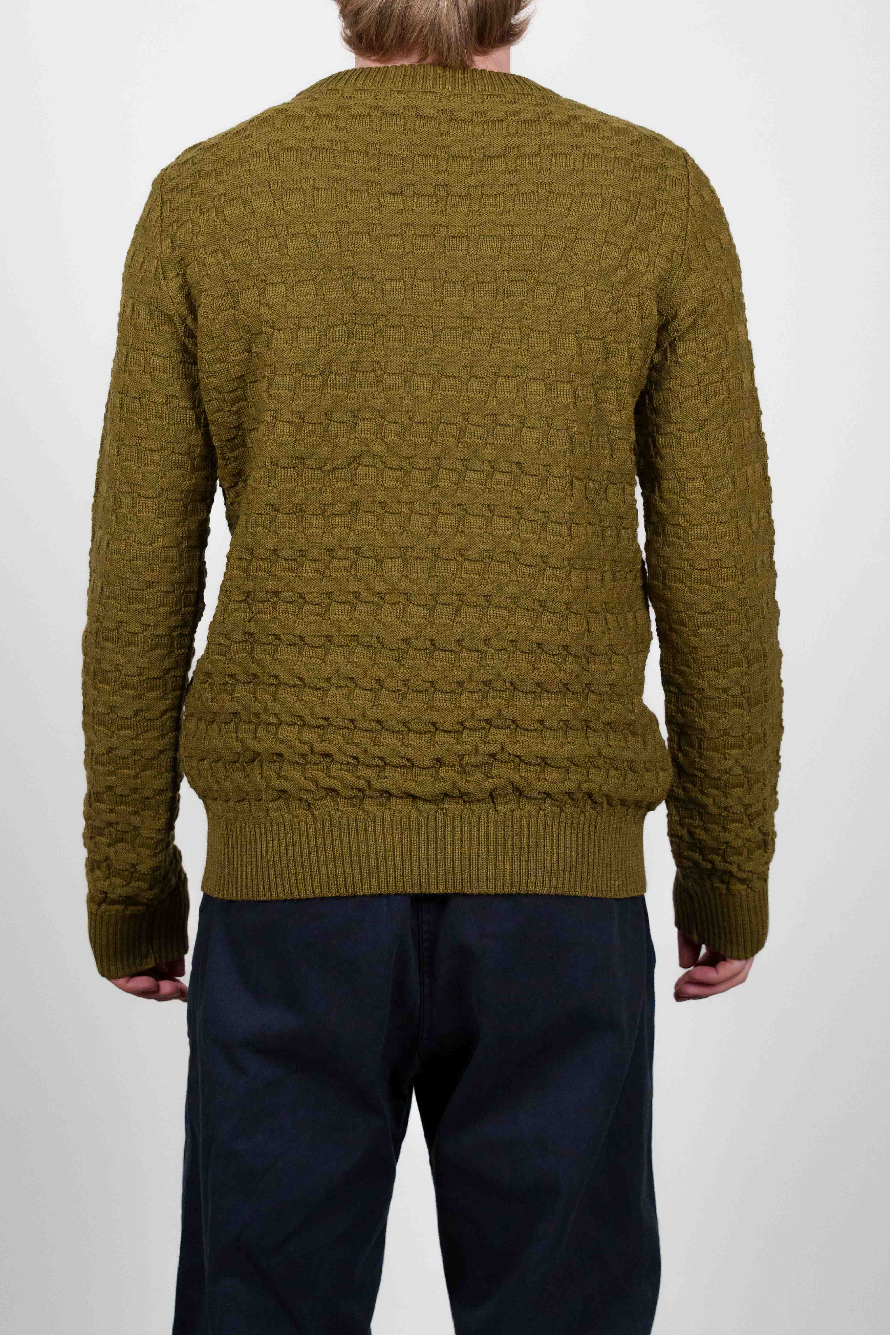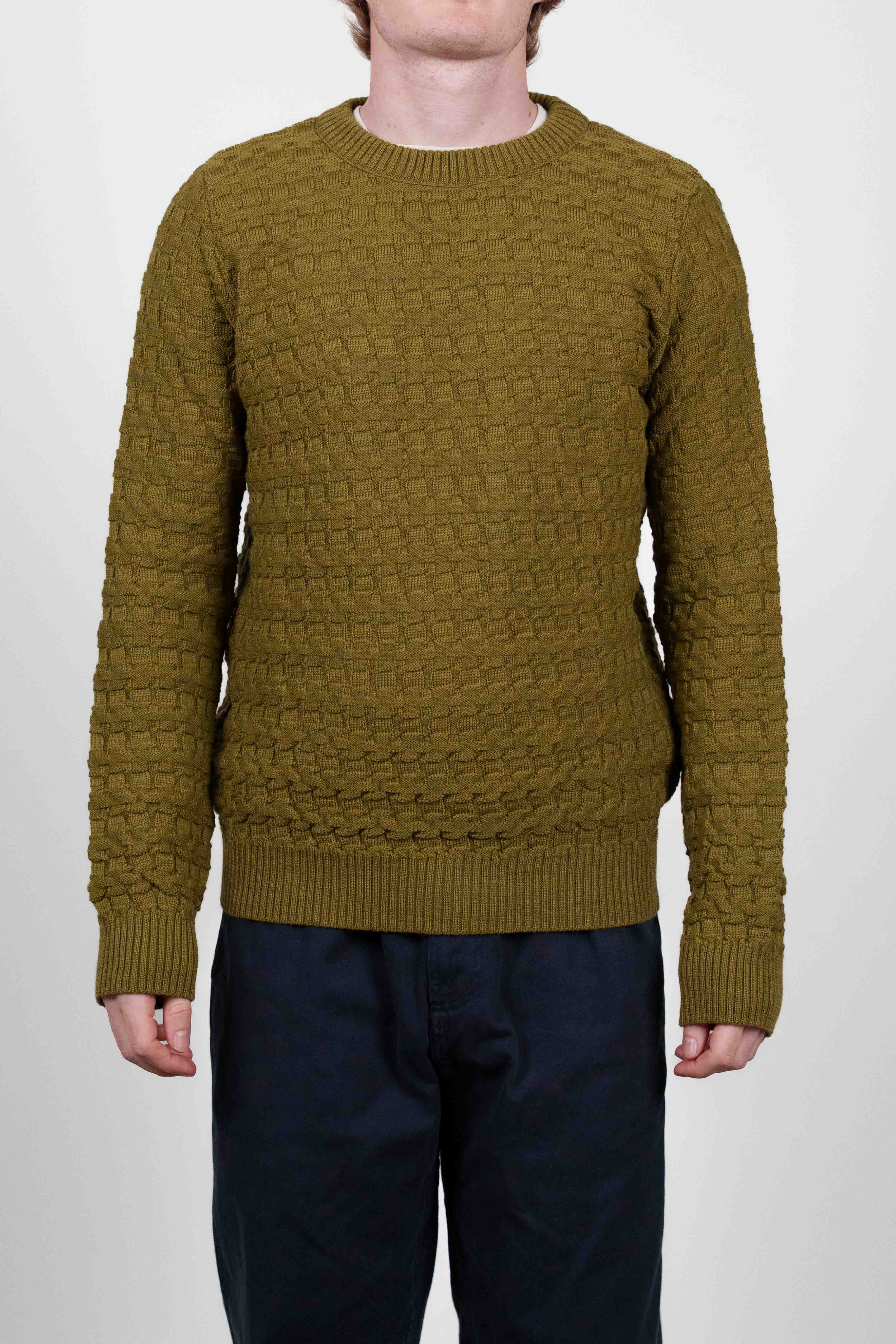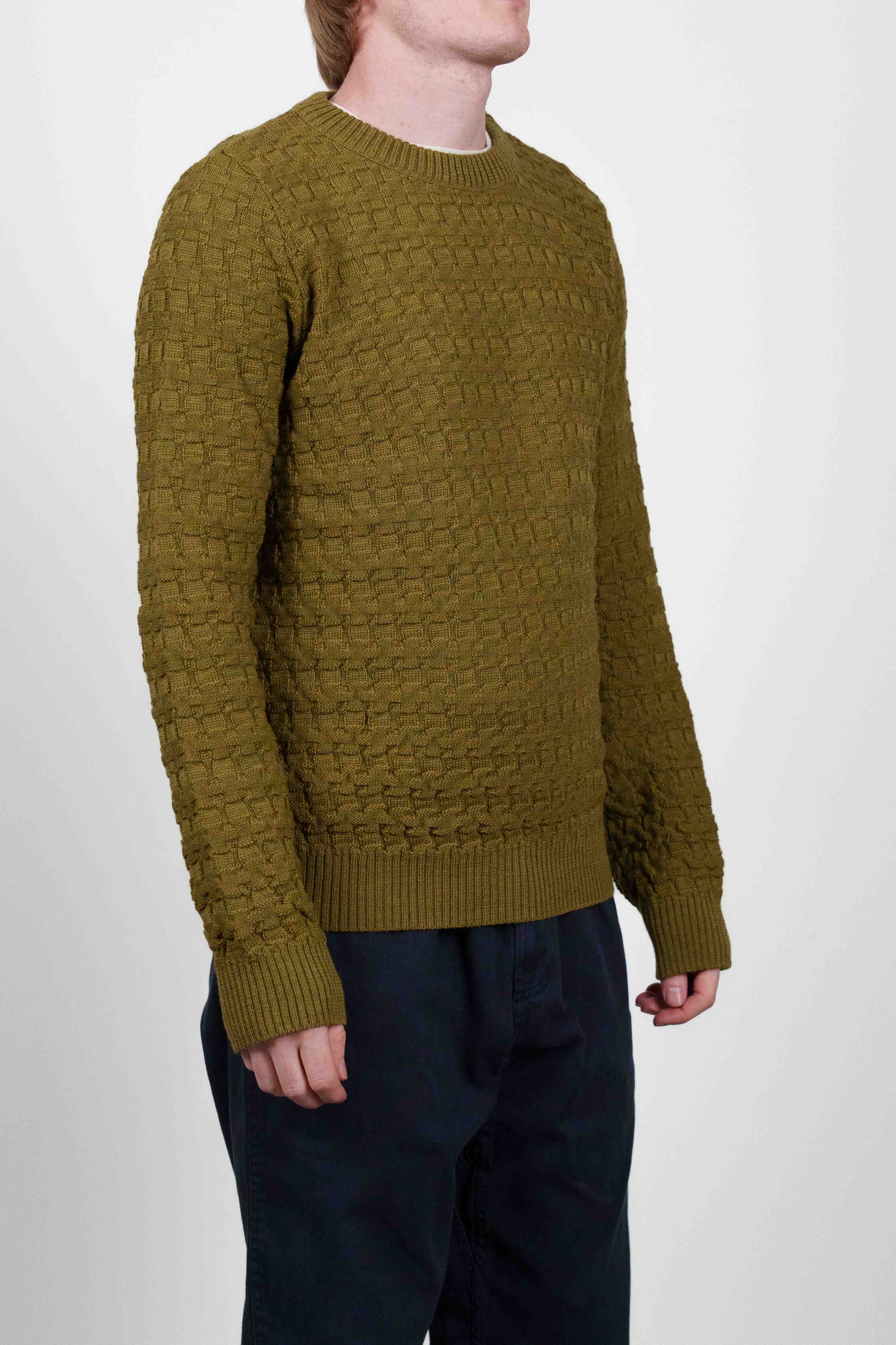 Olivengrøn crew neck sweater fra W013-kollektionen med et karakteristisk tekstureret, hævet blokstrikket mønster.