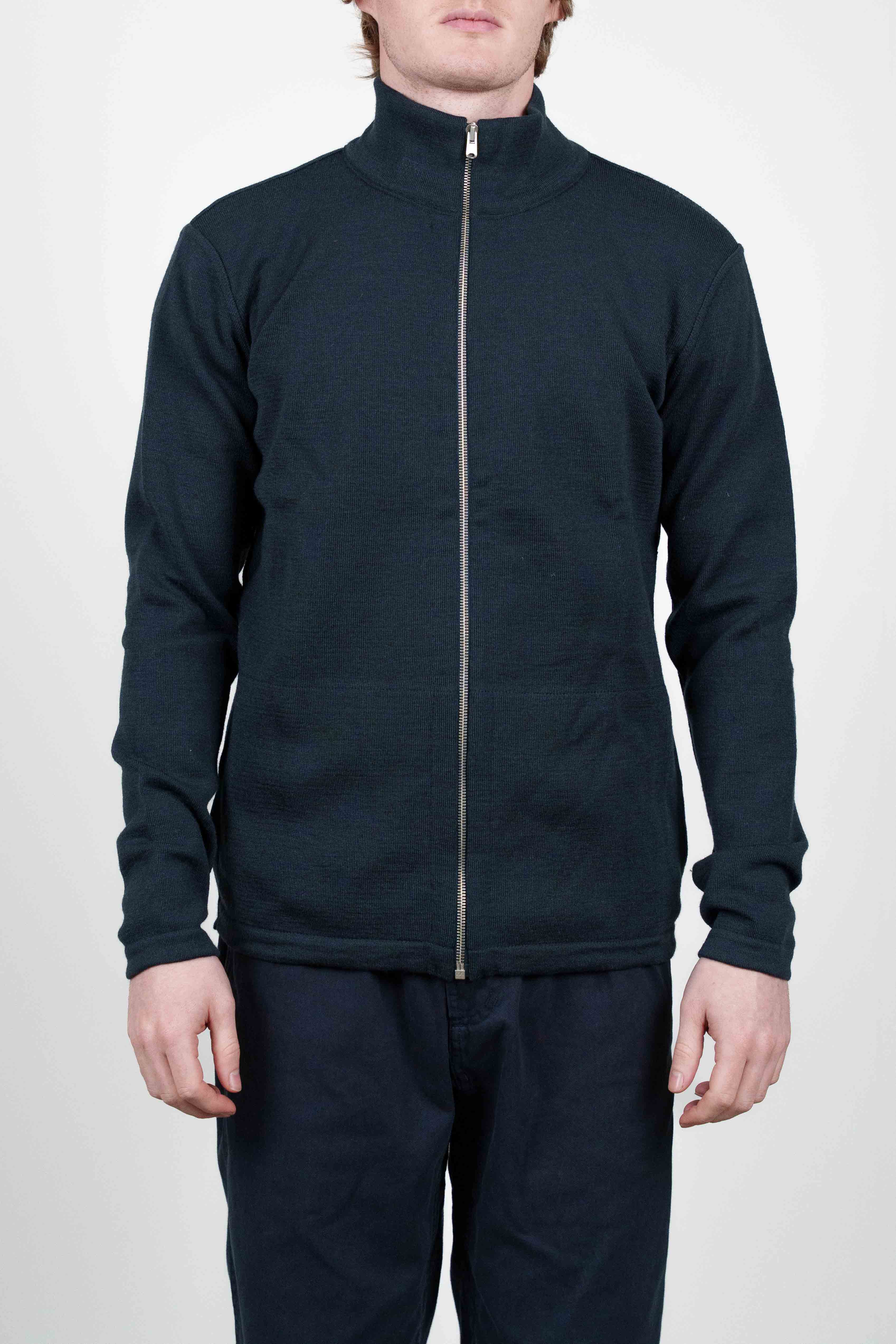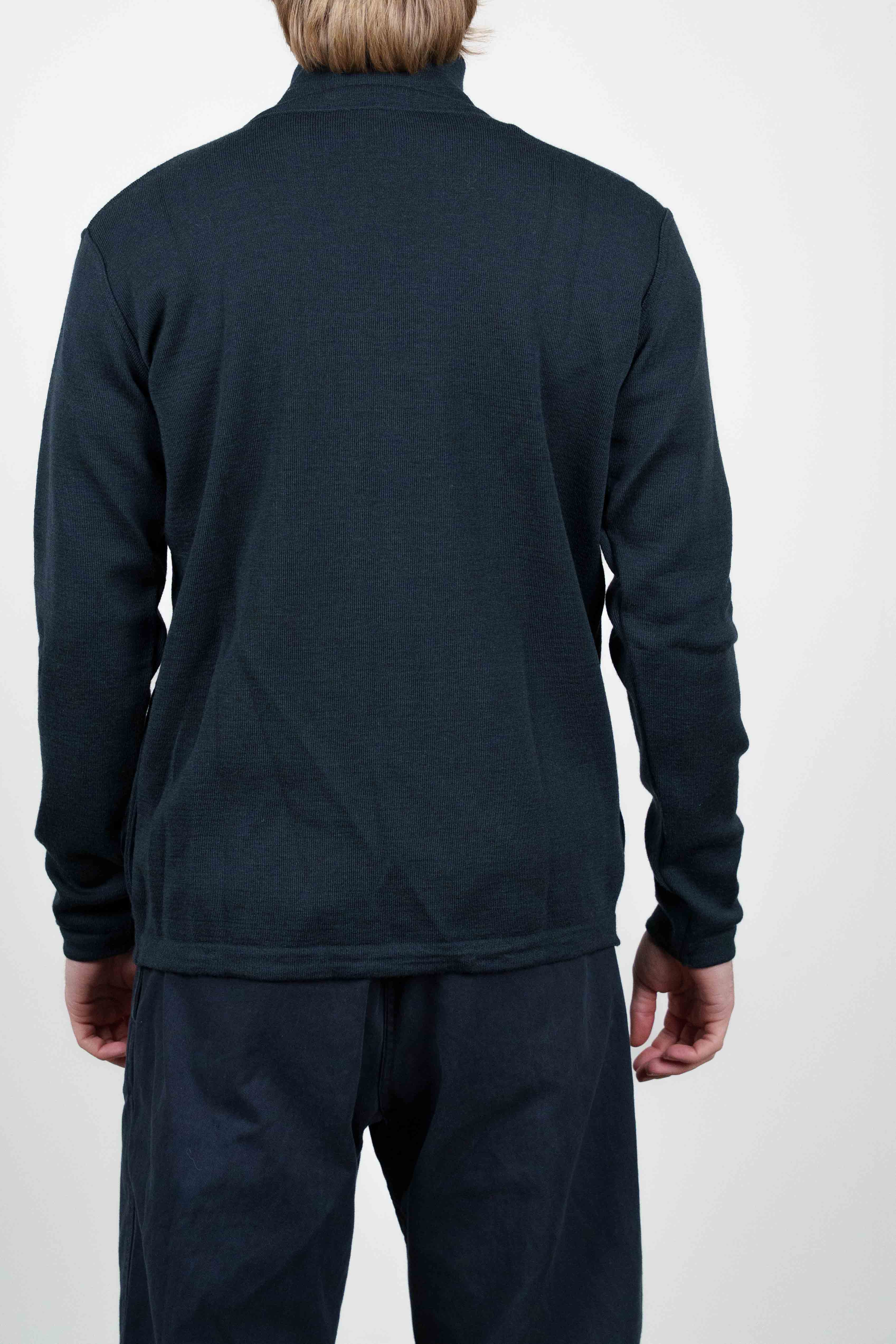 Mørkeblå fuld-lyn sweater med høj hals fra vores W020-kollektion. Den er designet med en fin, ribstrikket tekstur på både krop og ærmer, som giver et klassisk og stilfuldt udtryk.