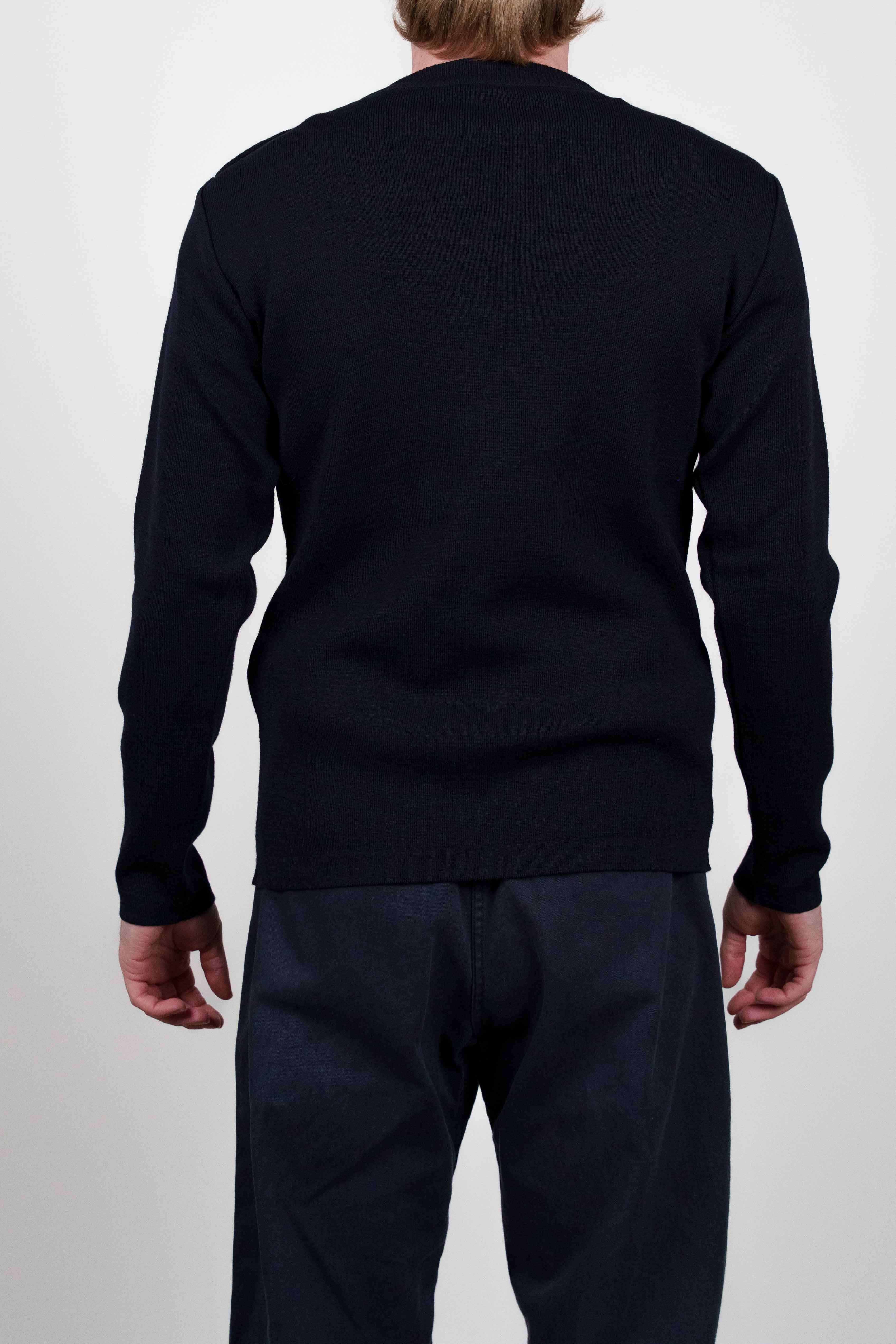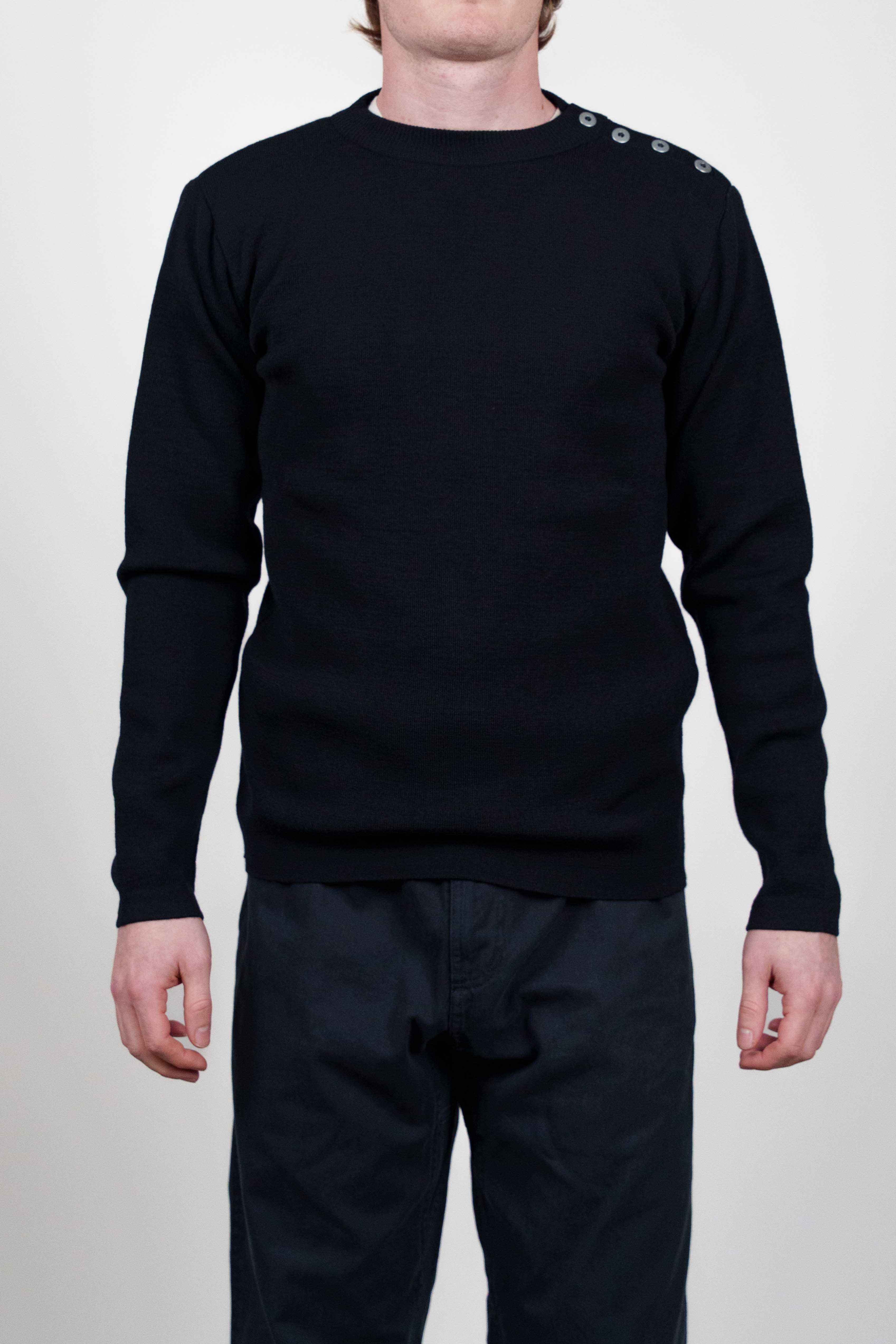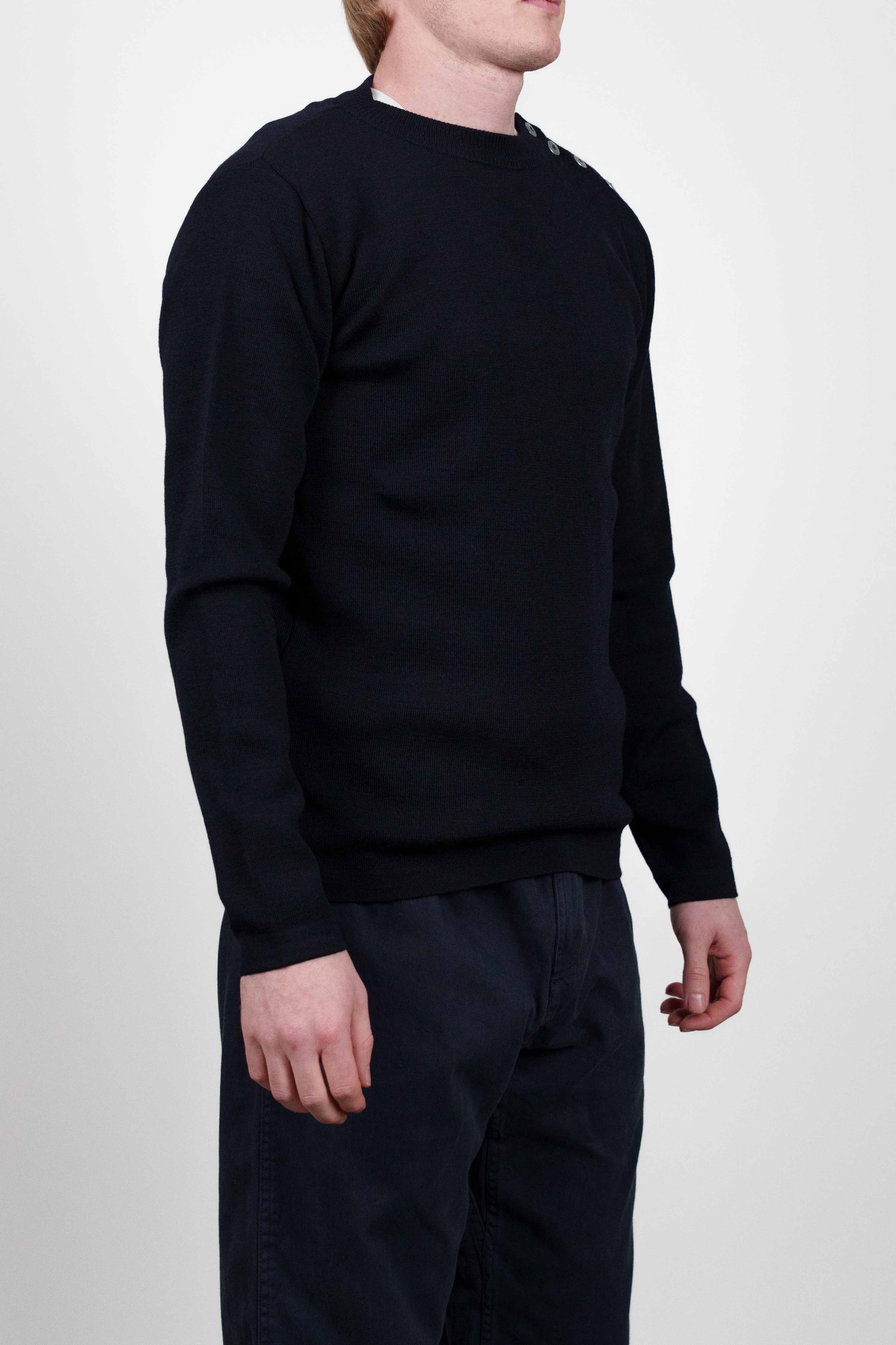 Denne klassiske og elegante trøje har lange ærmer og er detaljeret med metalknapper langs venstre skulder.