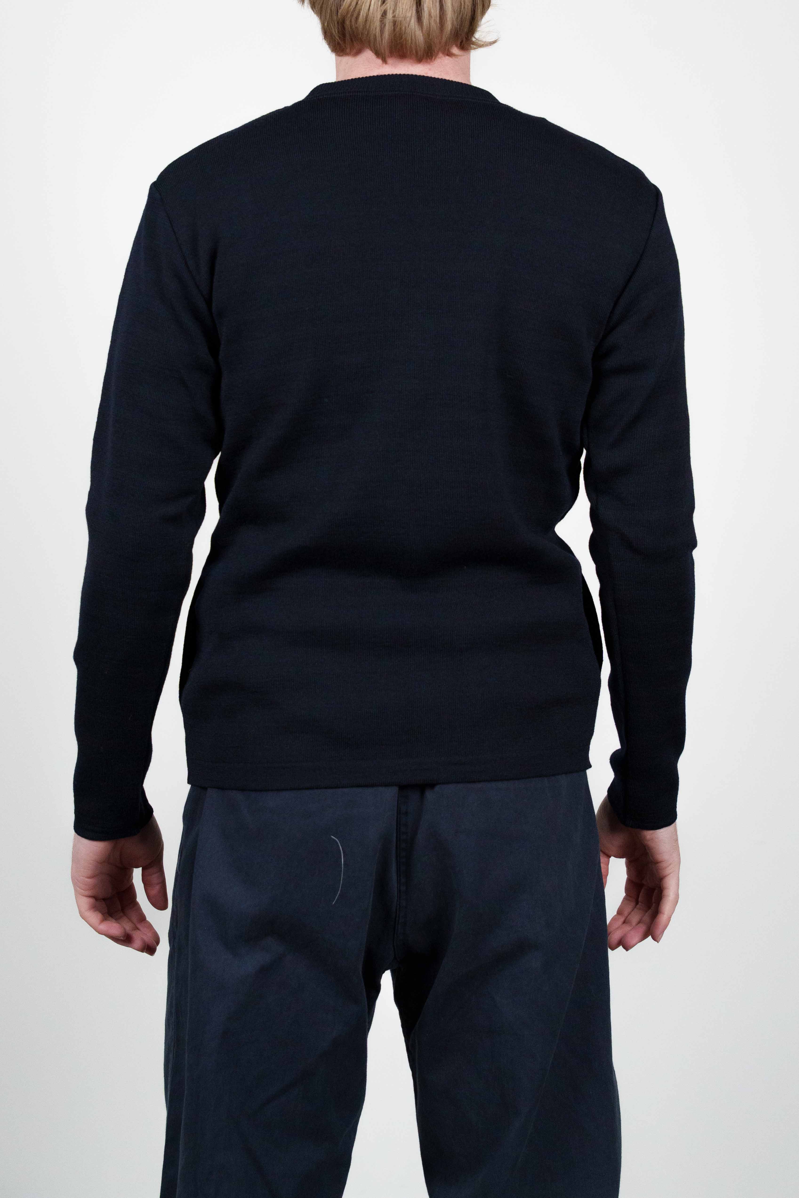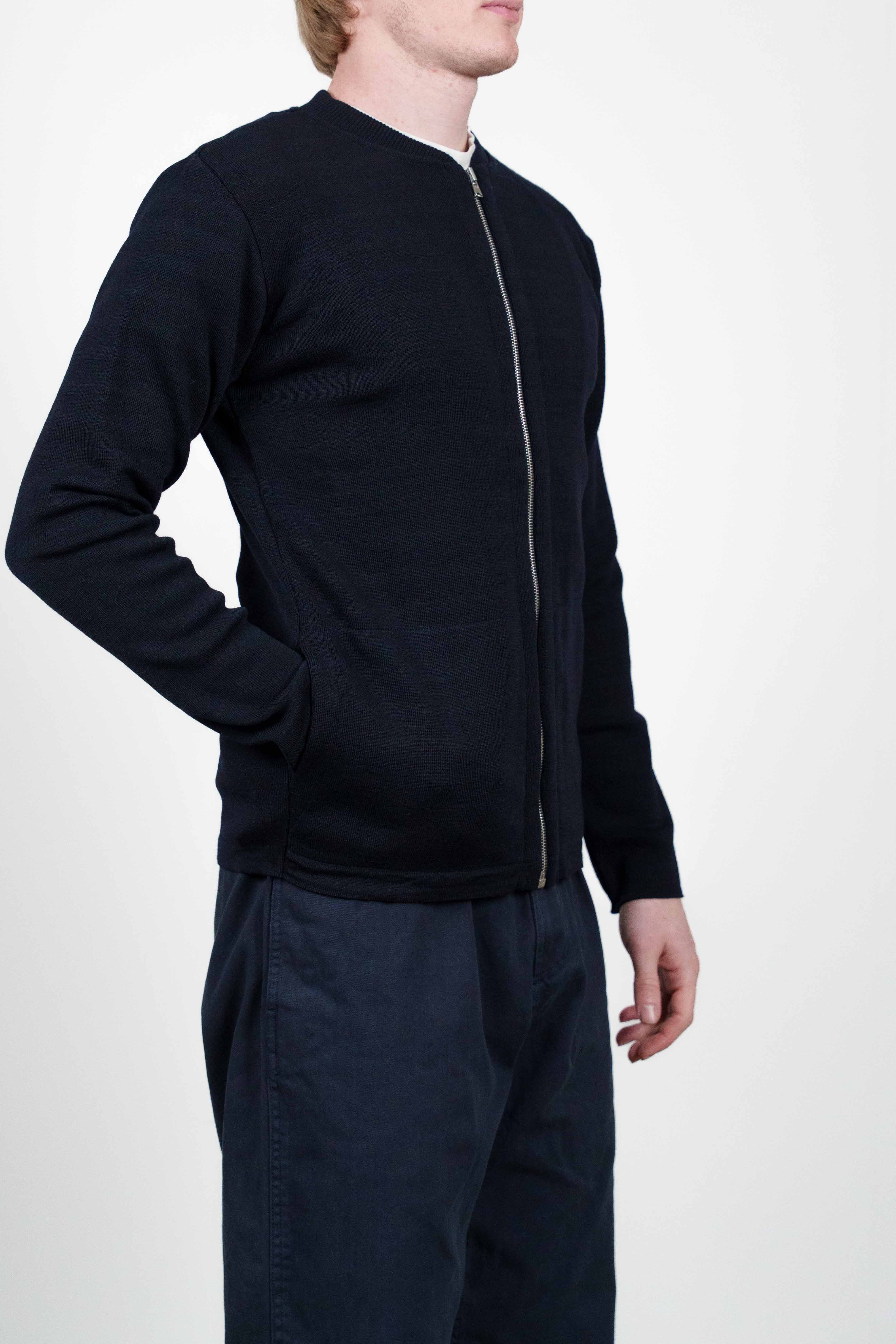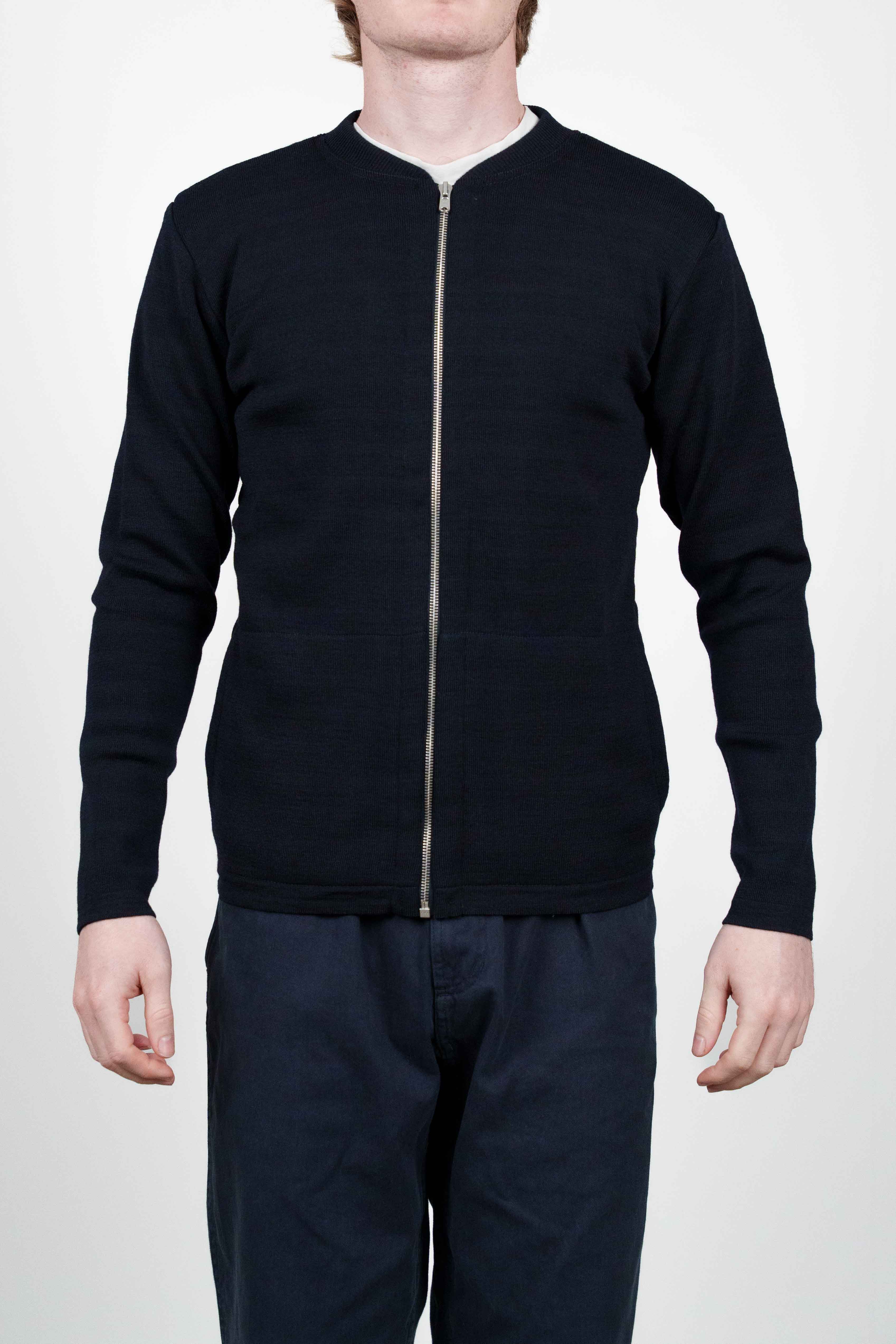 Mørkeblå full-zip sweater fra W016-kollektionen, udført i en finstrikket kvalitet. Den har en rund, opretstående krave, lange ærmer og ribdetaljer på manchetter og forneden.