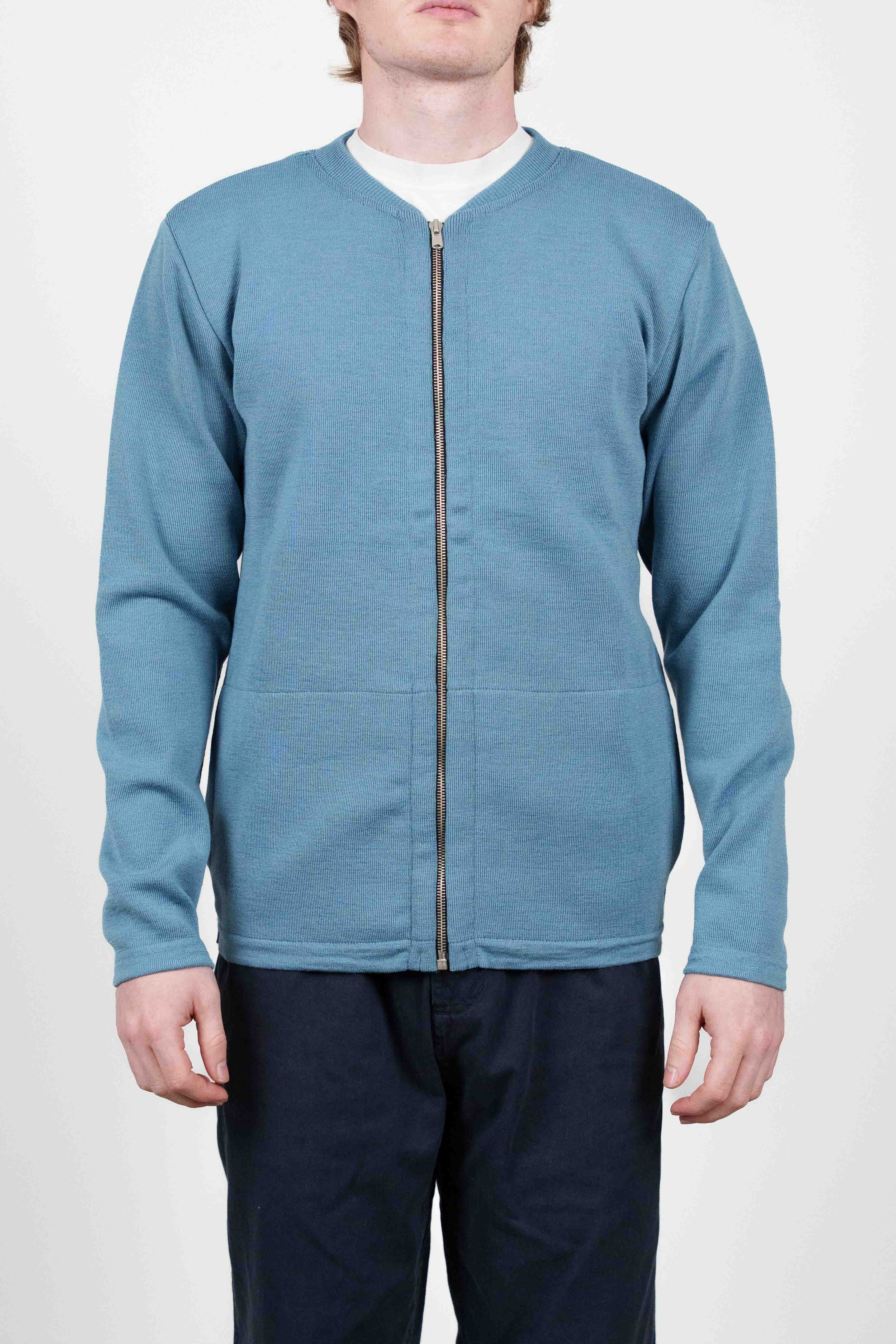 Blå full-zip sweater fra vores W014-kollektion i en ribstrikket tekstur. Den har en kravefri V-udskæring og en metallås ned foran, hvilket giver et afslappet, men raffineret look.