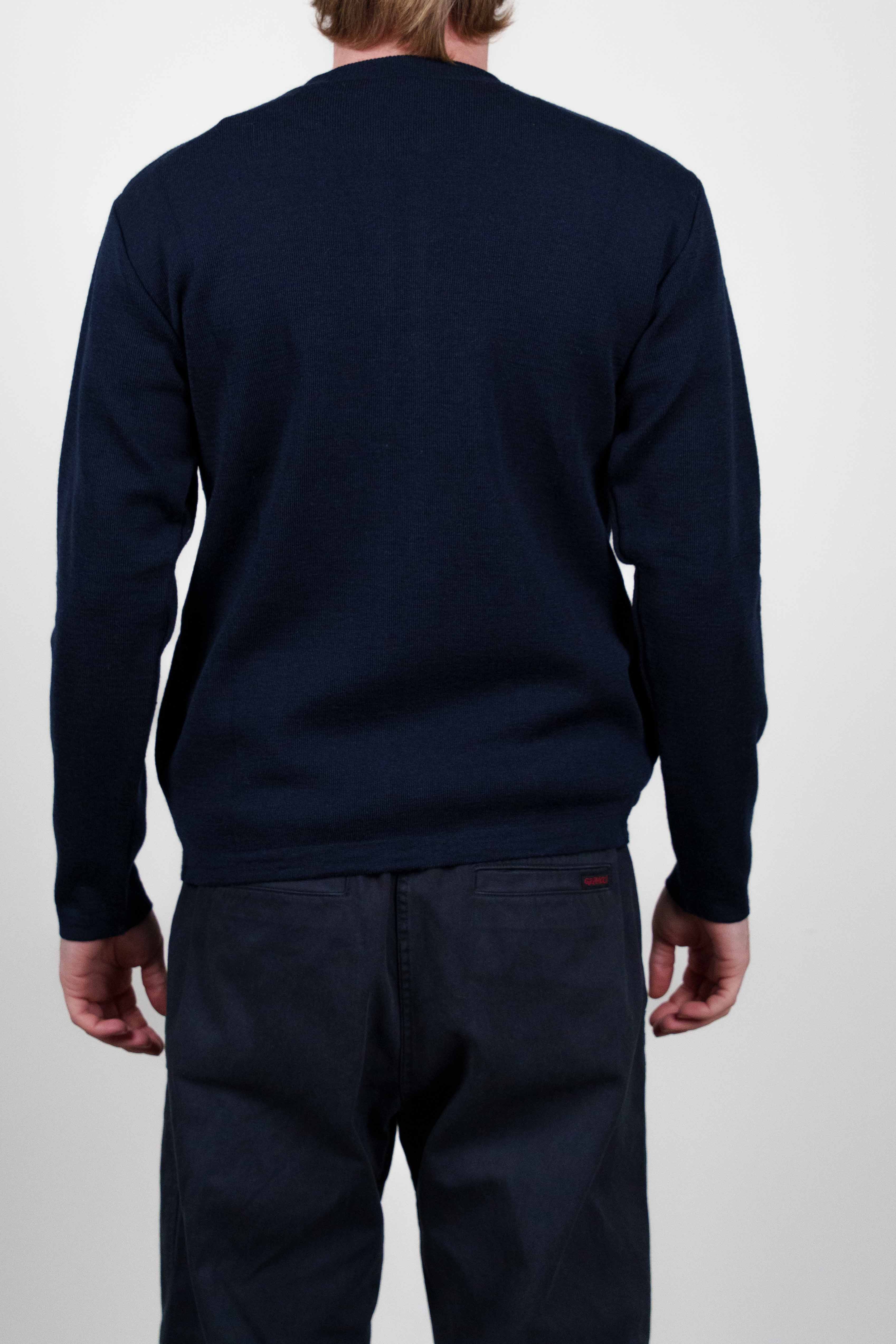 Dyb blå, let full-zip sweater fra W012-kollektionen. Den har en ribstrikket tekstur, en rund kravefri halsudskæring og en metallynlås, der løber ned langs midten foran.