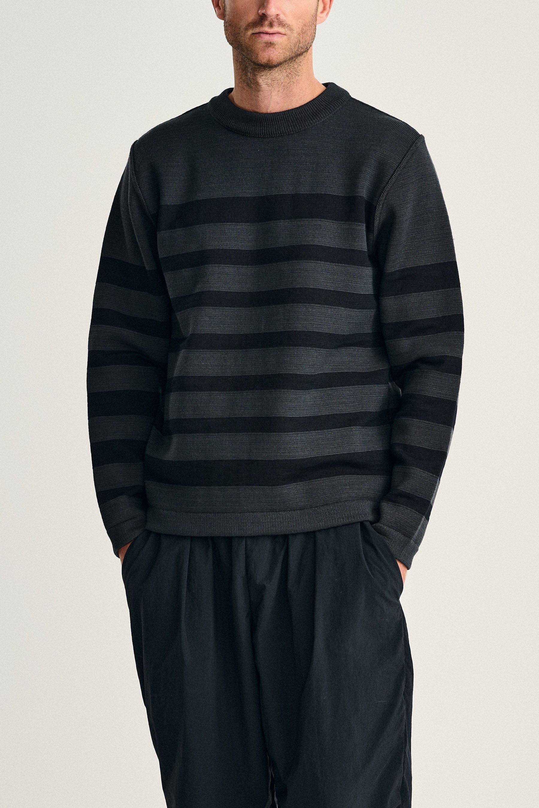 | DESIGN | Kraftigt modificeret NAVAL rund hals. Forstørrede striber i et nyt layout. Rig overfladestruktur fra varierede strikketeknikker. Tung, men behagelig. |