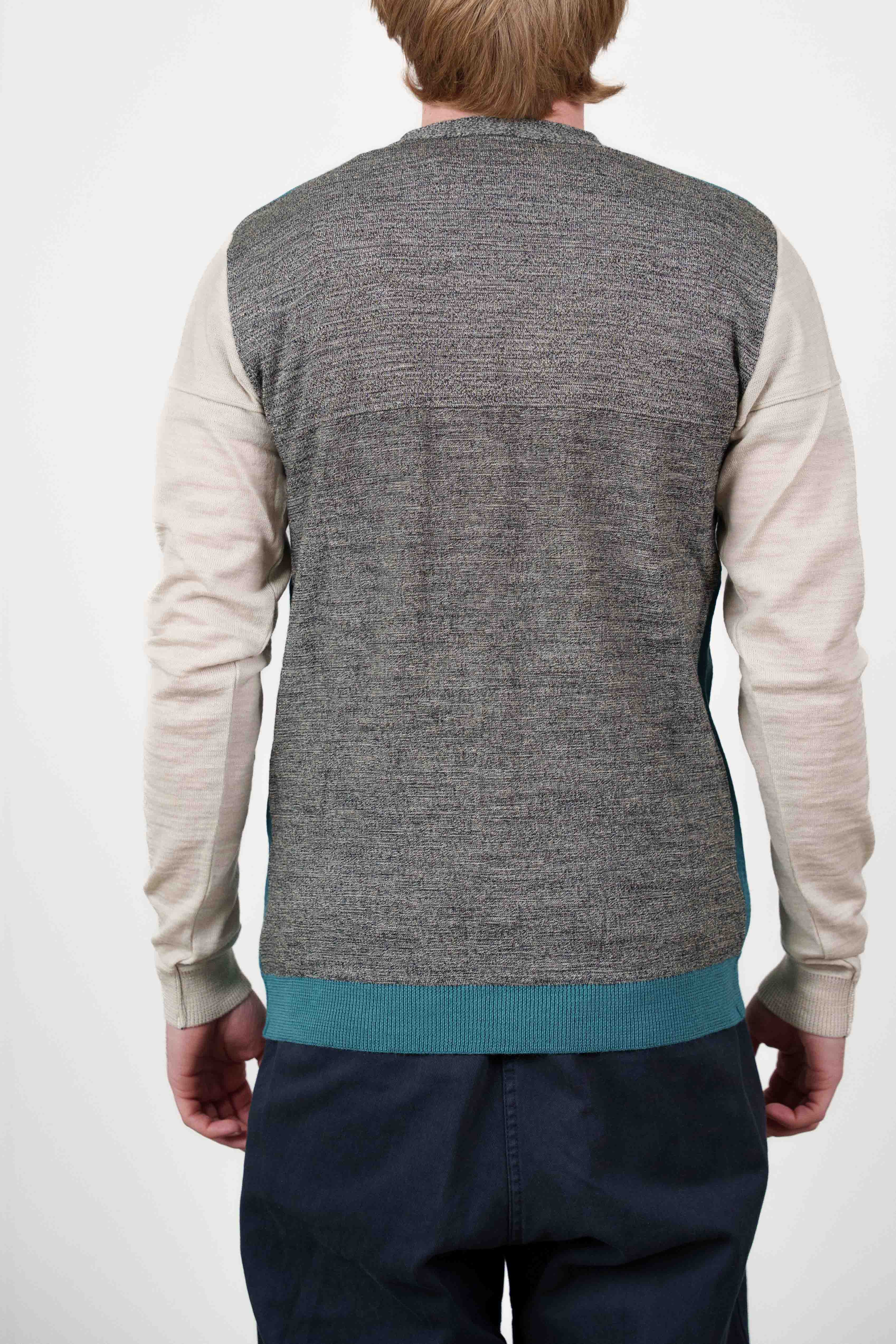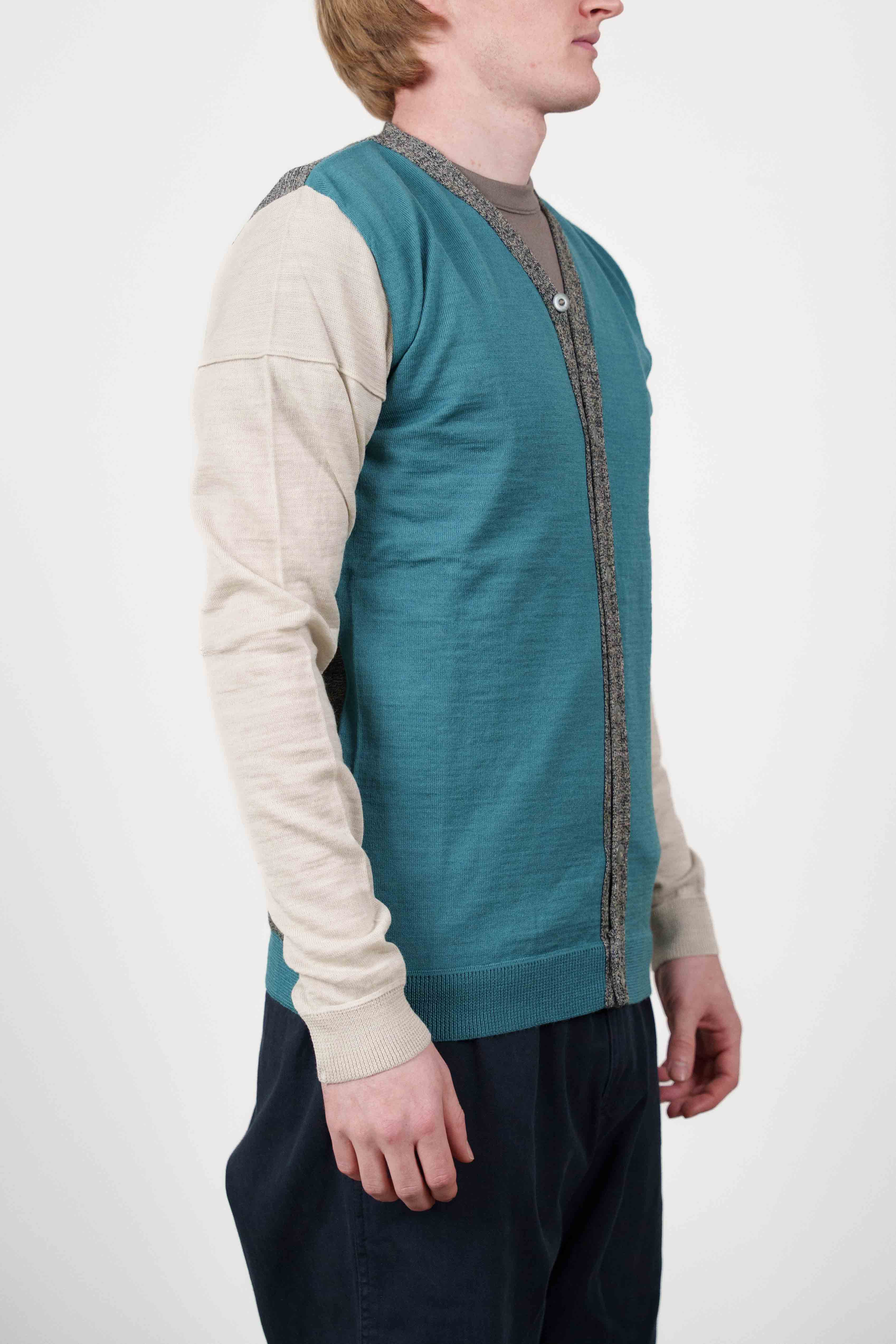 Let strikket cardigan fra W014-kollektionen med en blå/turkis krop, kontrasterende lyse beige ærmer og en knapstolpe. Denne stil er designet med en klassisk V-udskæring.