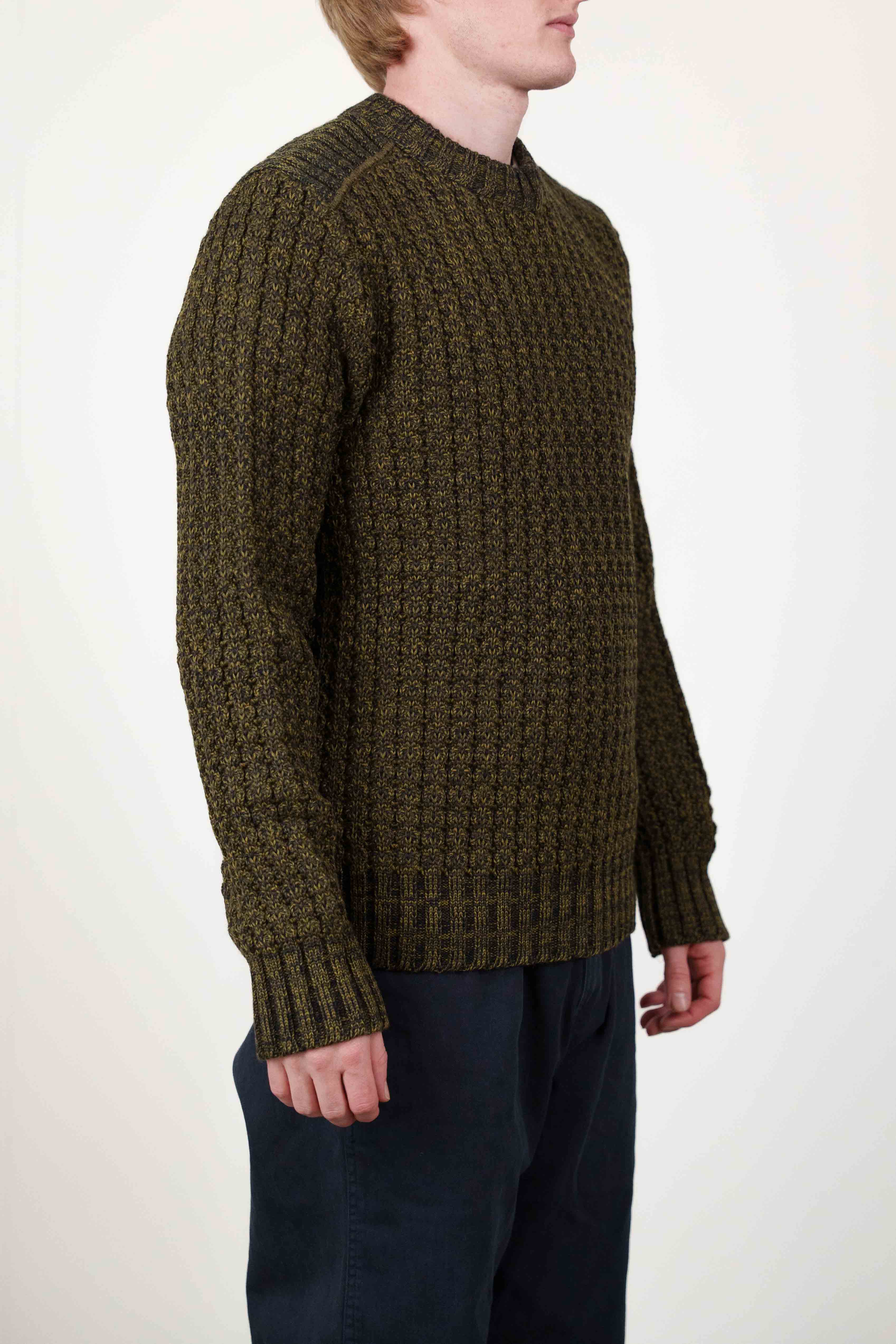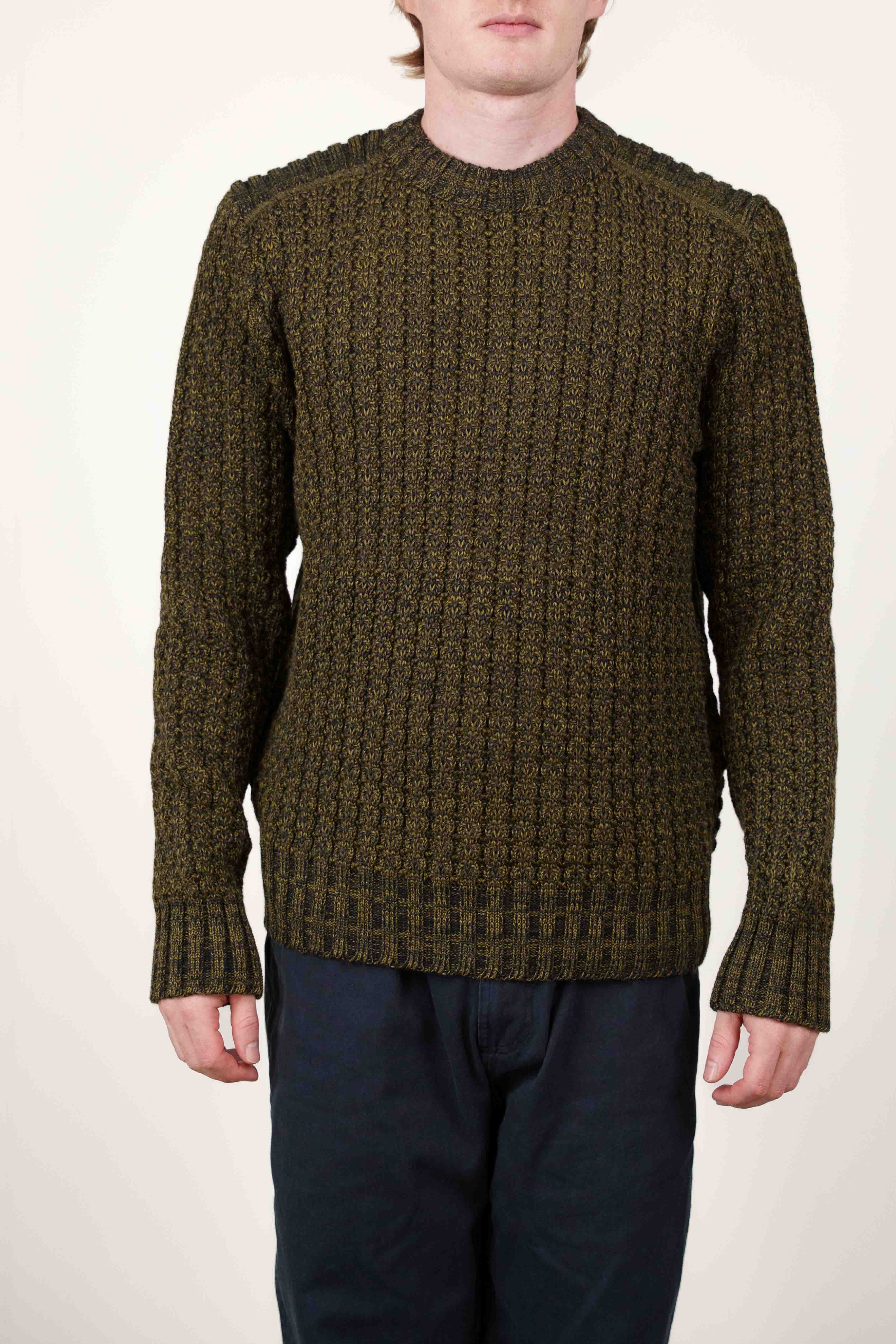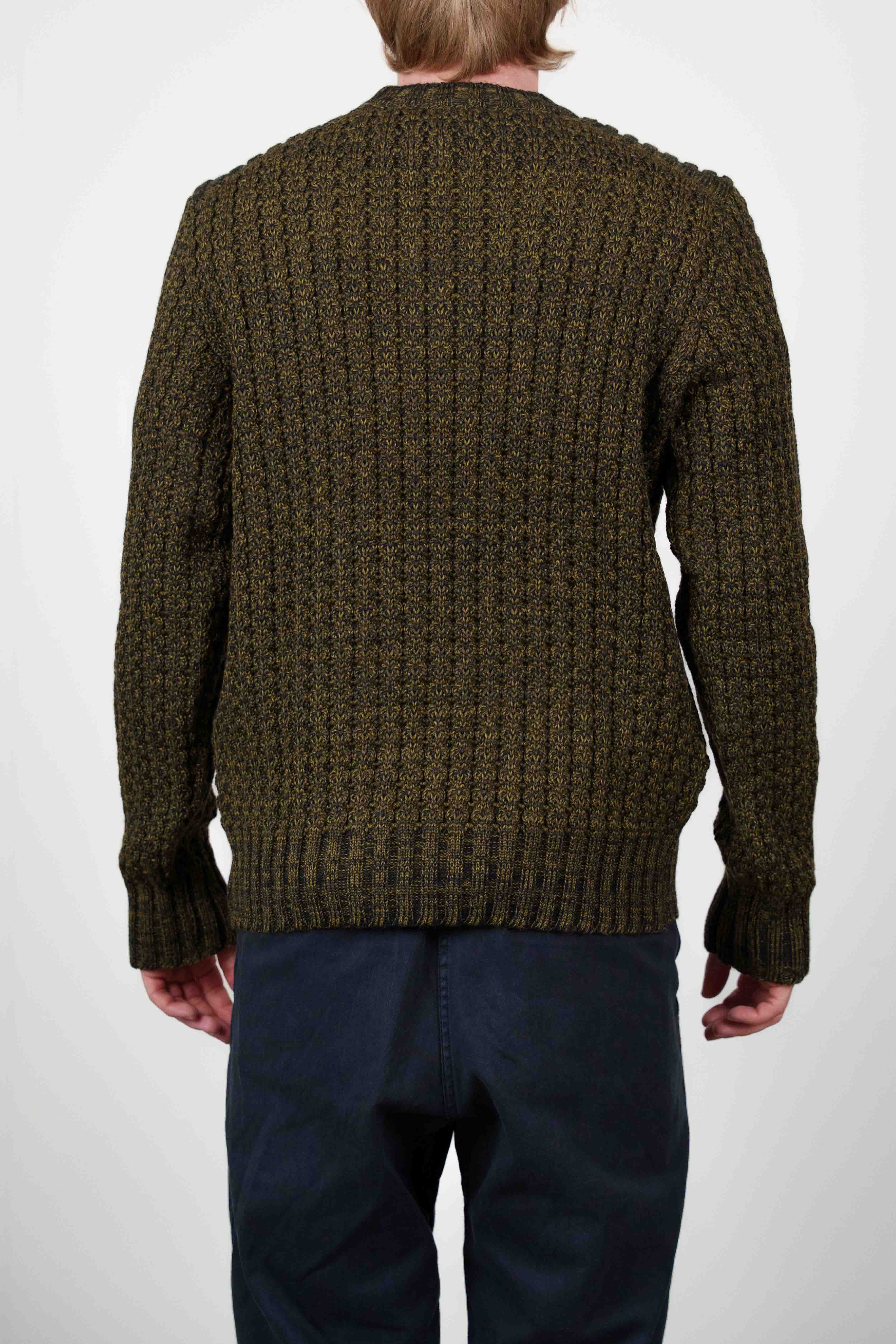 Kraftigt strikket sweater med rund hals fra W013-kollektionen, udført i et marmoreret mørkegrønt og gul-grønt garn. Den har et tekstureret strikmønster med lodrette søjler, der tilføjer en klassisk og defineret detalje.