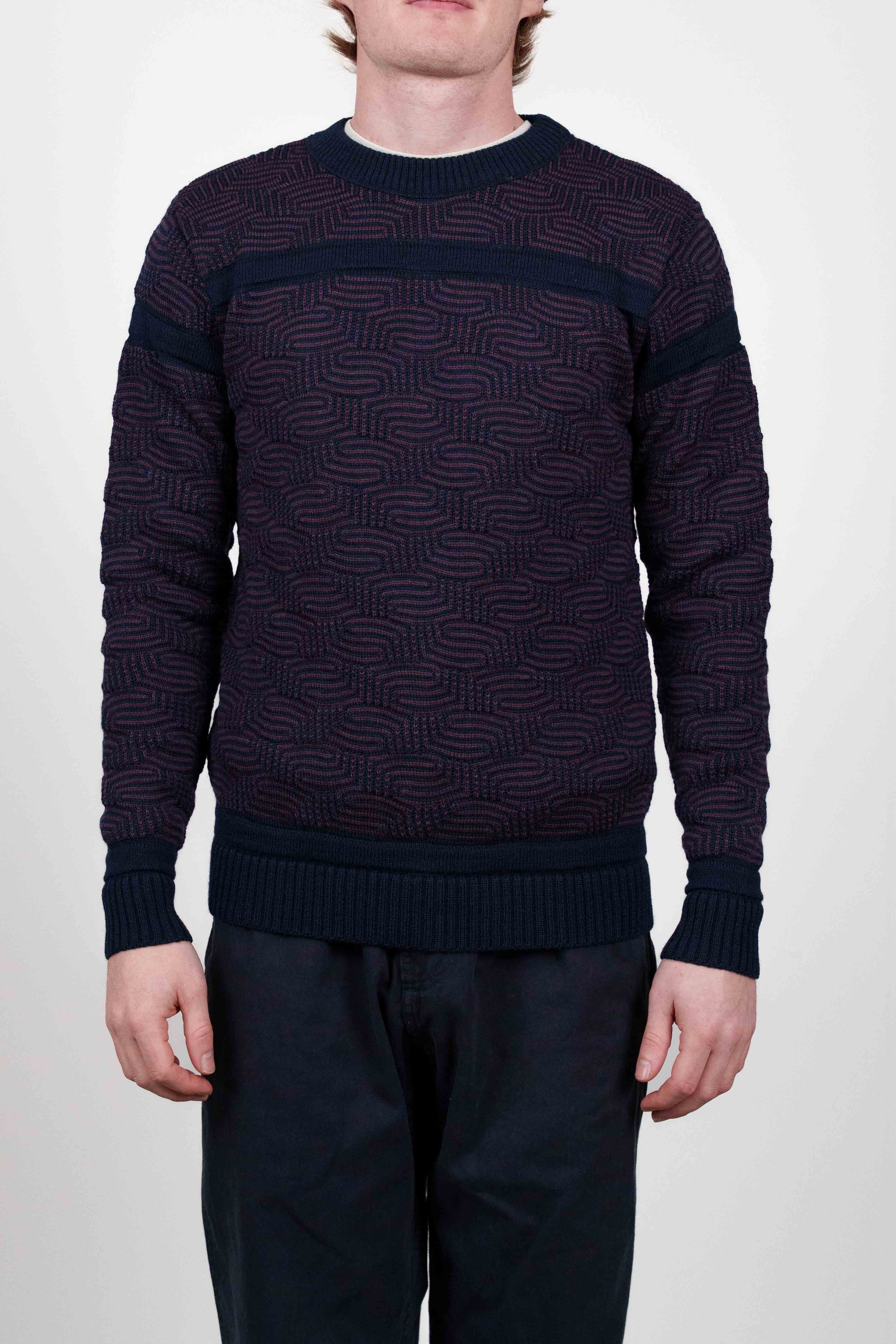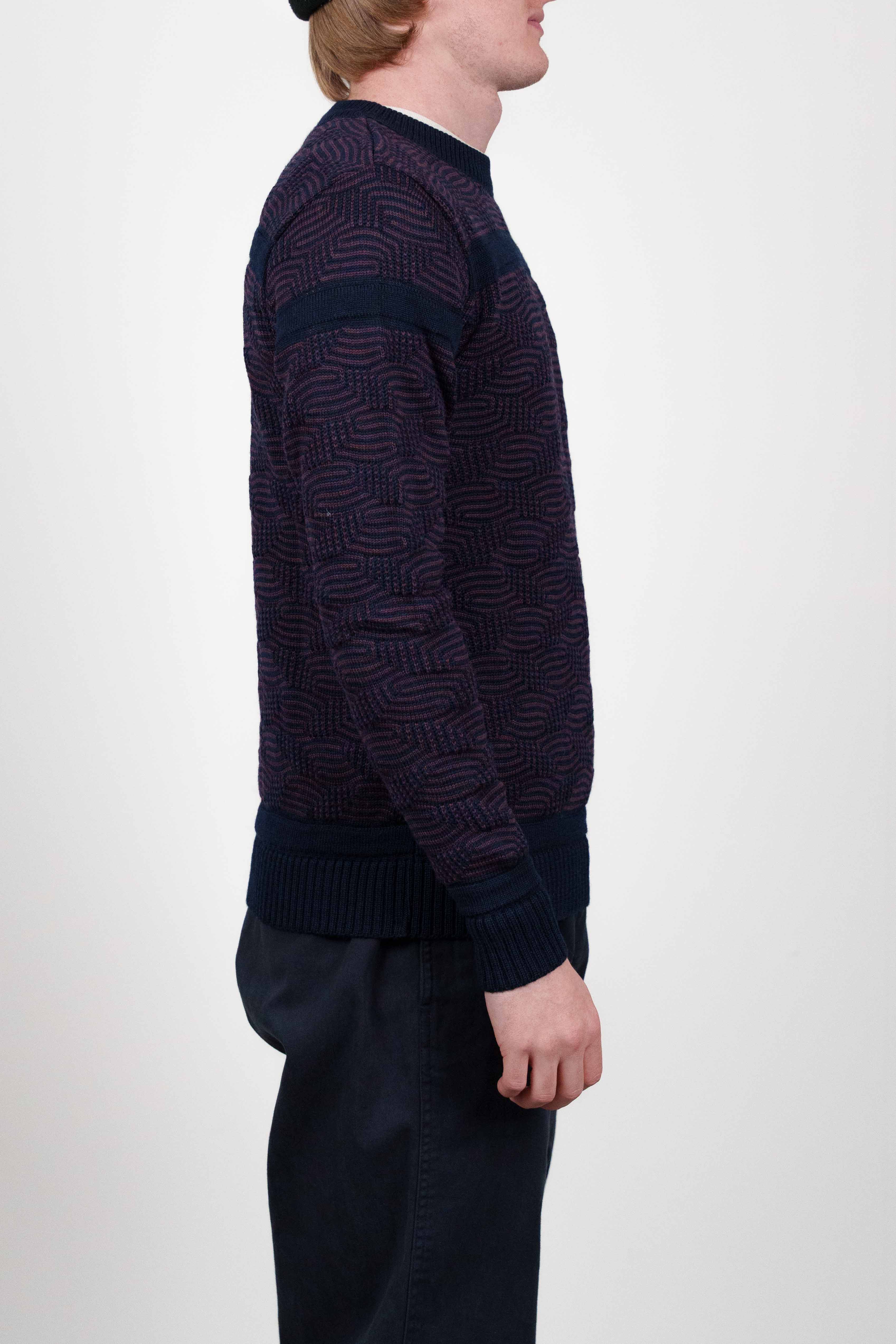 Sweater med rund hals og et tekstureret geometrisk strikmønster i mørk bordeaux på en marineblå baggrund, fra vores W012-kollektion.