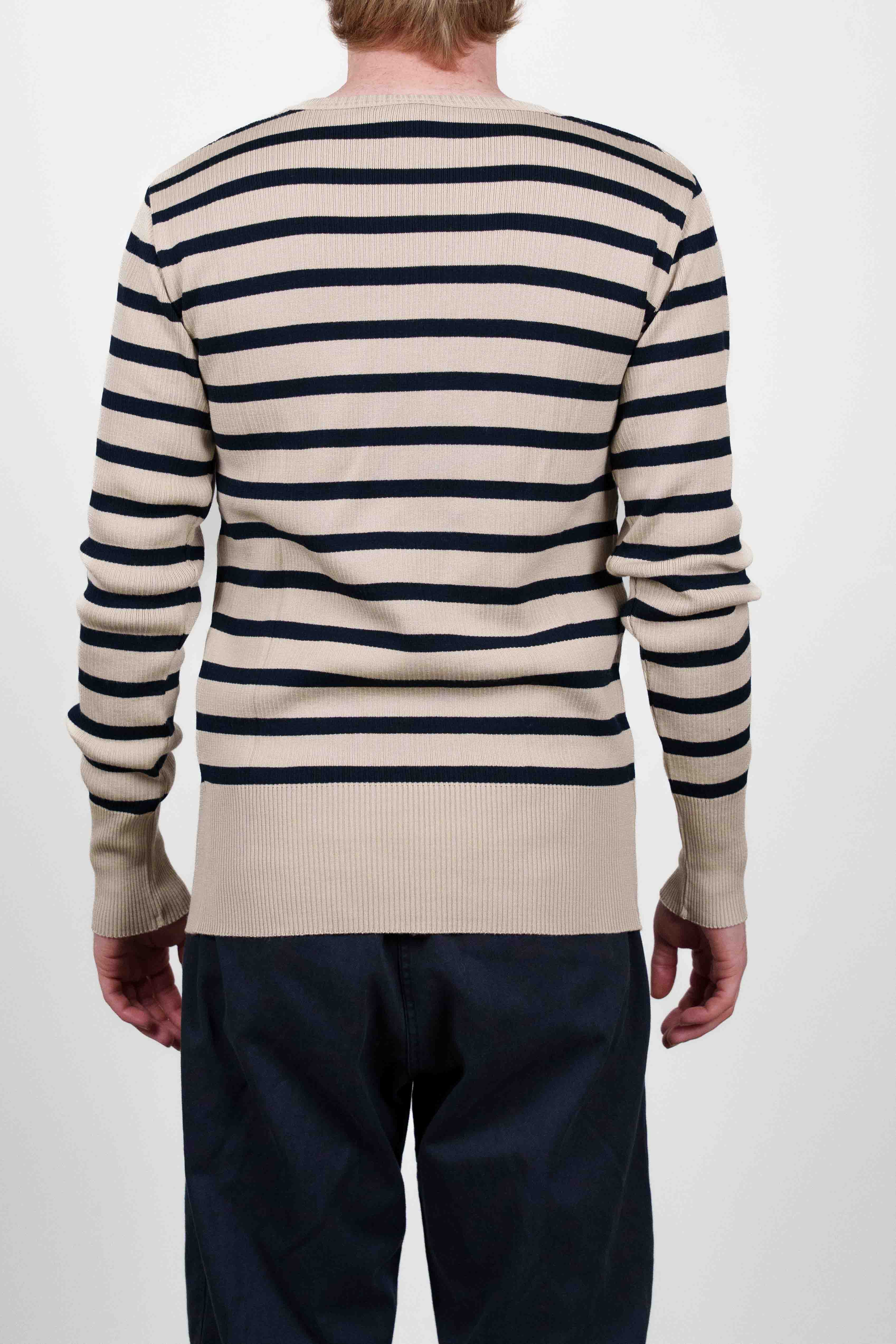 Beige og mørkeblå stribet crew neck sweater fra SS18-kollektionen, designet med en ribstrikket tekstur. Den har en fin ribstrik på krop og ærmer, med mere udtalte ribkanter på manchetter og forneden.