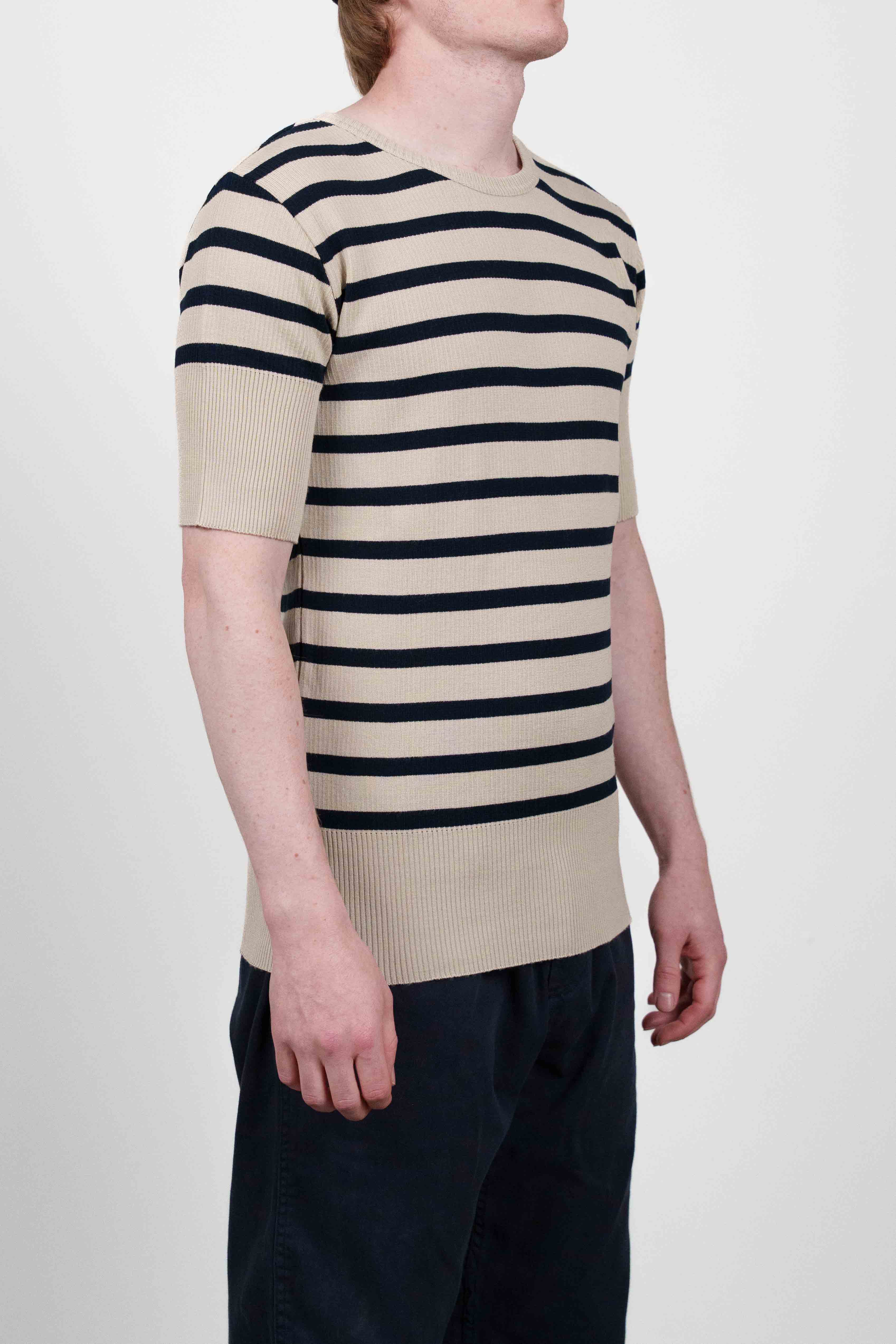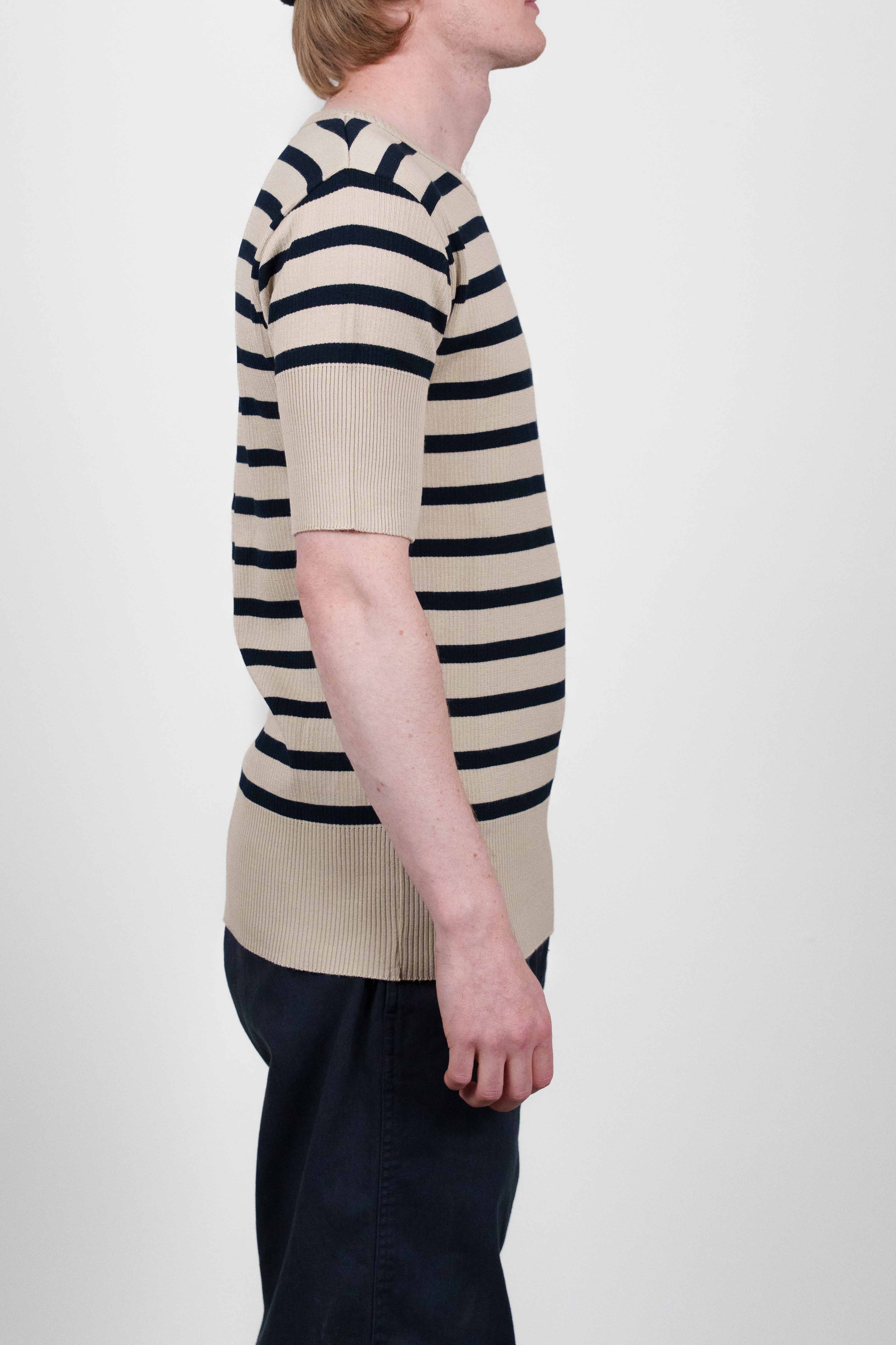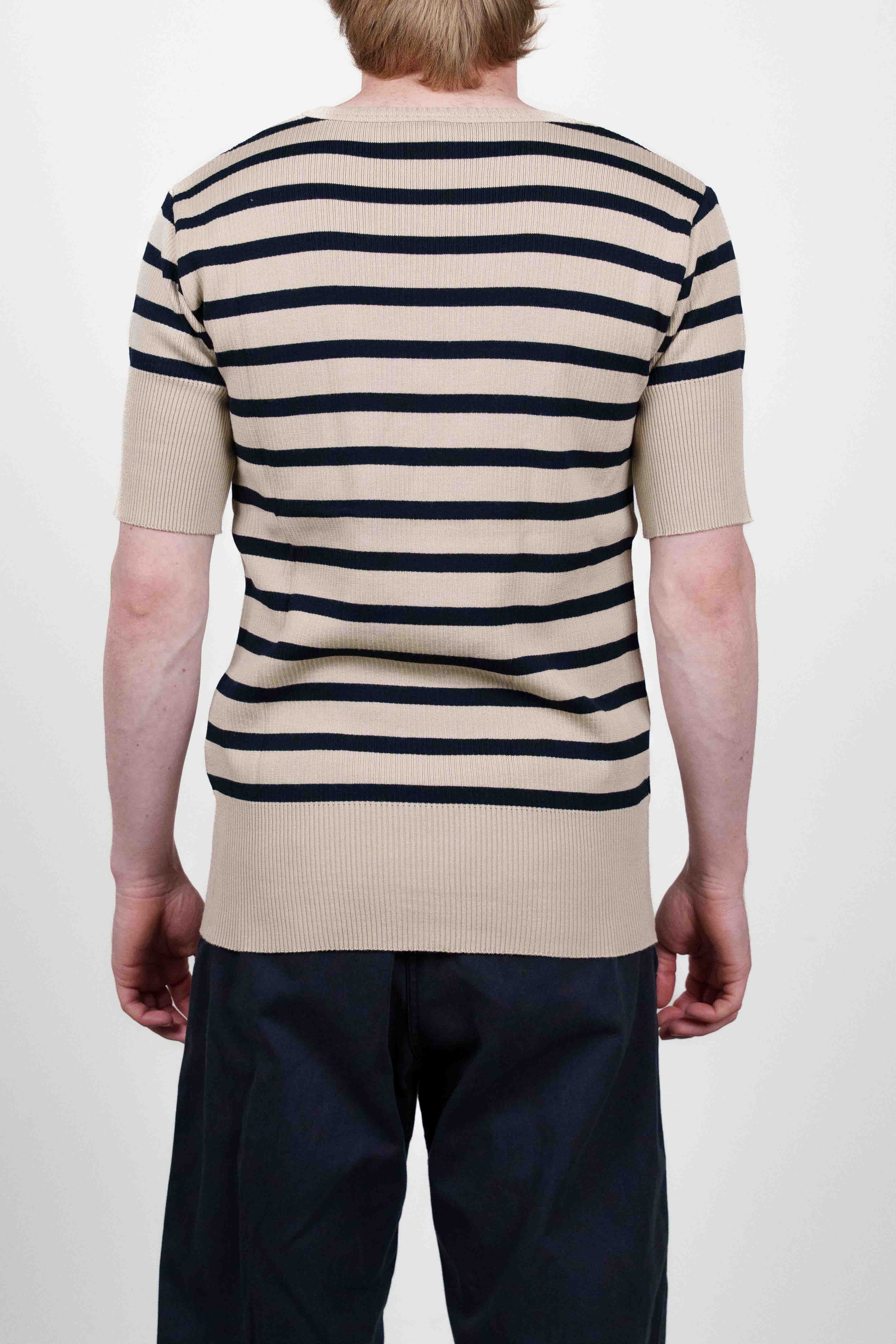 Kortærmet crew neck-sweater fra SS18-kollektionen med vandrette striber i beige og mørkeblå. Udført i en finribbet strik, som sikrer en behagelig og defineret pasform.