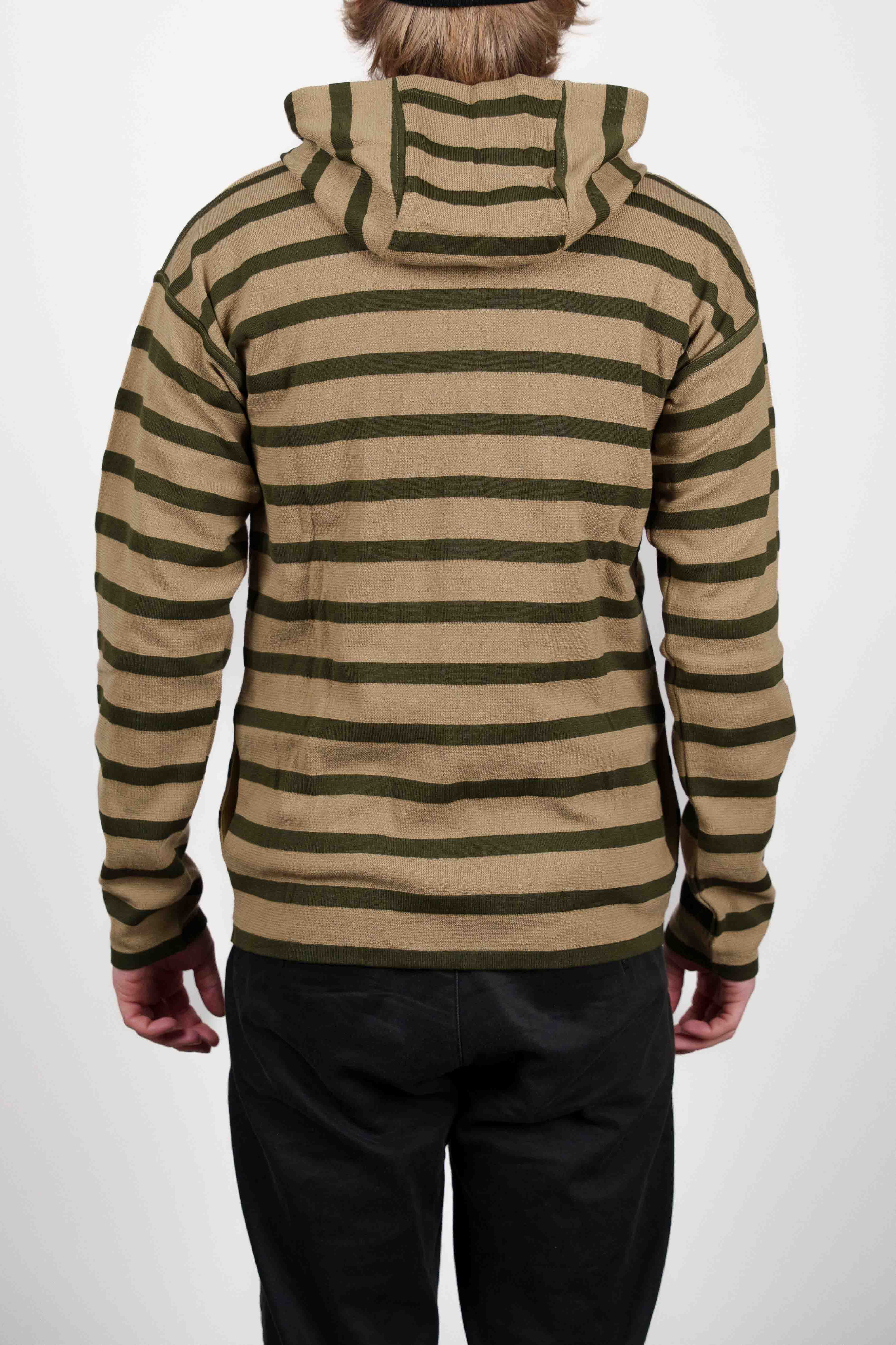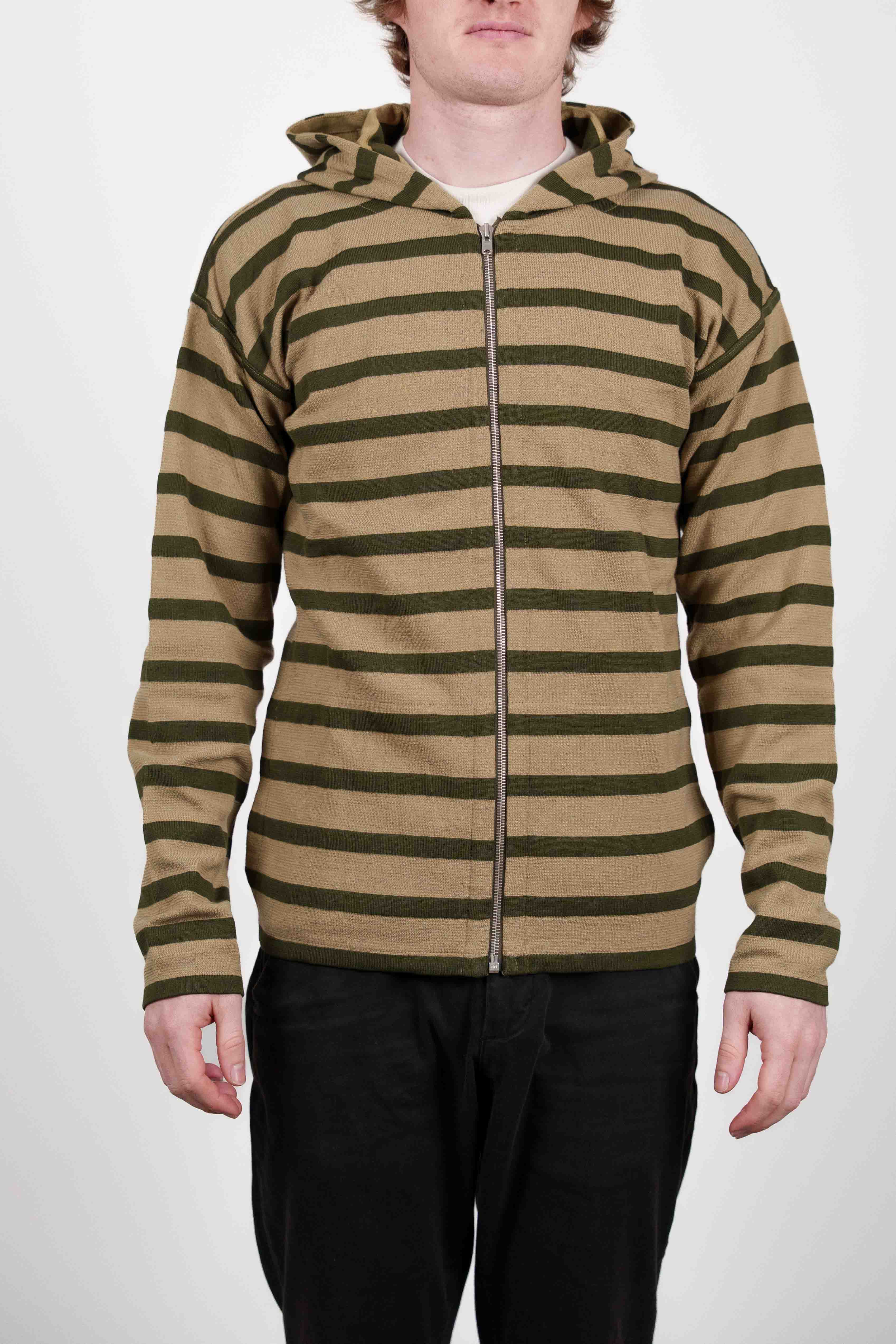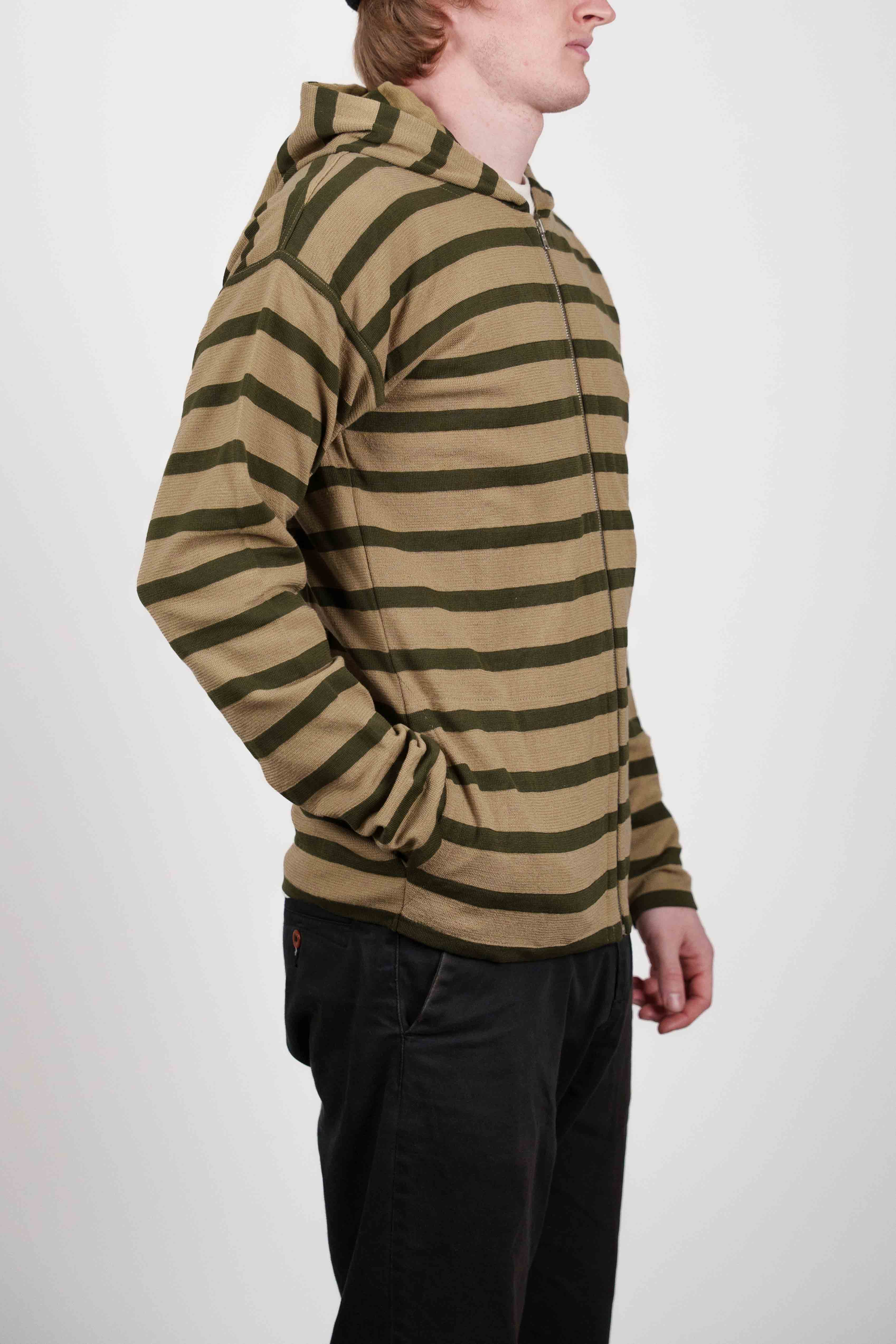 Hættetrøje med lynlås fra SS18-kollektionen, fremstillet i en struktureret strik med vandrette striber i olivengrøn og tan og fuldendt med en lynlås i metal-look.