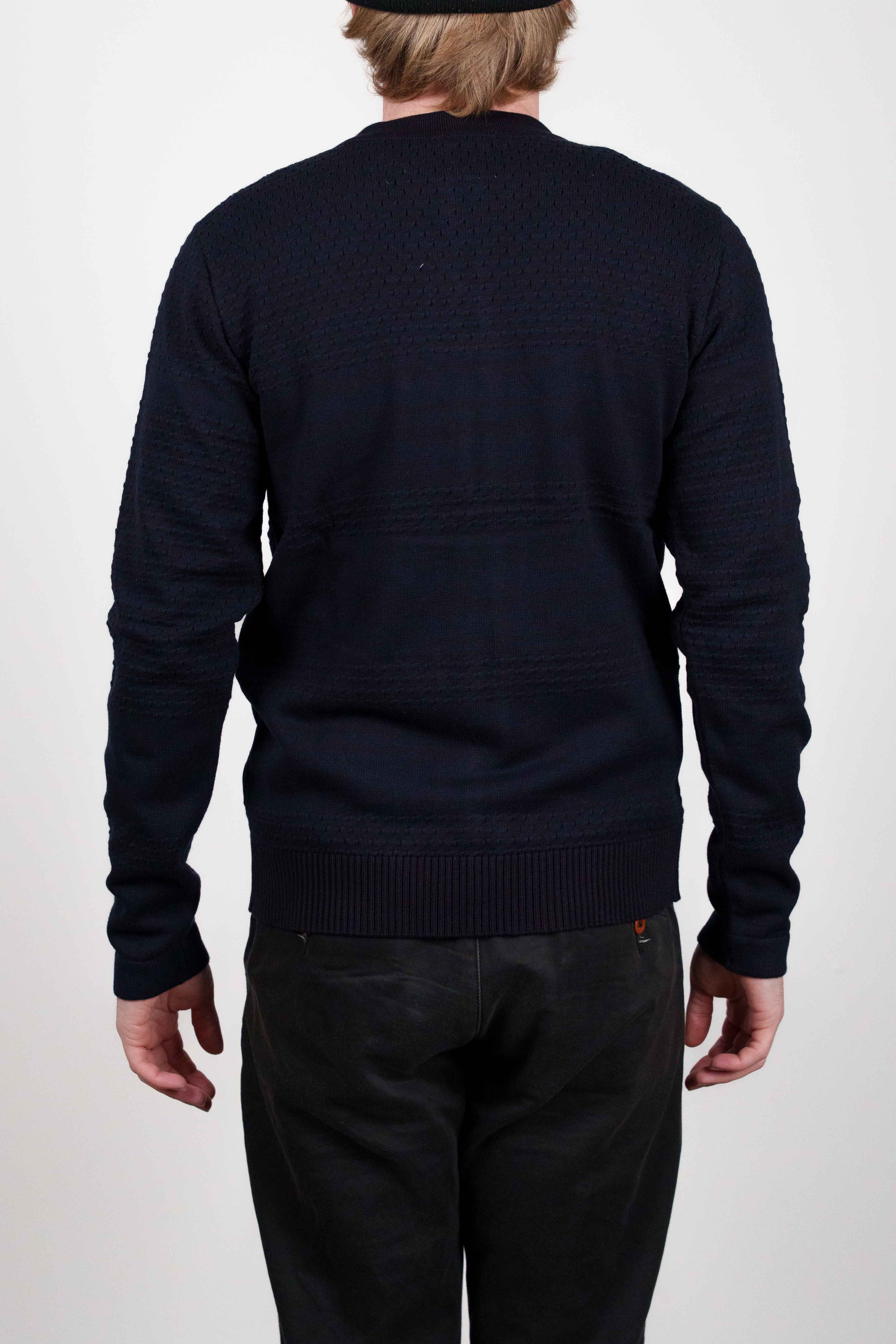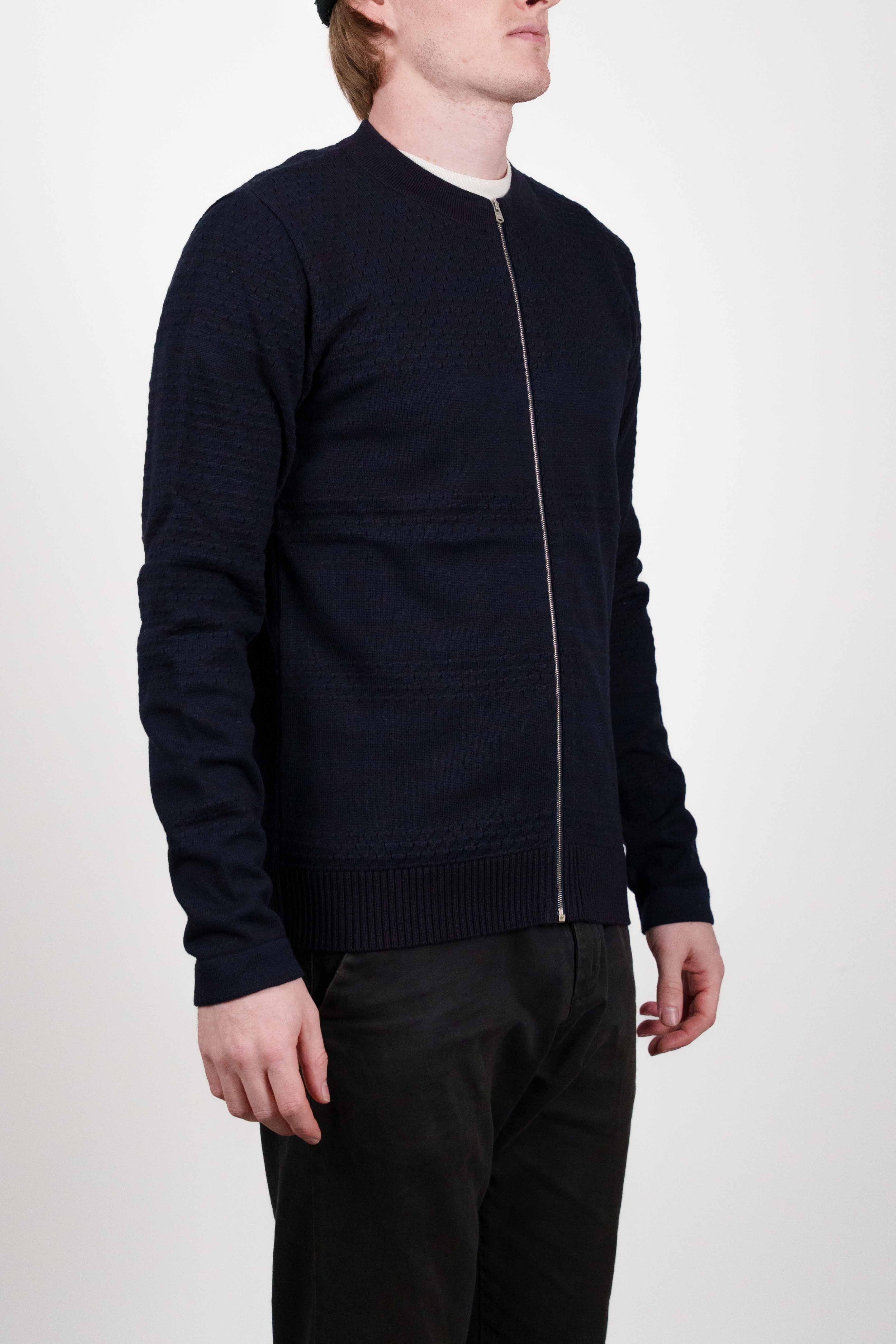 Marineblå full-zip sweater fra SS13-kollektionen med et diskret, tekstureret strikmønster. Den har en ribbet krave, manchetter og kant og lukkes med en metallynlås foran.