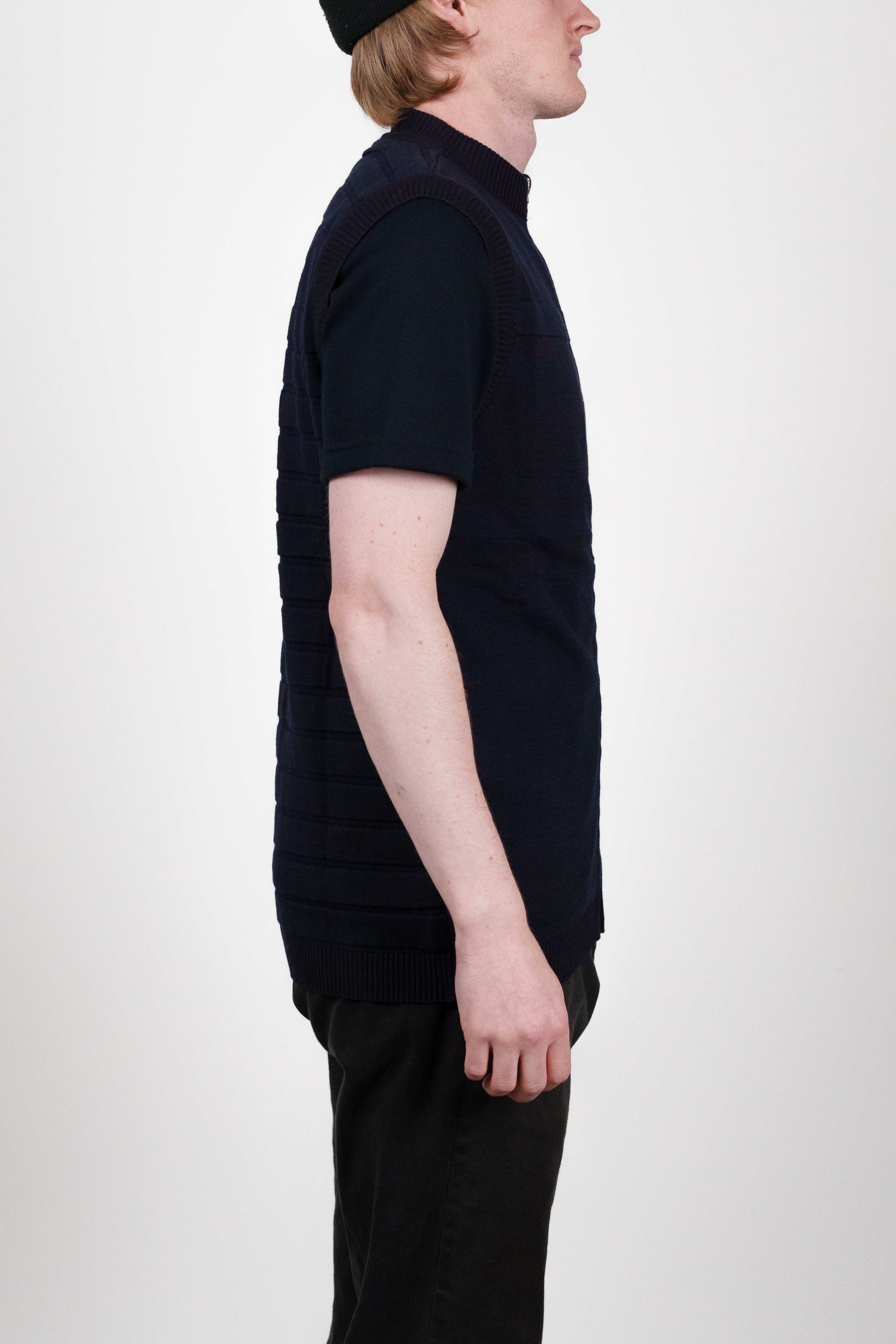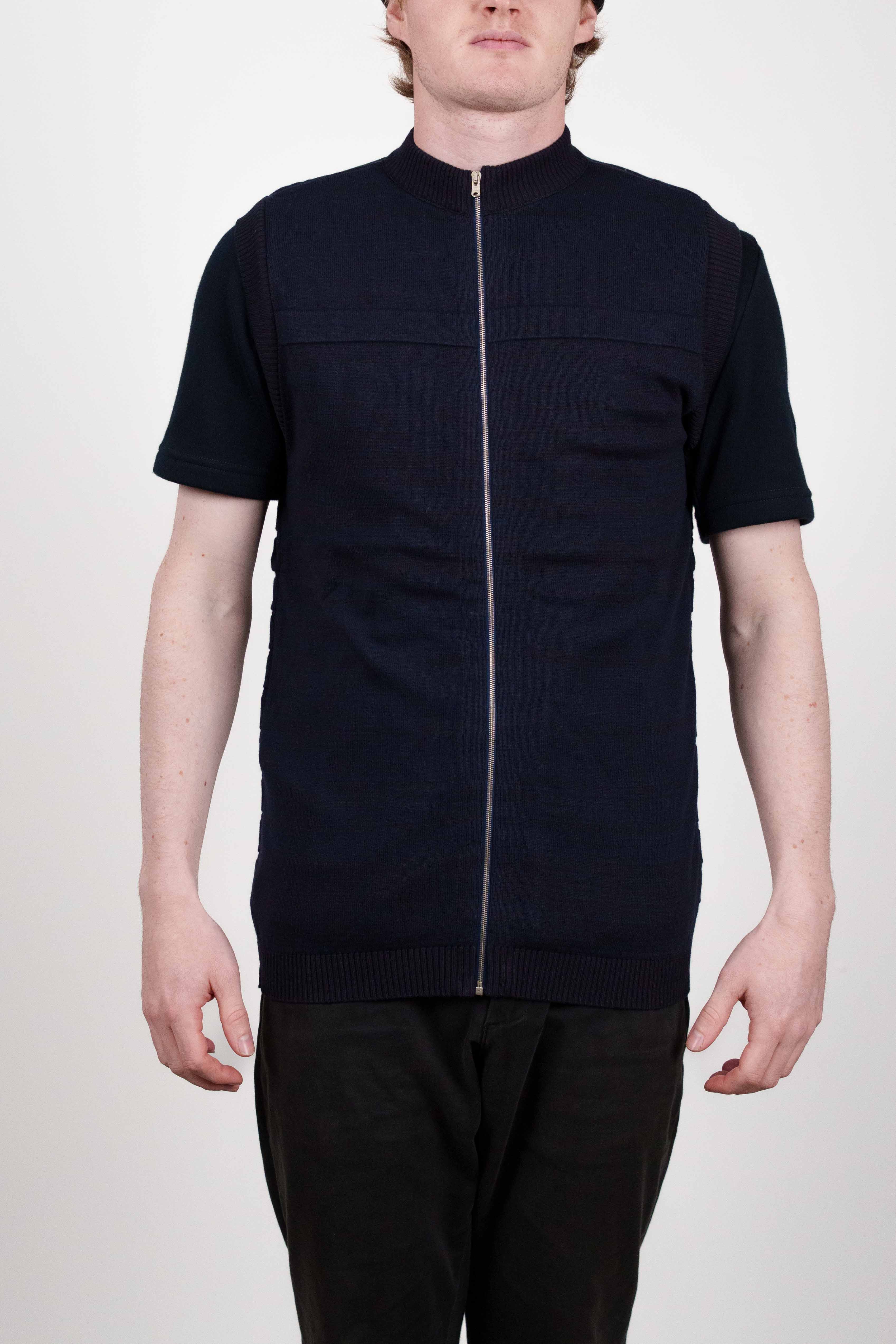 Mørkeblå ribstrikket vest fra SS13-kollektionen med høj hals og en gennemgående metallynlås.