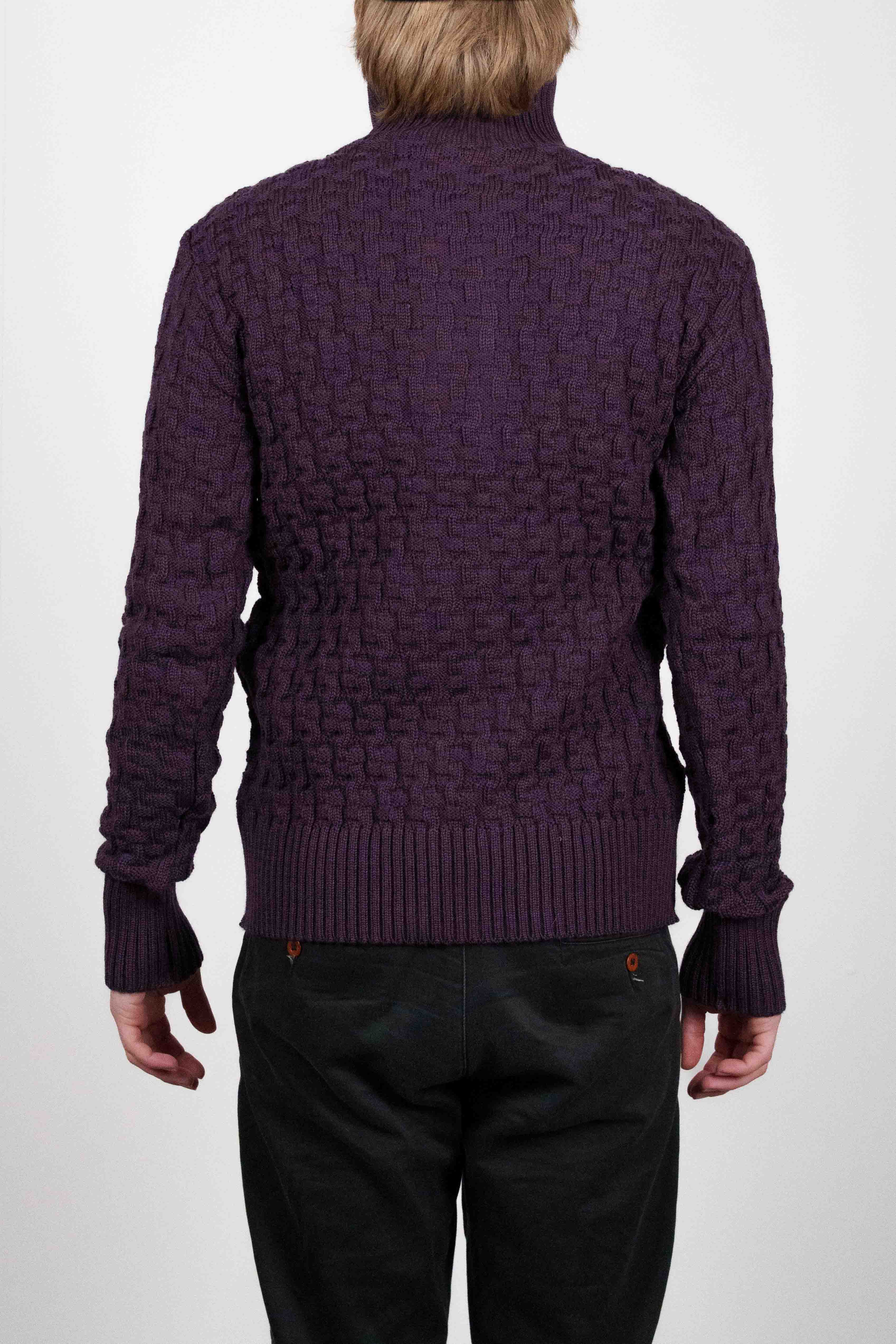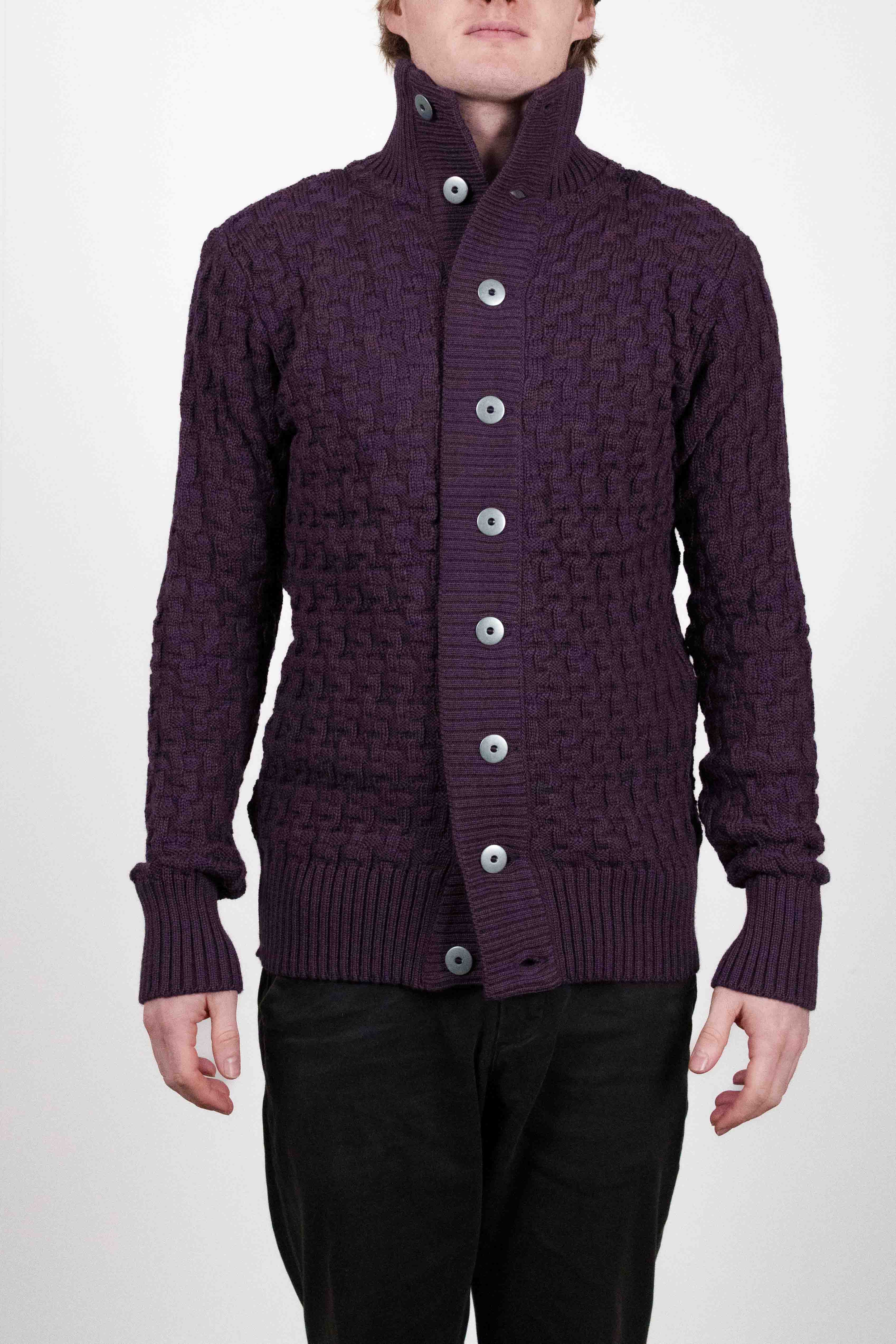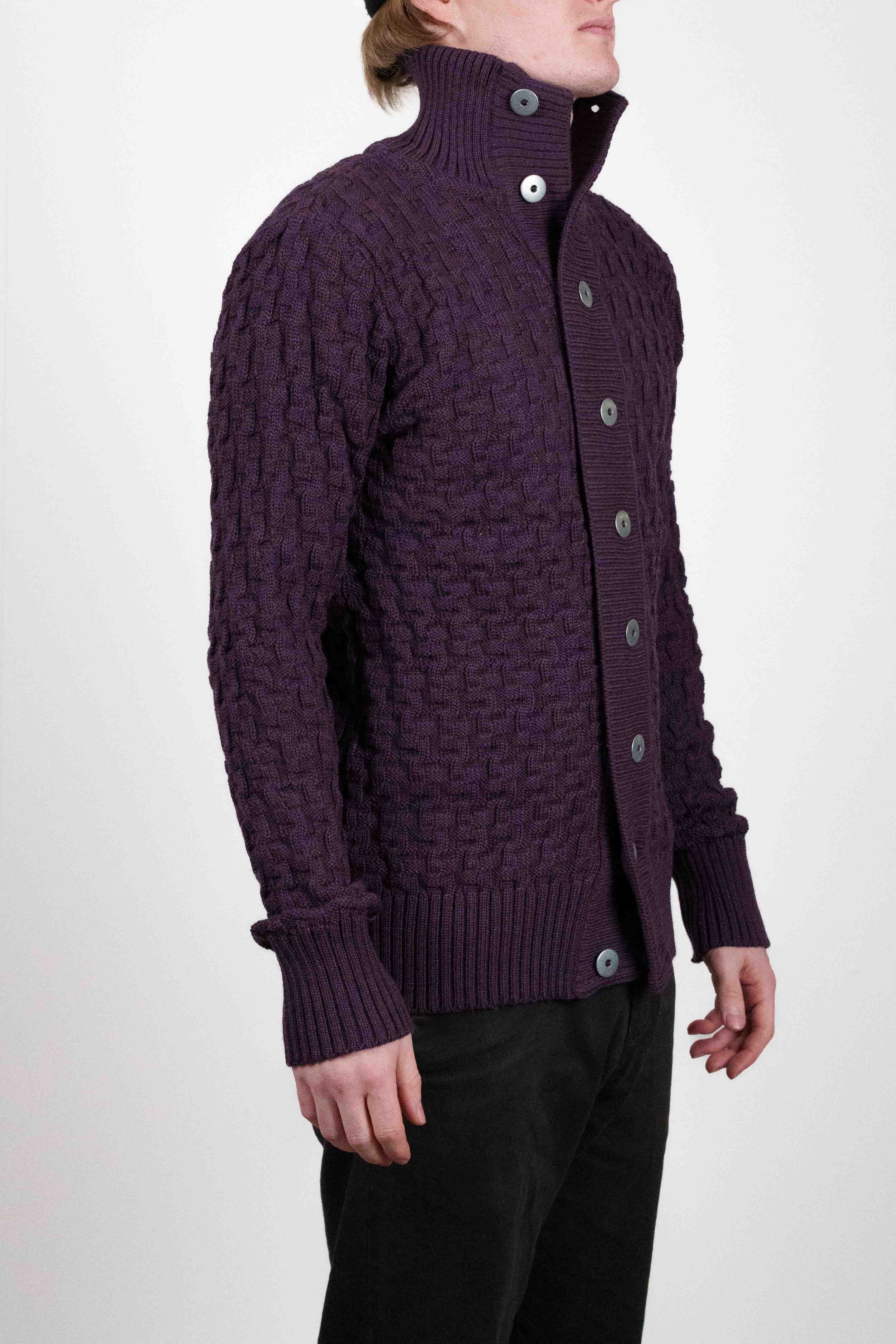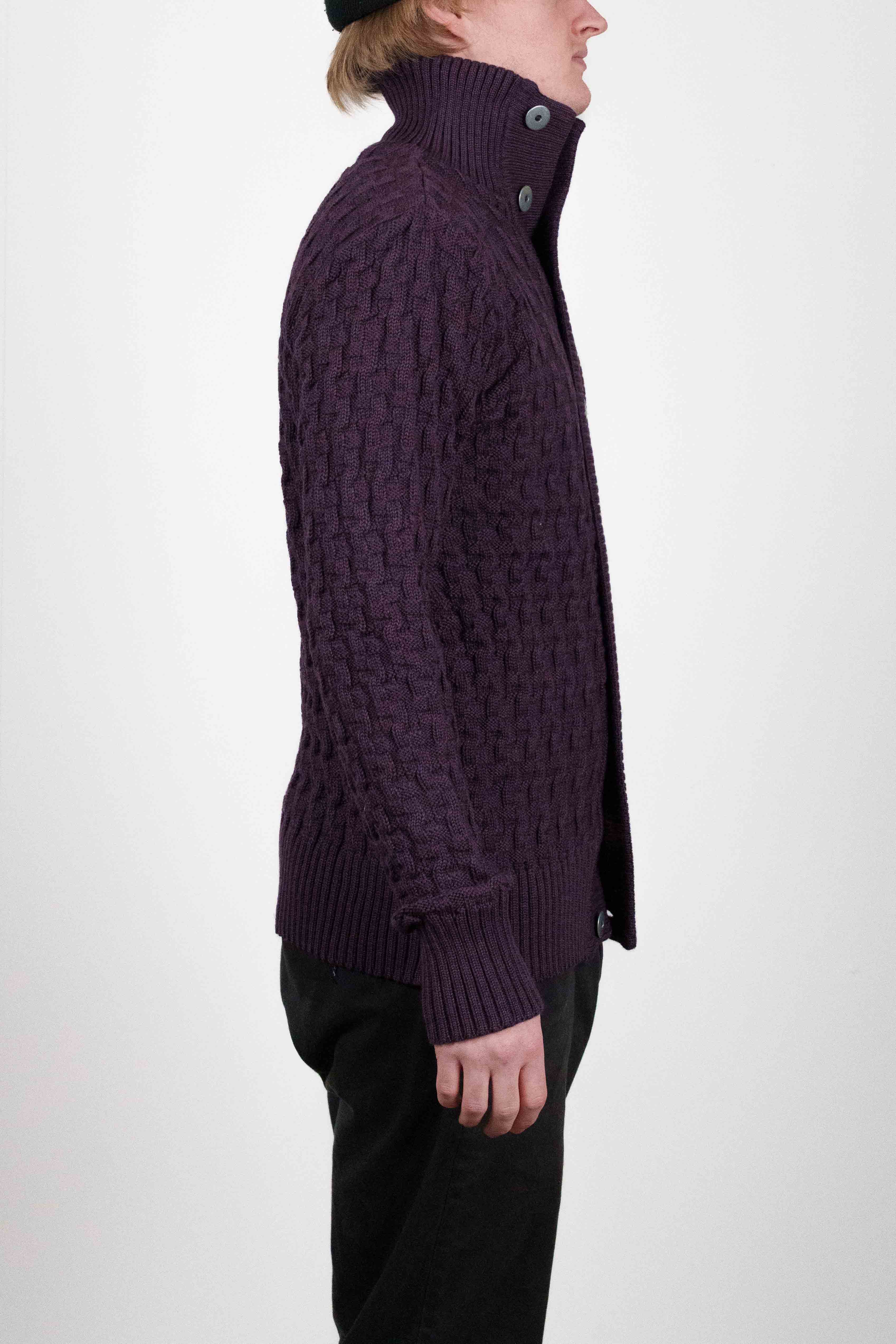 Mørklilla, tekstureret strikcardigan fra W014-kollektionen med en høj, knappet krave. Cardiganen har et fremtrædende kurvefletmønster på kroppen og ribstrikkede manchetter, søm samt knapstolpe, der lukkes med metalknapper.