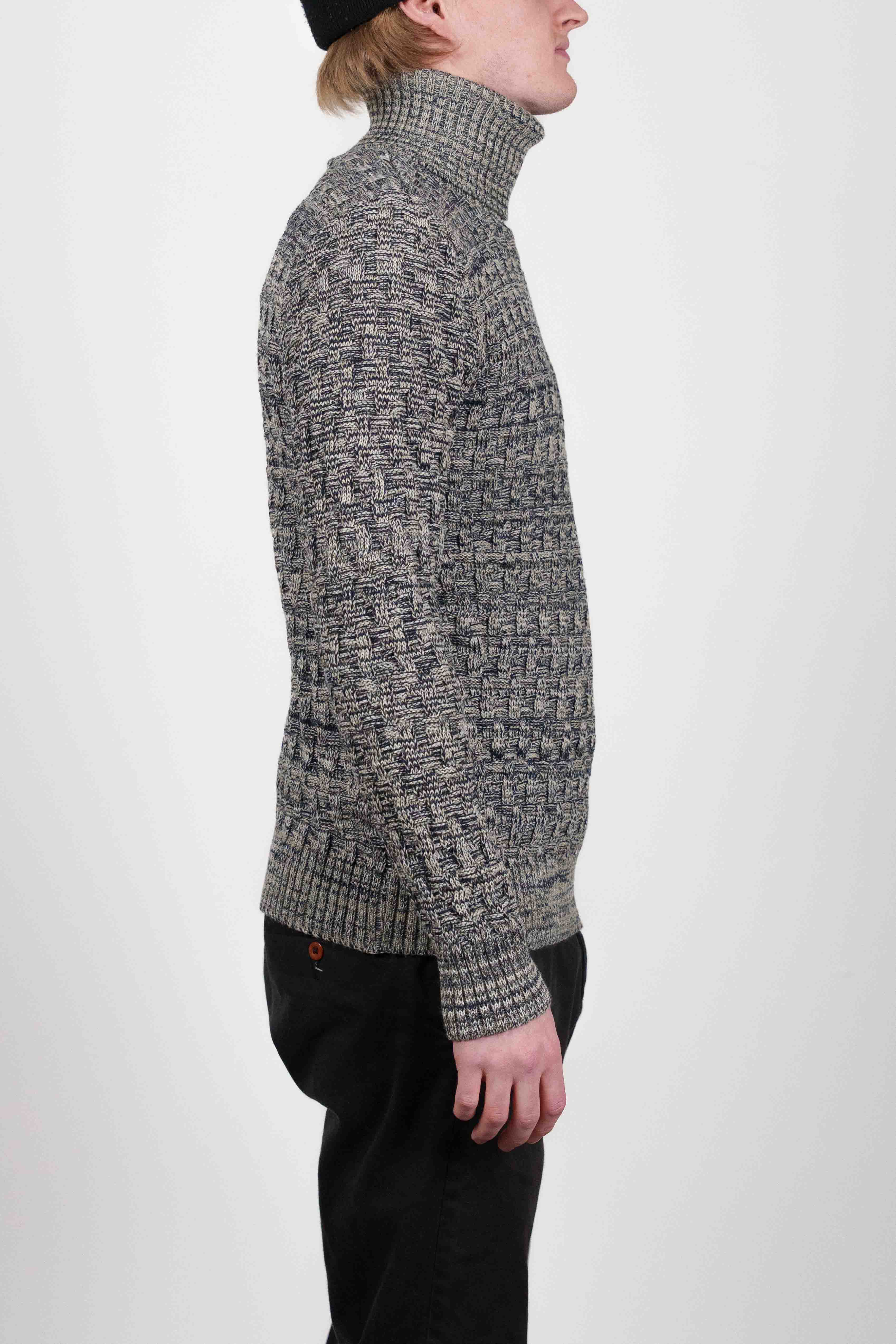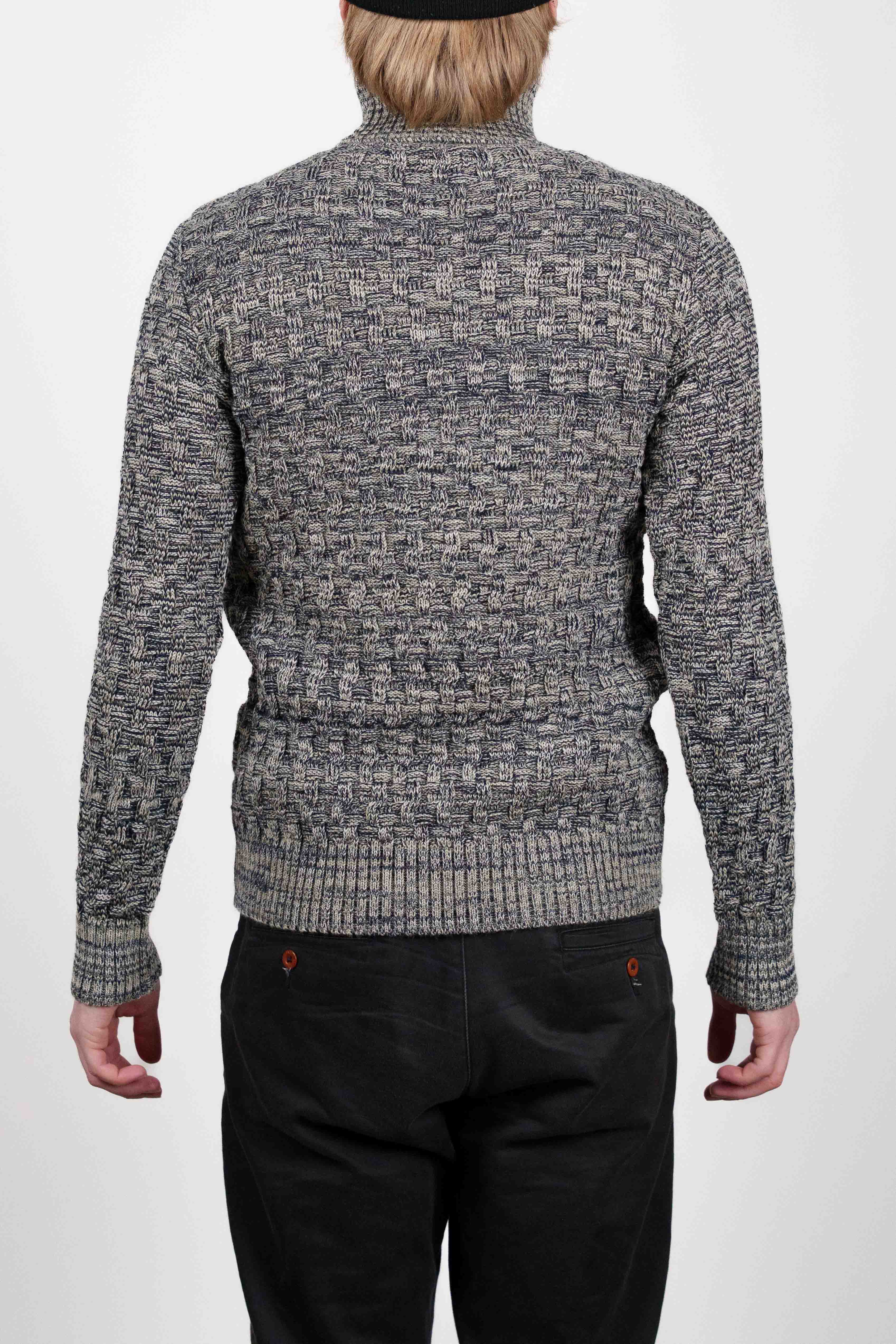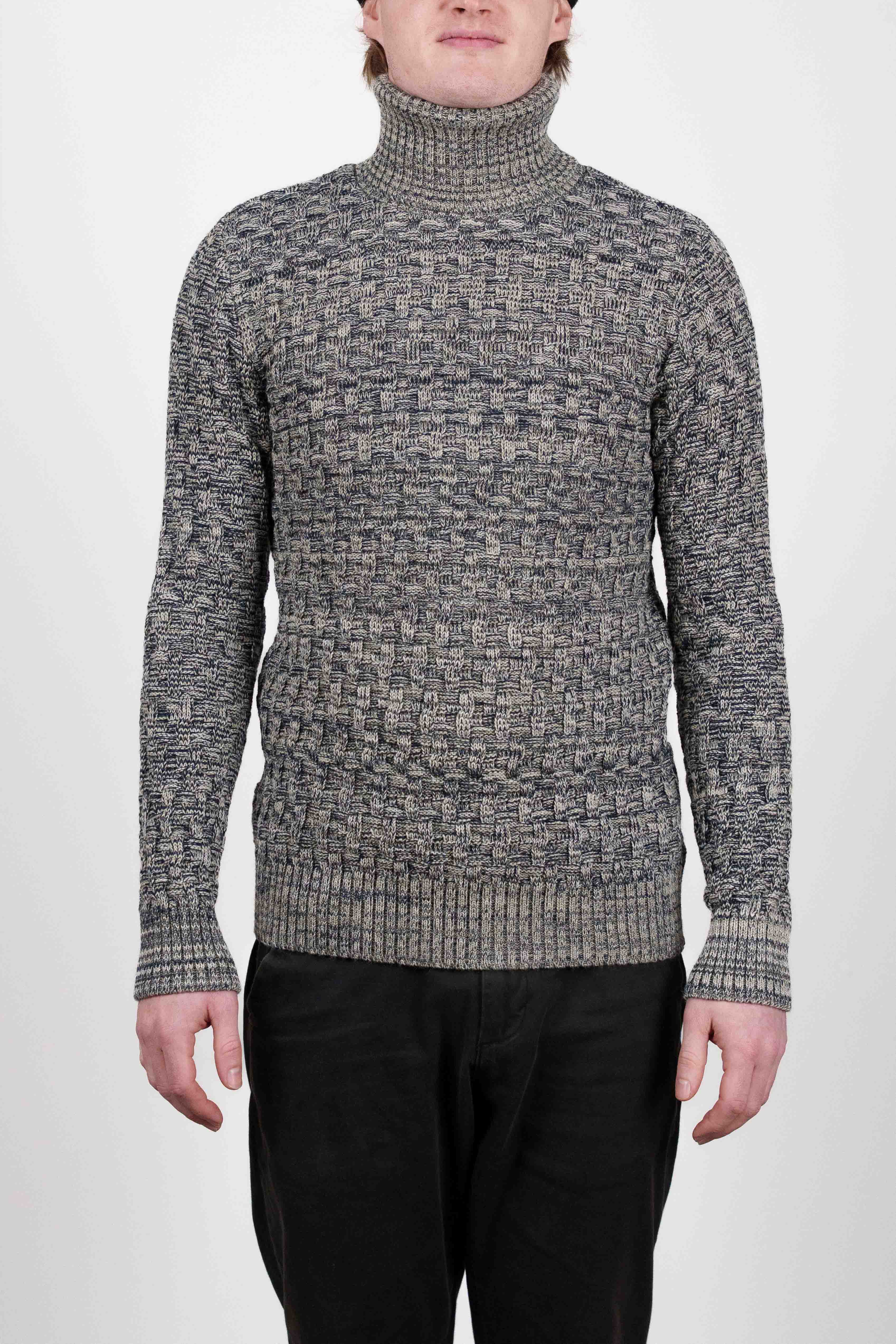 Den har en ribstrikket rullekrave, manchetter og kant, som giver et hyggeligt og struktureret look.
