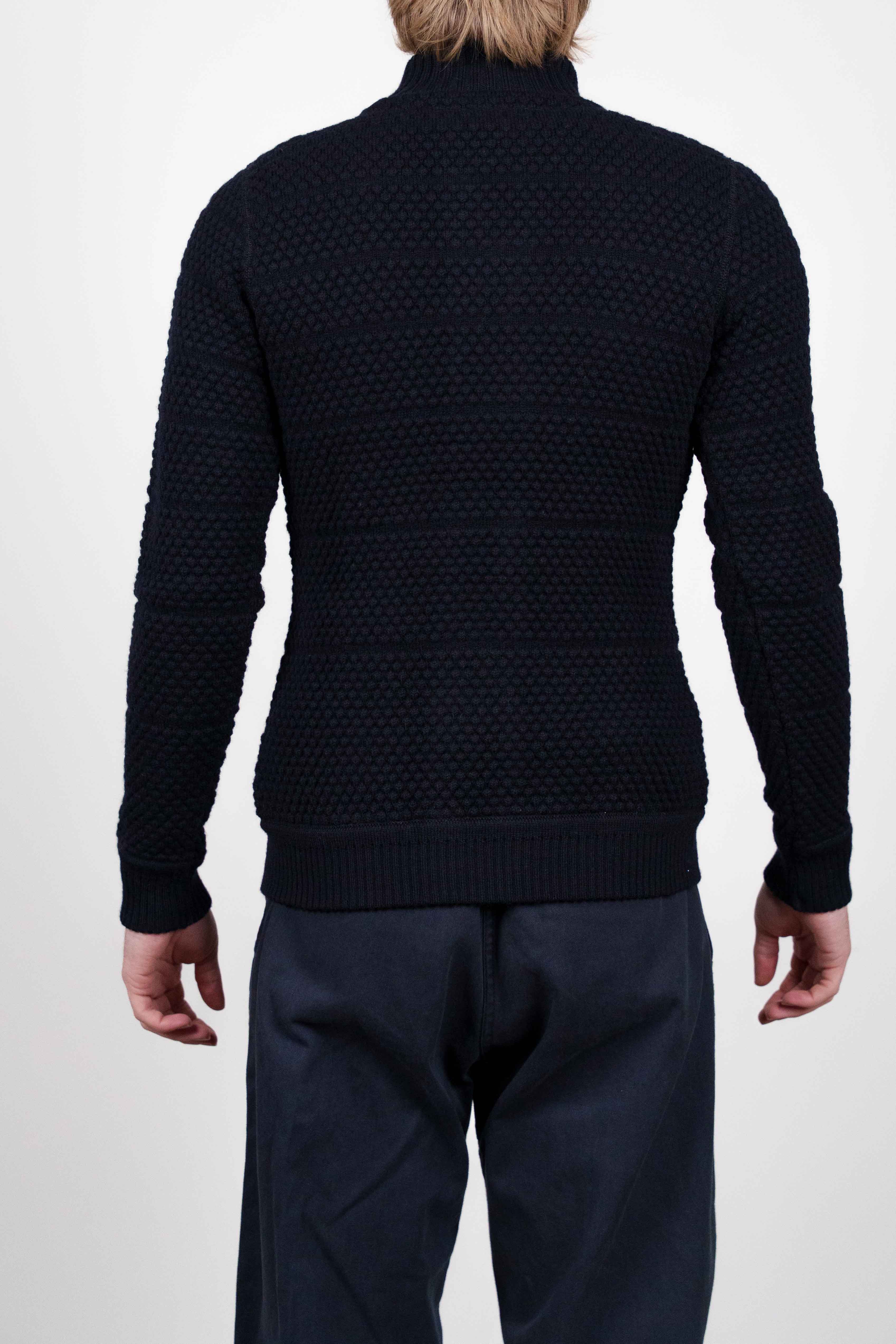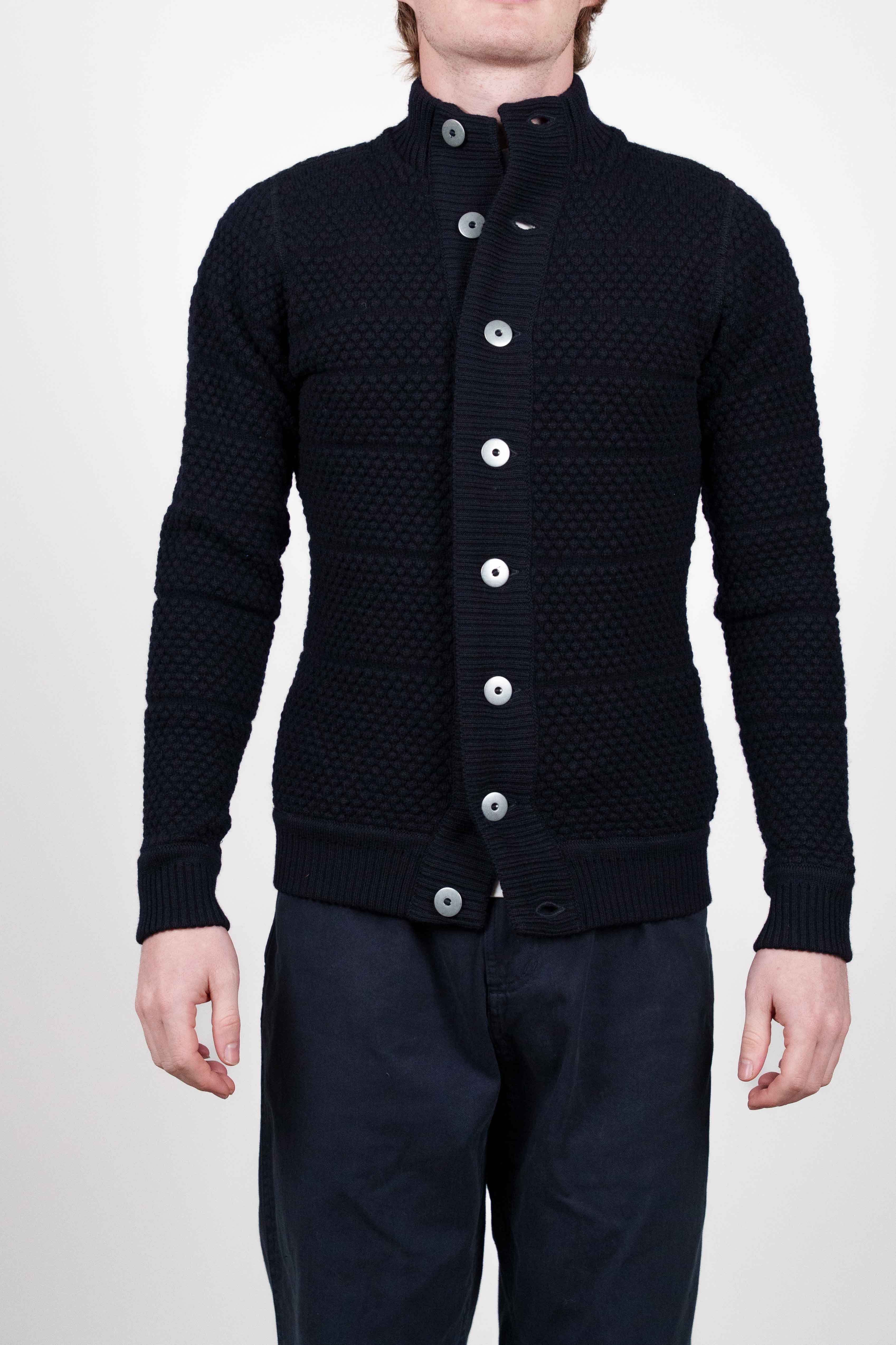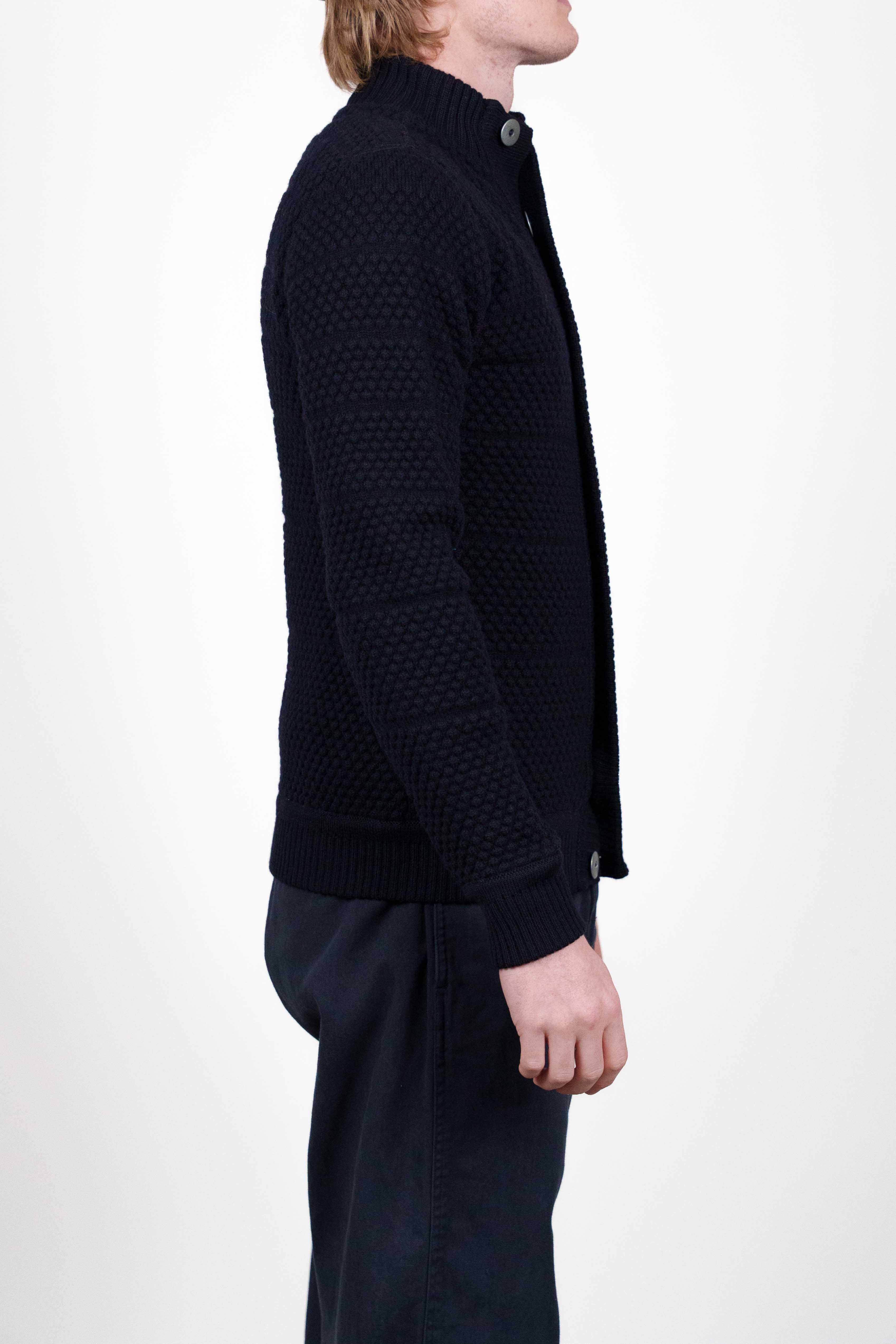 Sort, tekstureret strikcardigan fra W012-kollektionen med høj hals og knaplukning foran. Den har et karakteristisk boblestrikmønster på krop og ærmer samt ribkanter på krave, stolpelukning, manchetter og forneden.