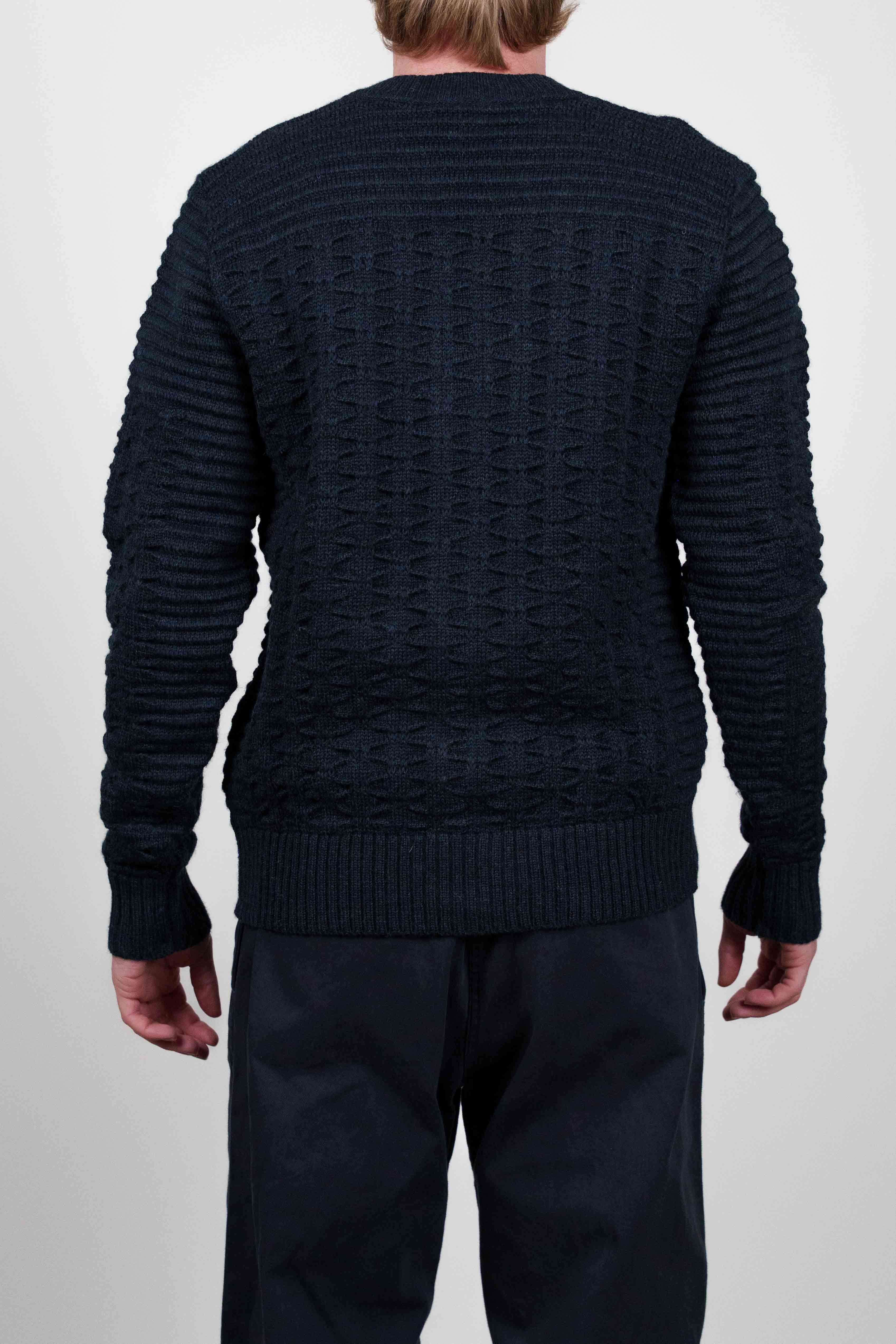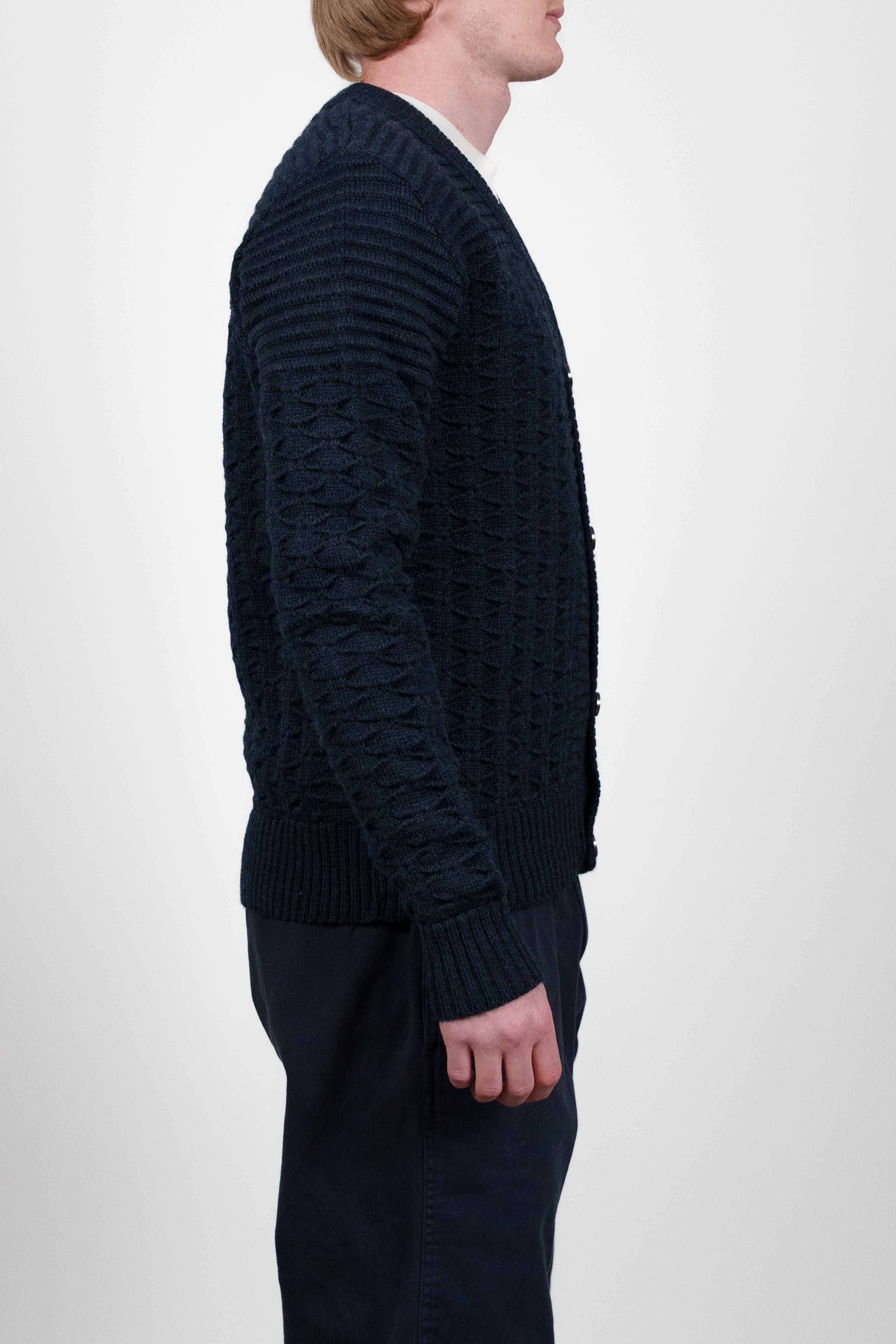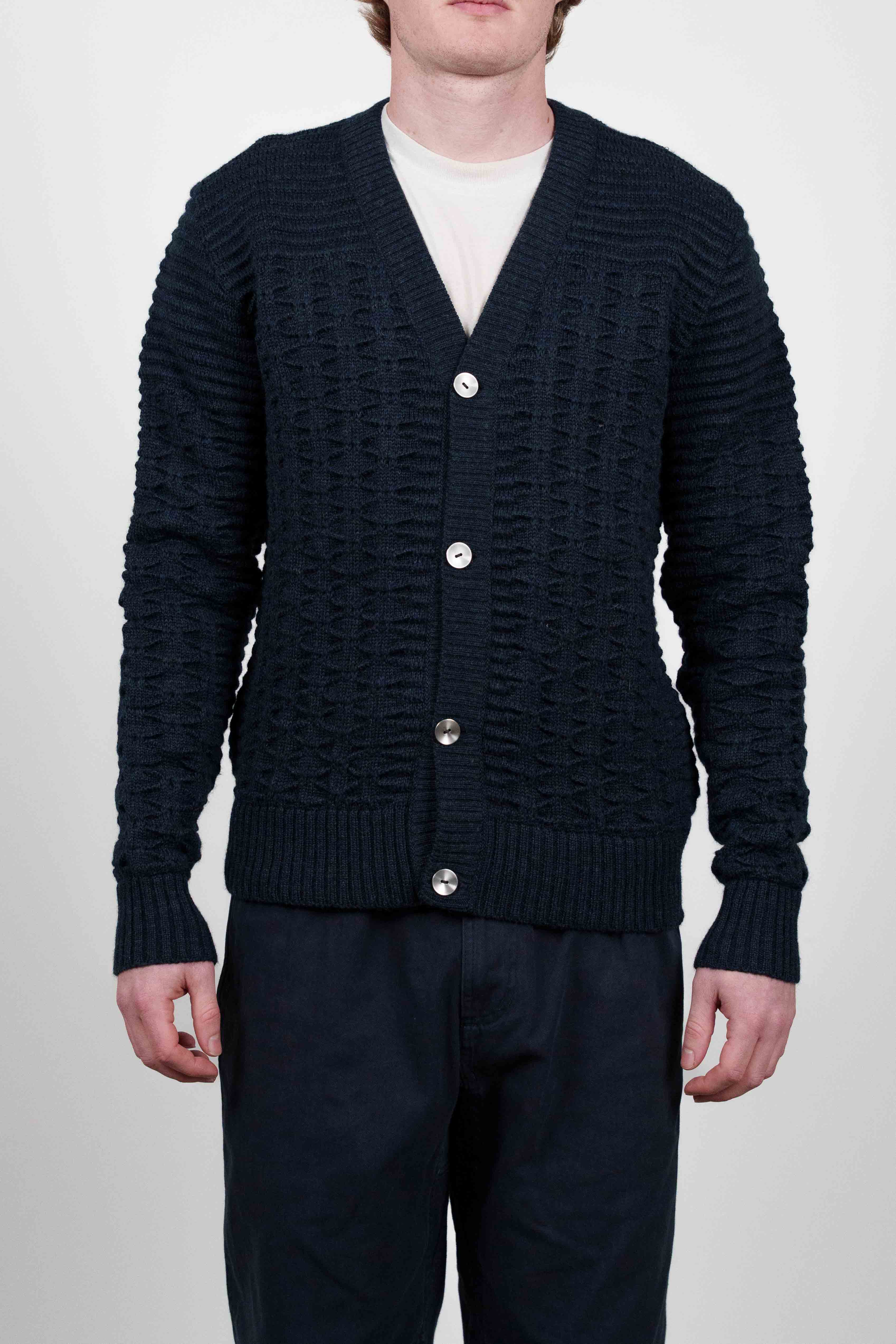 Mørkeblå strikket cardigan fra W012-kollektionen med et karakteristisk tekstureret mønster på krop og ærmer. Den har en V-udskæring, lyse knapper og ribkanter ved manchetter og forneden, hvilket giver en solid fornemmelse.