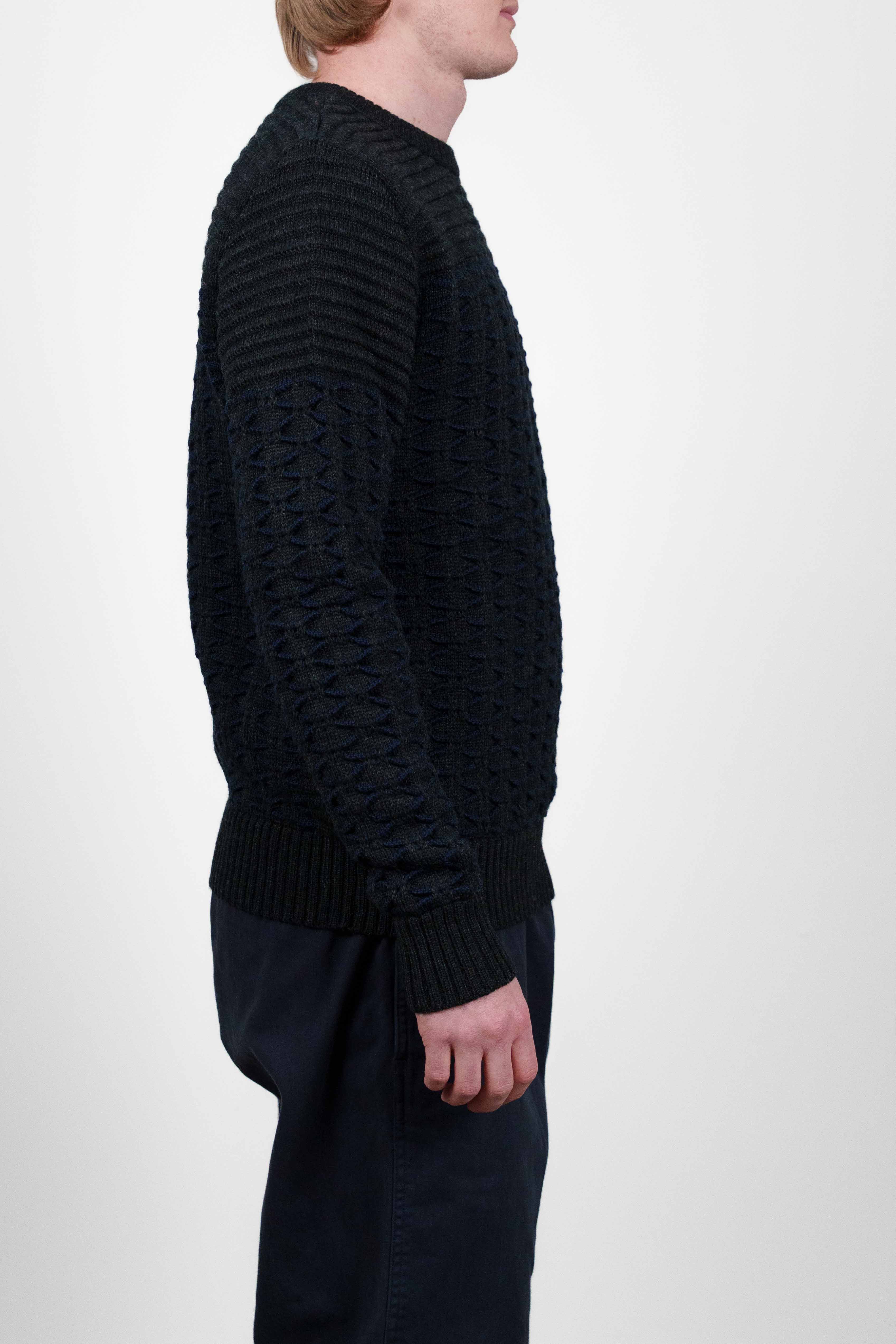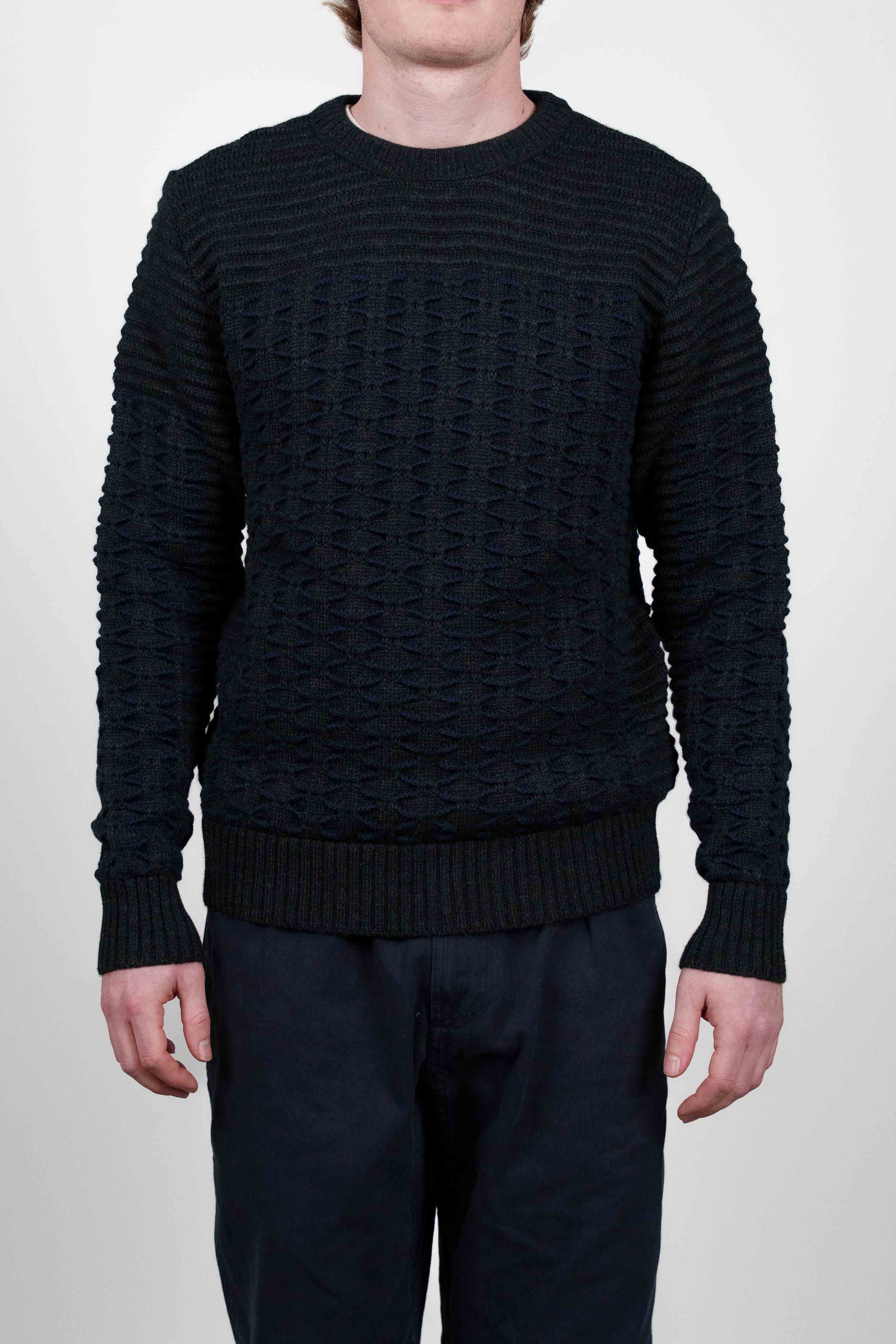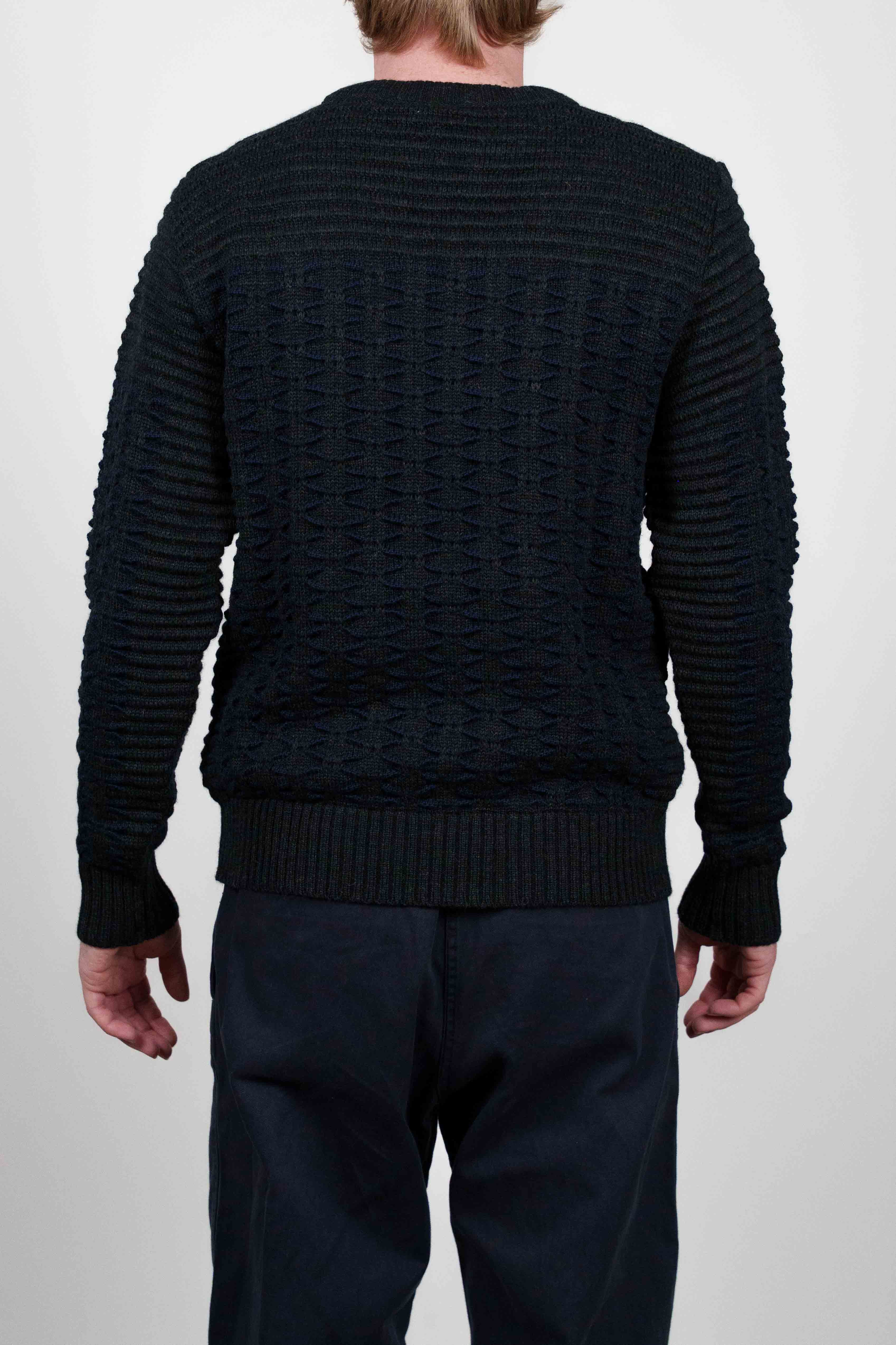 Den har et hævet diamantmønster på krop og ærmer, vandret ribstrik på skuldrene samt ribkanter ved ærmer og forneden.