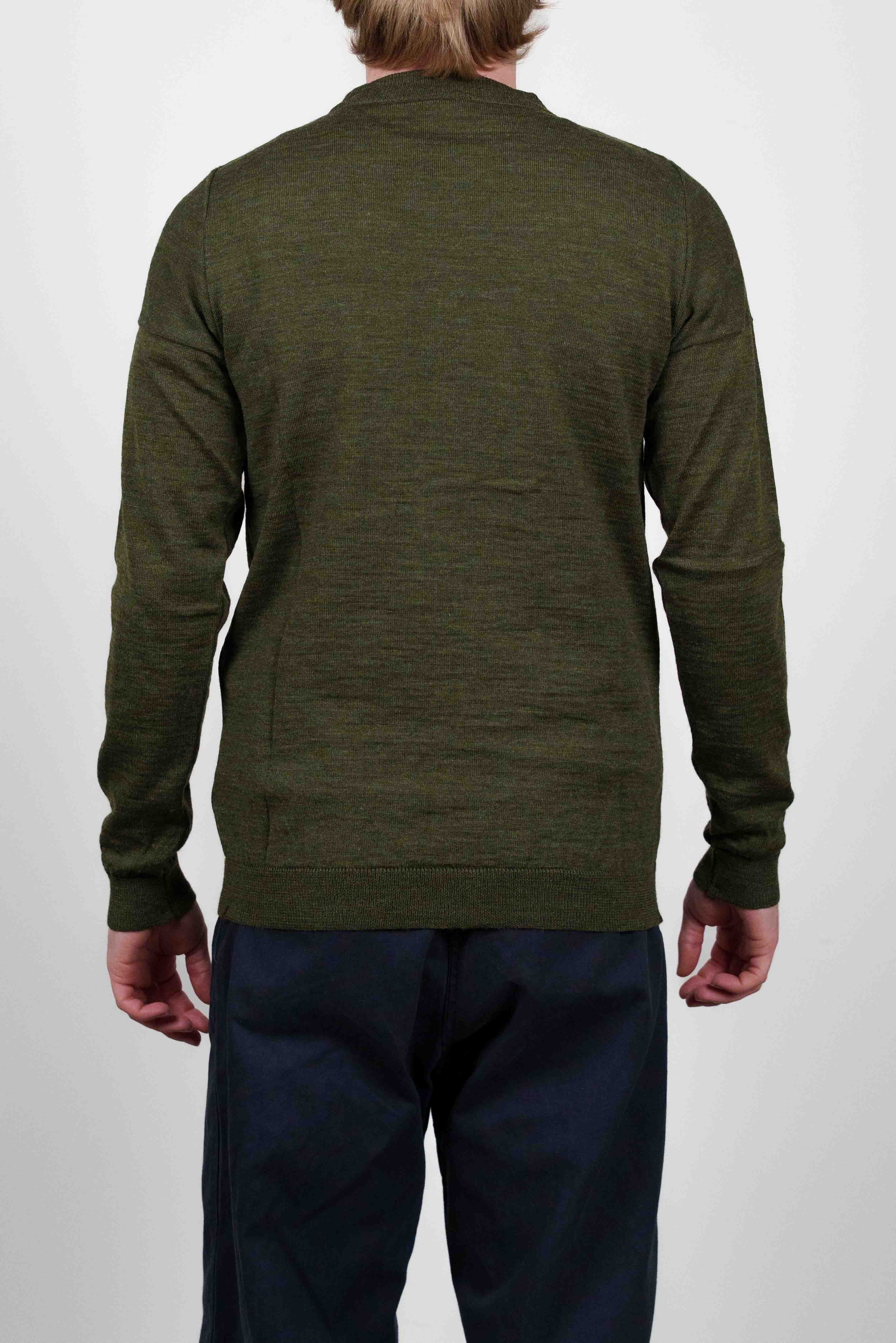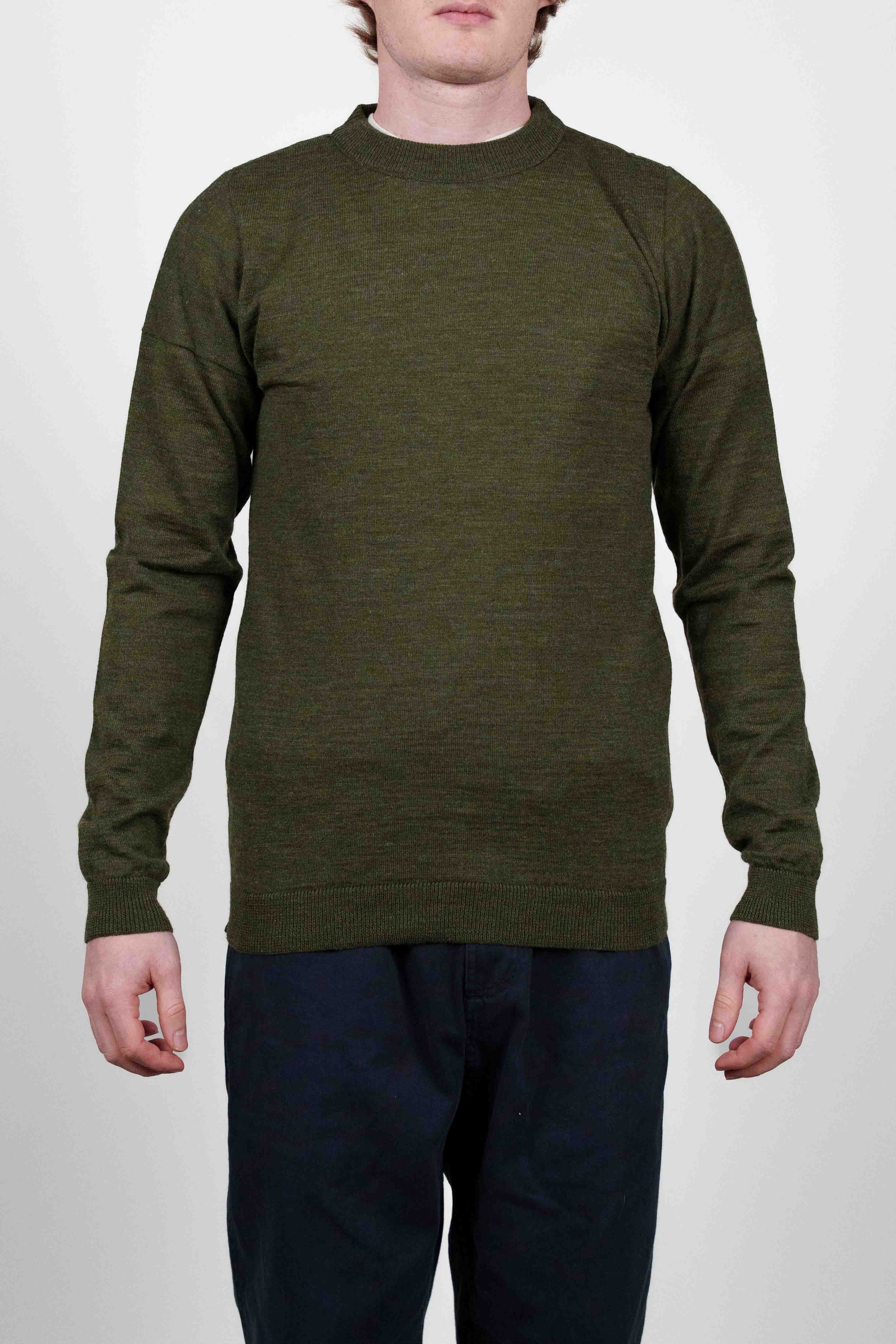 Mørk olivengrøn crew neck sweater fra W012-kollektionen med en fin, let strikket tekstur. Den har ribkanter ved manchetter, forneden og krave for en klassisk pasform.
