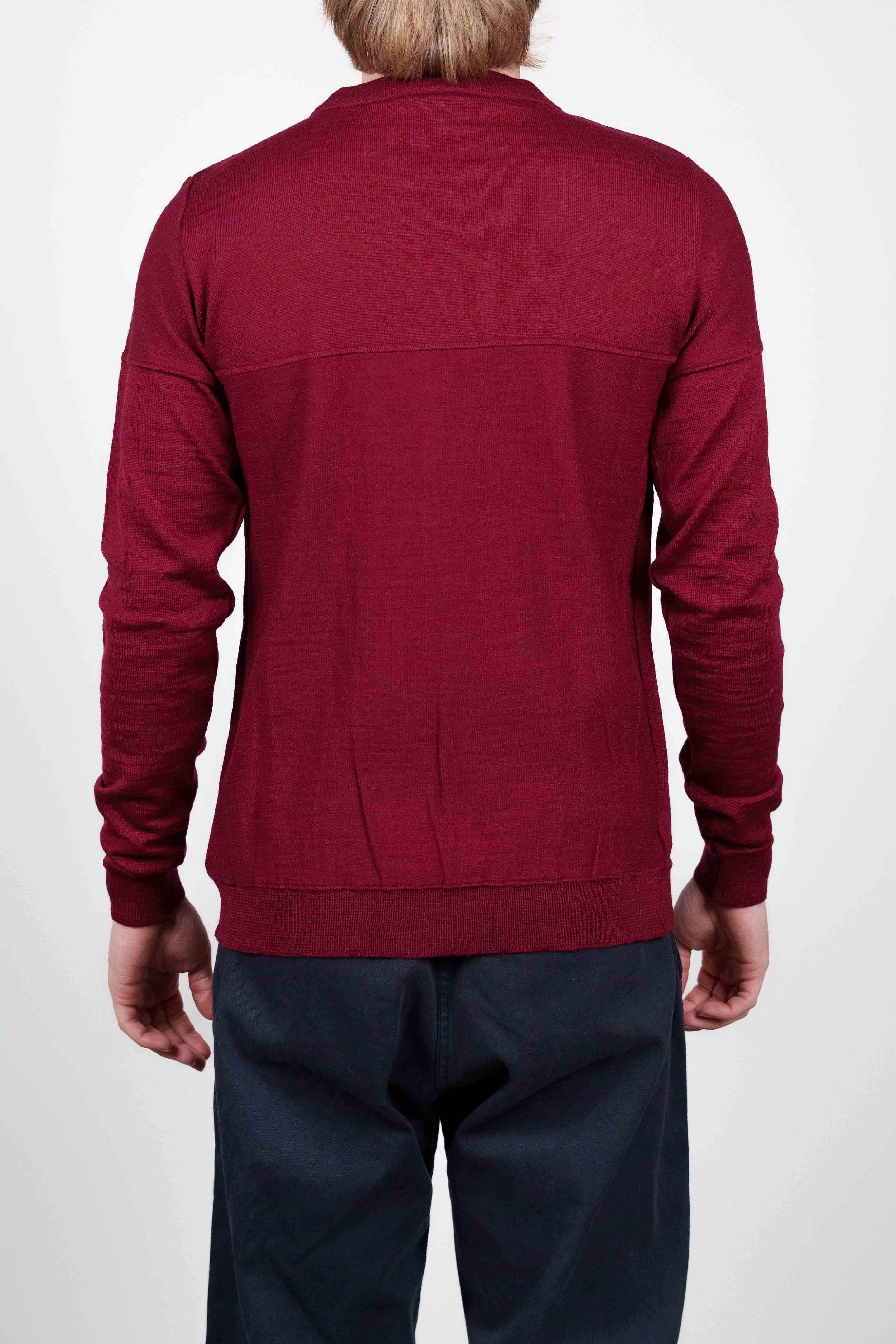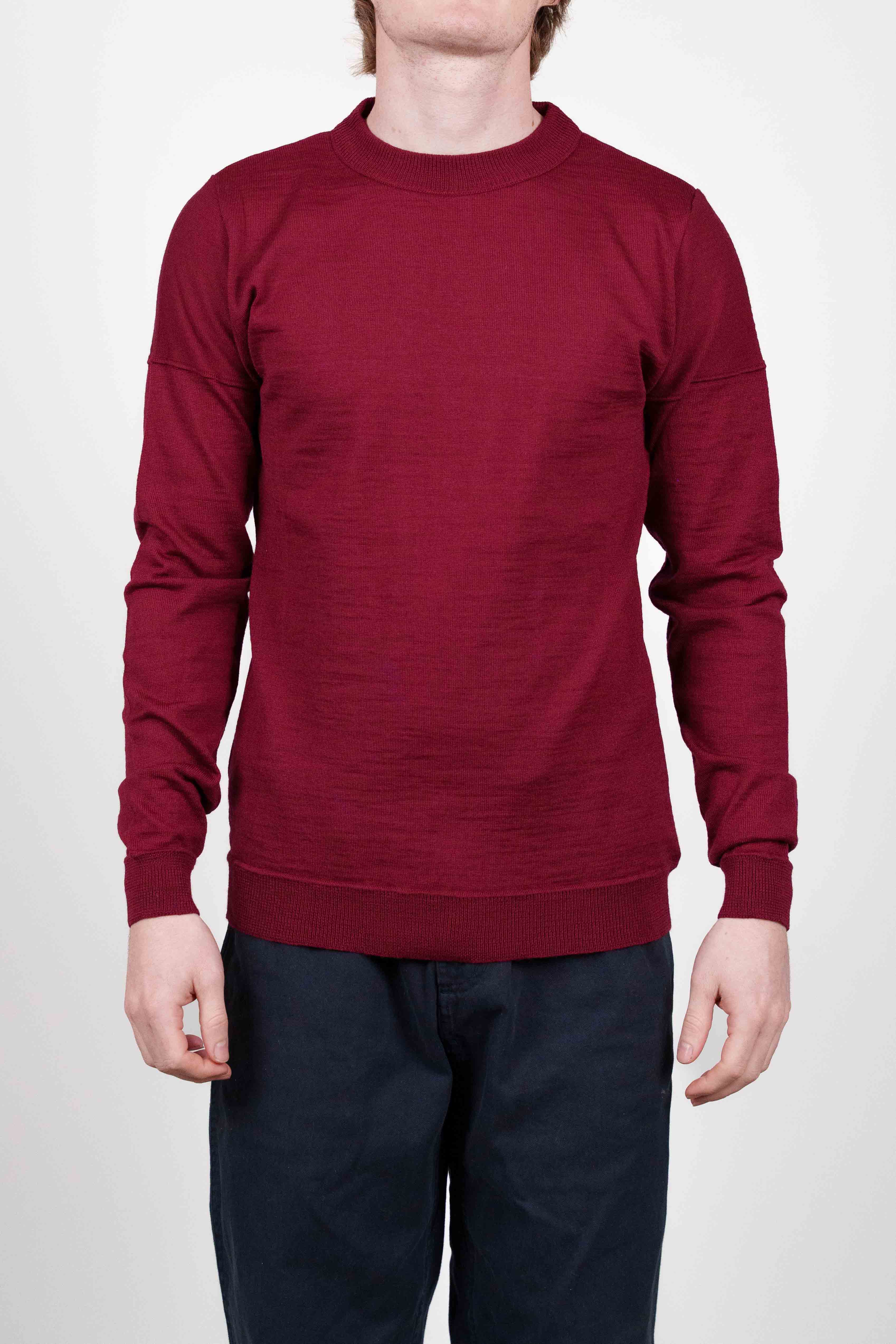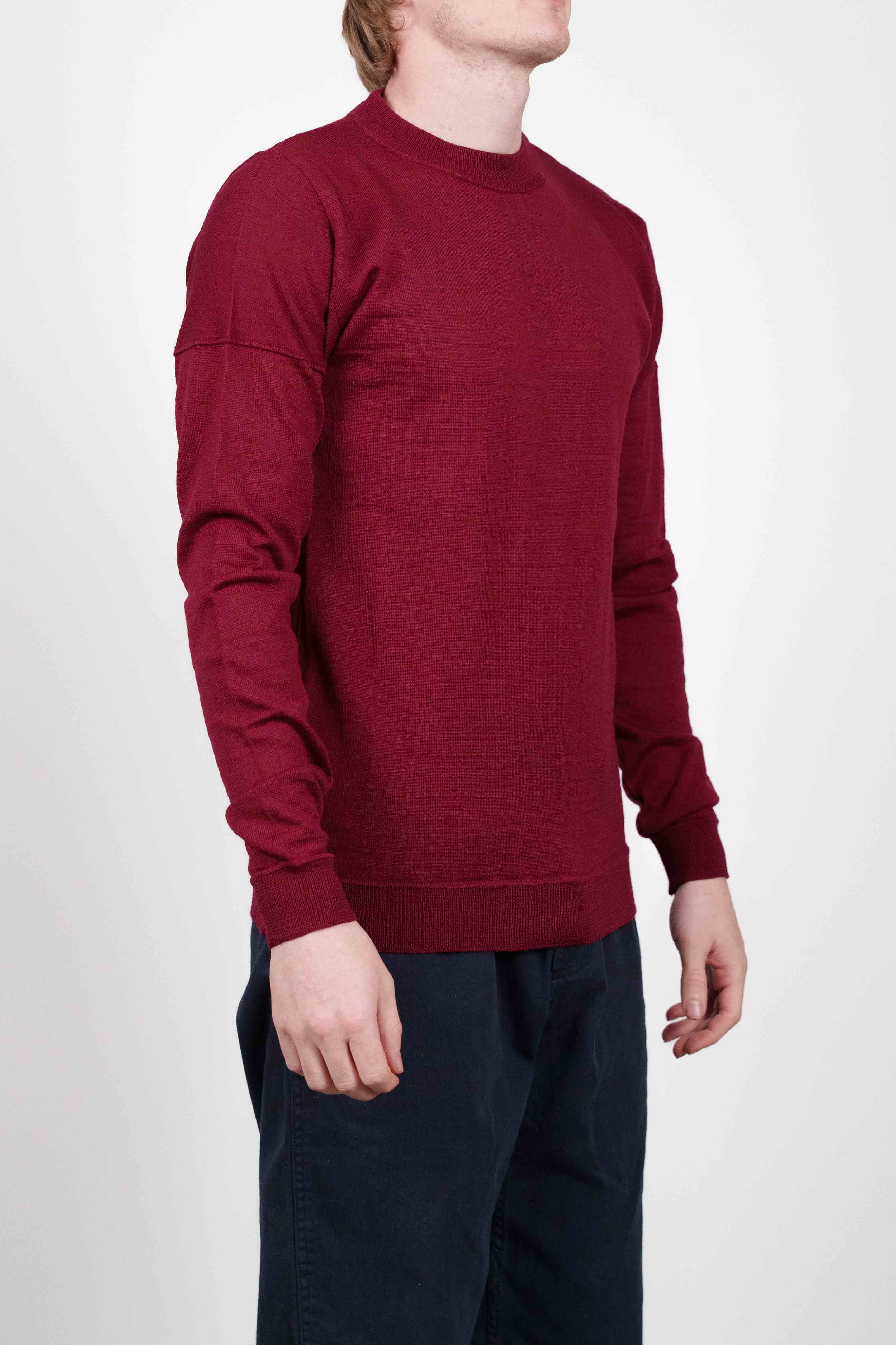 Dyb rød finstrikket crew neck sweater fra W014-kollektionen. Den har ribkanter ved manchetter, forneden og i halsudskæringen samt en let tekstur, der gør den til en tidløs klassiker.