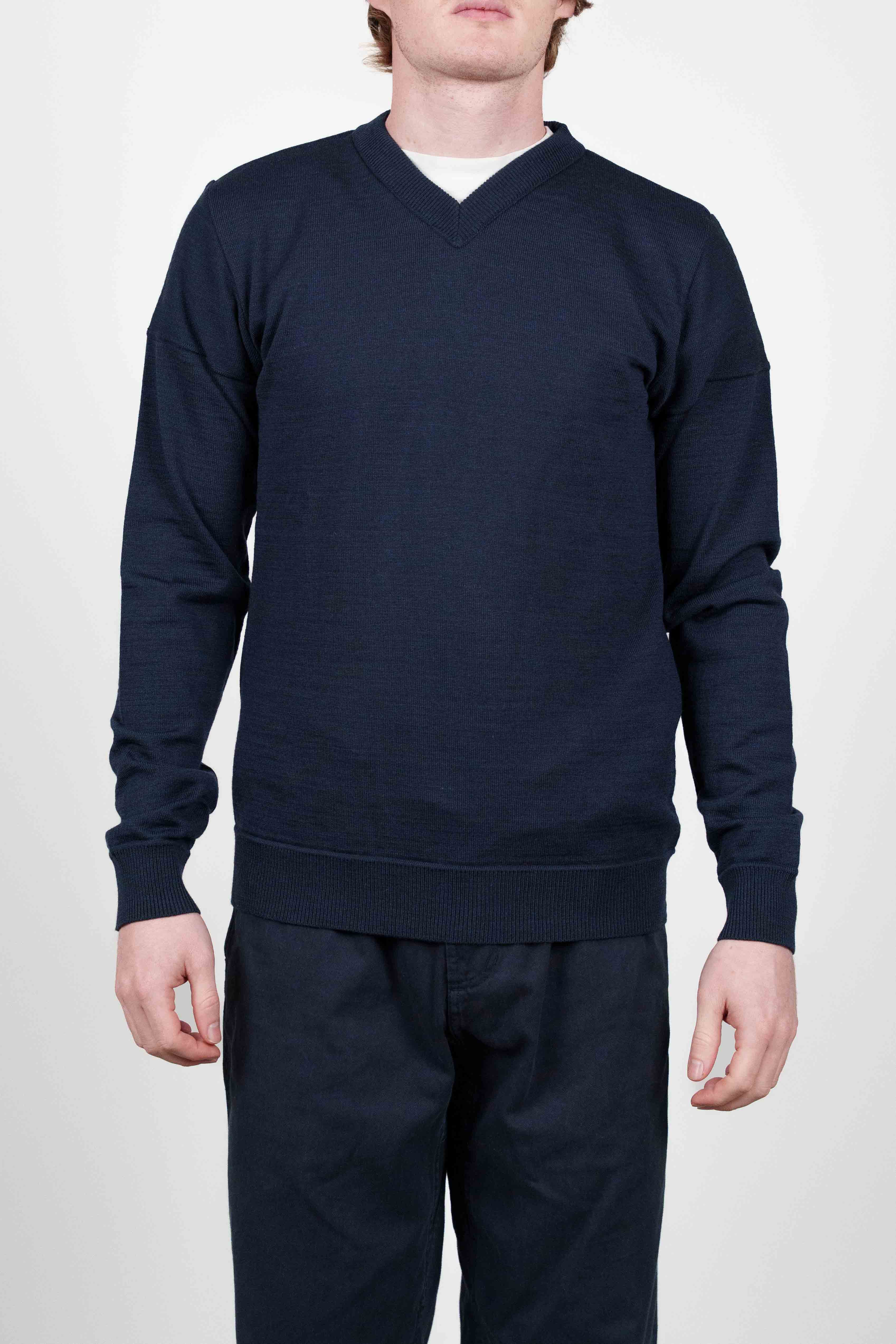 Mørkeblå V-hals sweater fra vores W012-kollektion, fremstillet i en finstrikket kvalitet med ribkanter ved ærmer og forneden.