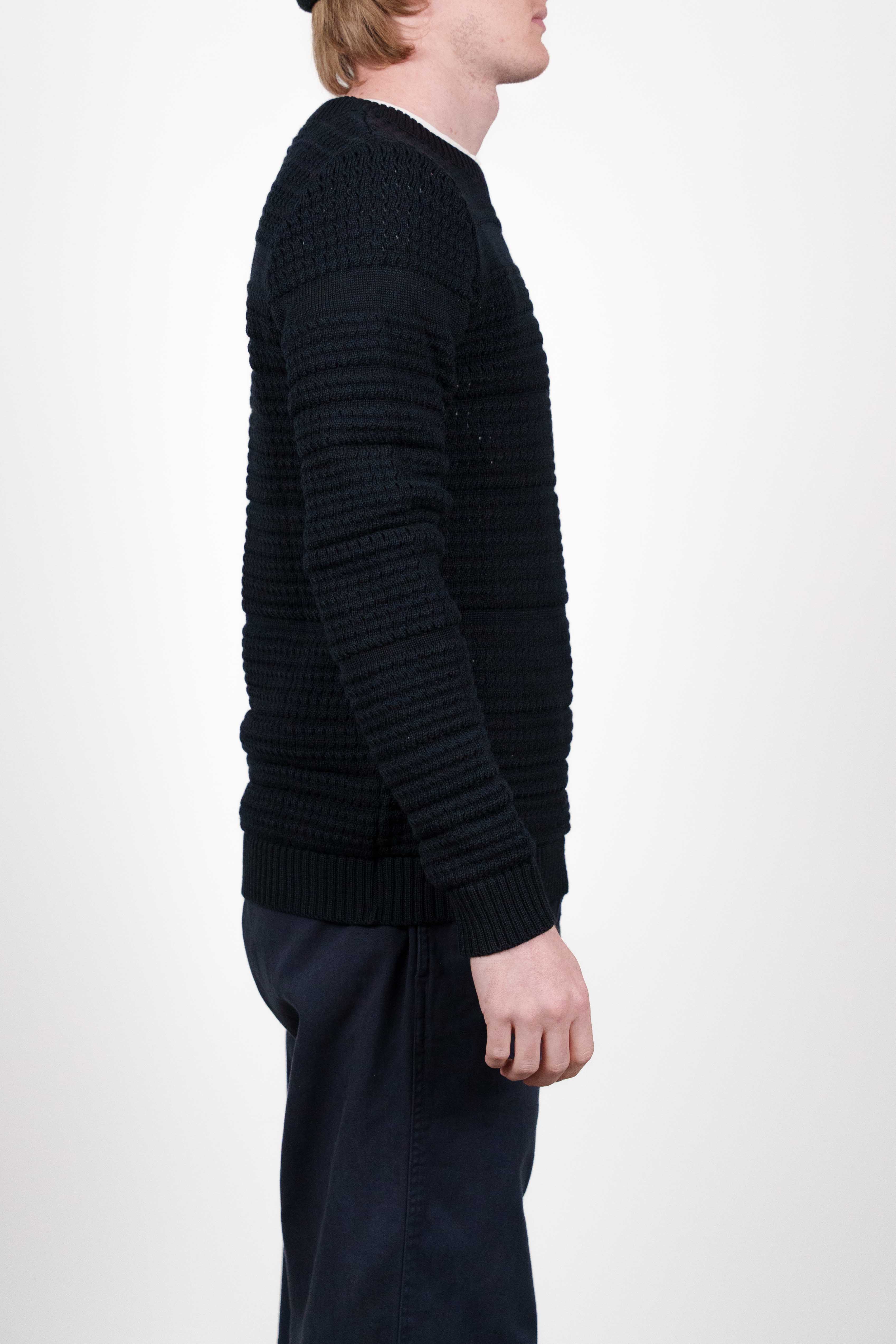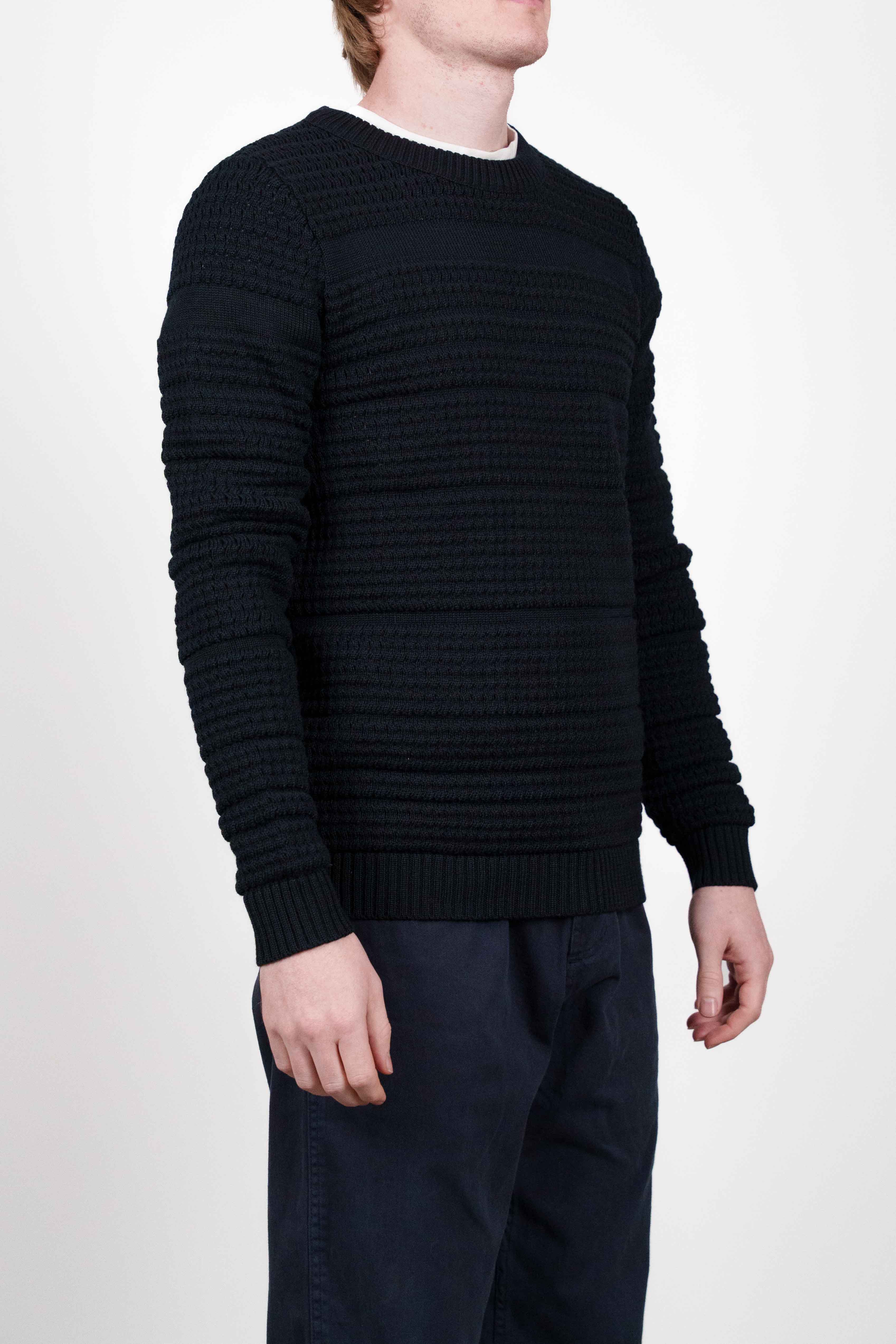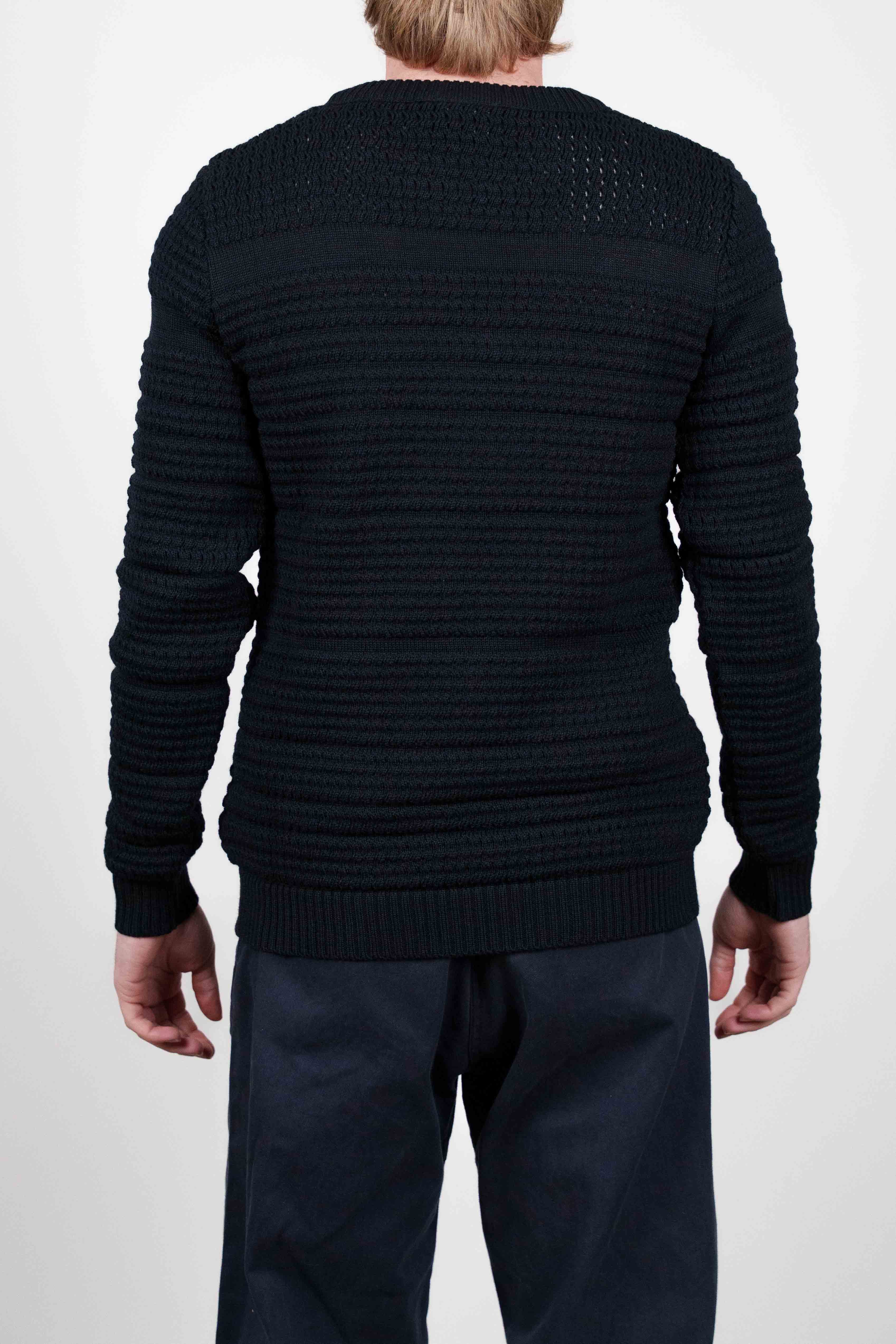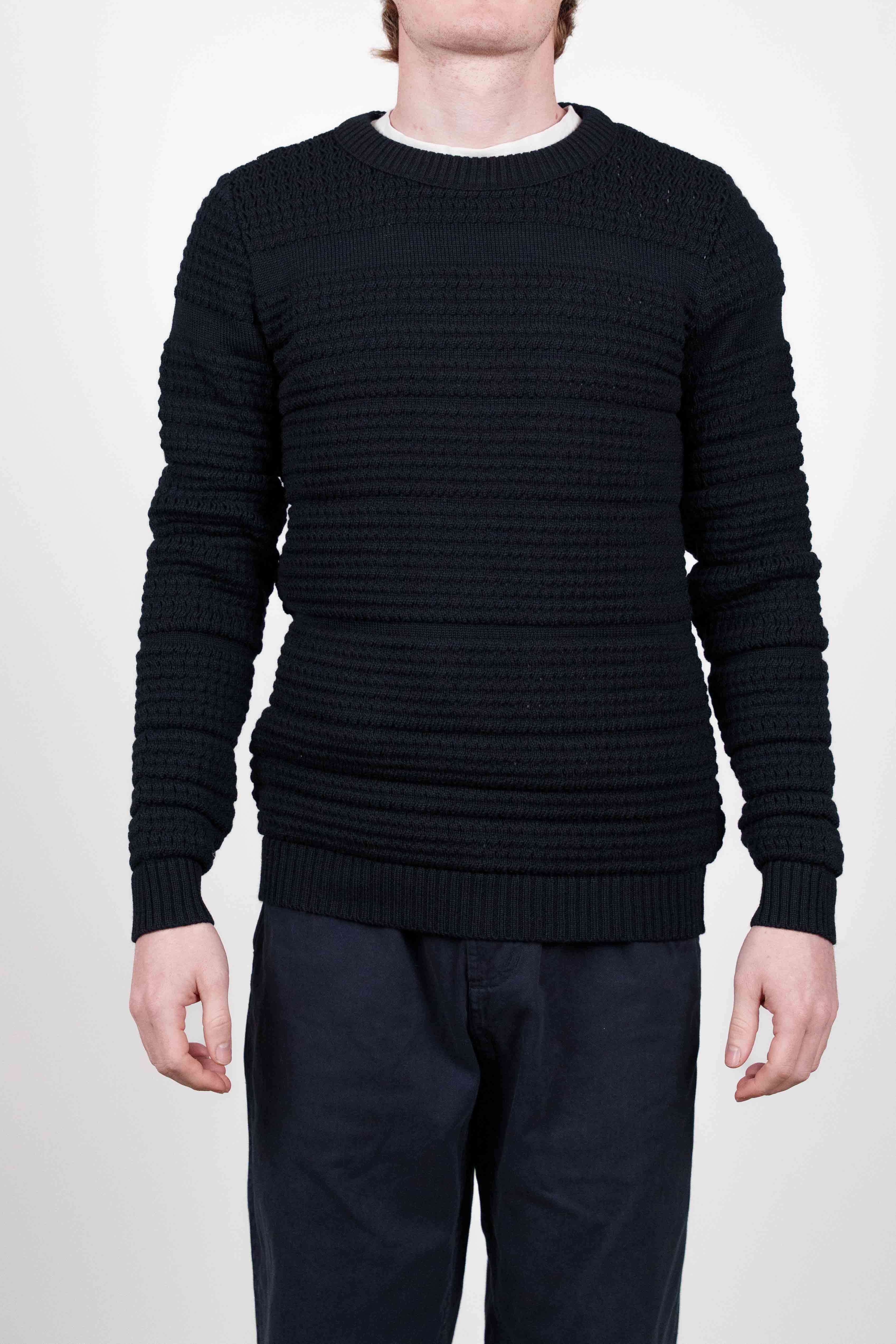 Mørkeblå crew neck sweater fra W014-kollektionen, udført i en taktil, tekstureret strik. Sweateren har vandrette ribmønstre på kroppen, en raffineret bølgelignende tekstur på skuldre og ærmer, og afsluttes med ribstrikkede manchetter samt kant for en behagelig pasform.