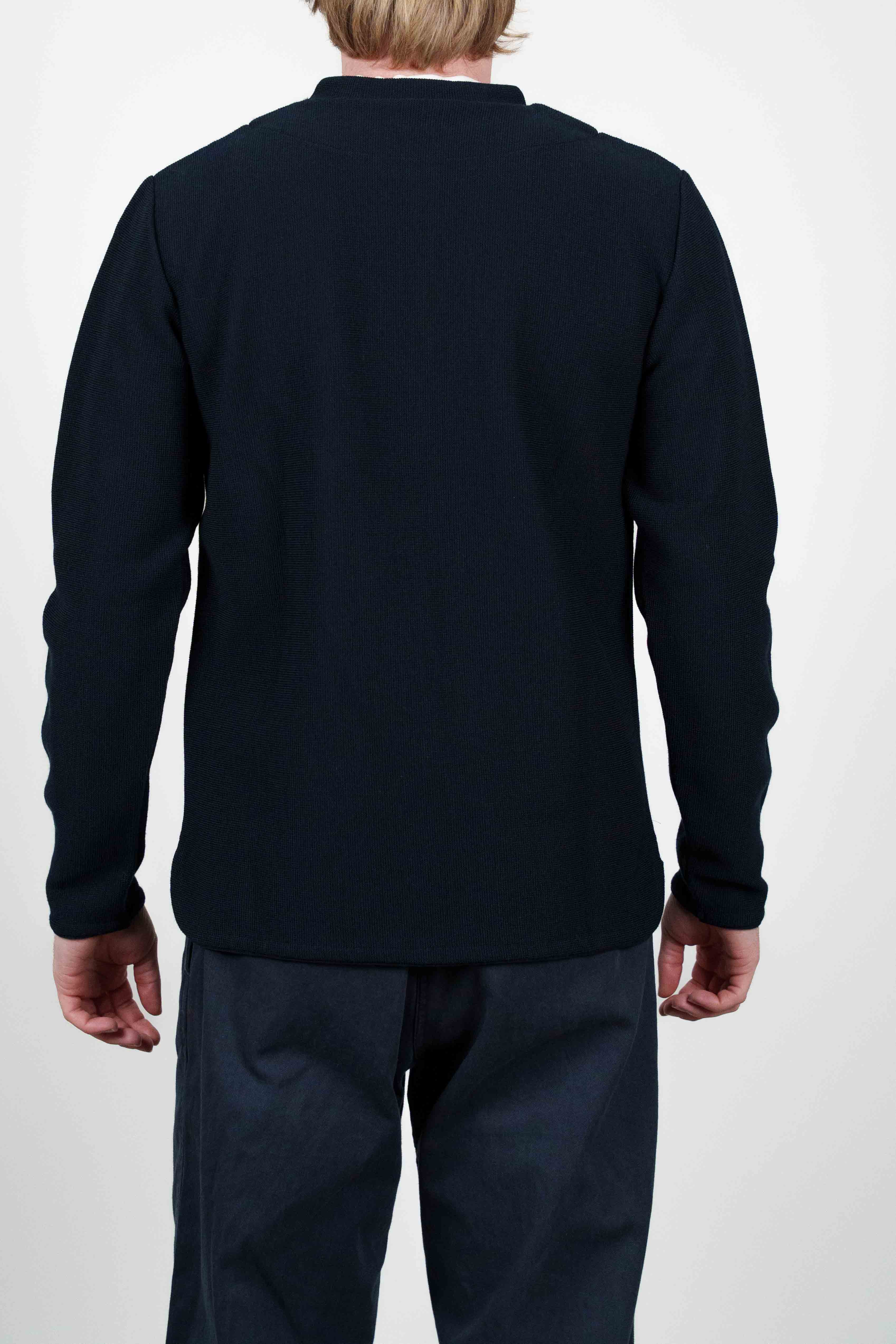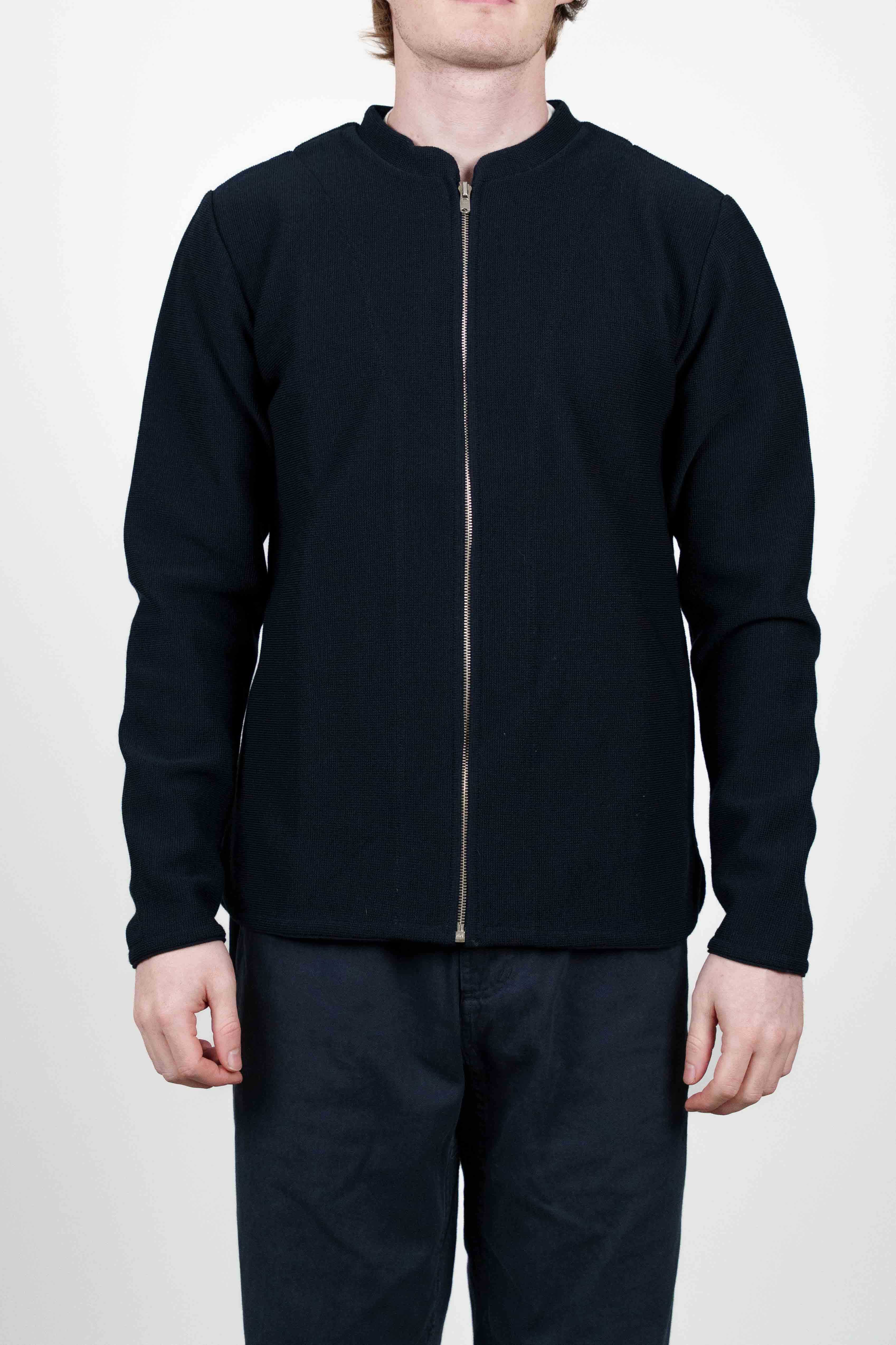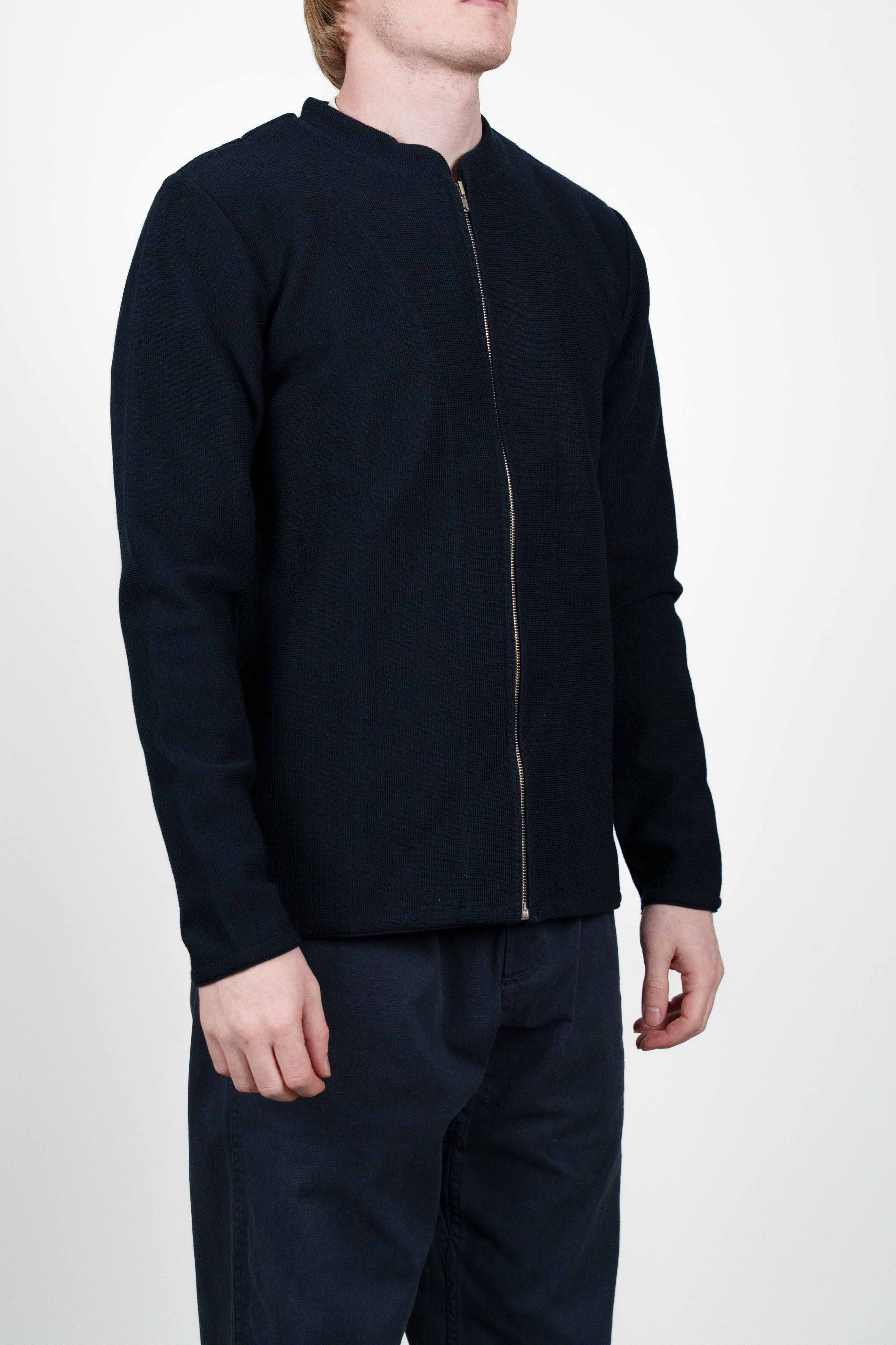 Mørkeblå full-zip sweater fra W016-kollektionen med en ribstrikket tekstur og opretstående krave. Det er en mellemvægts beklædningsgenstand med lange ærmer.