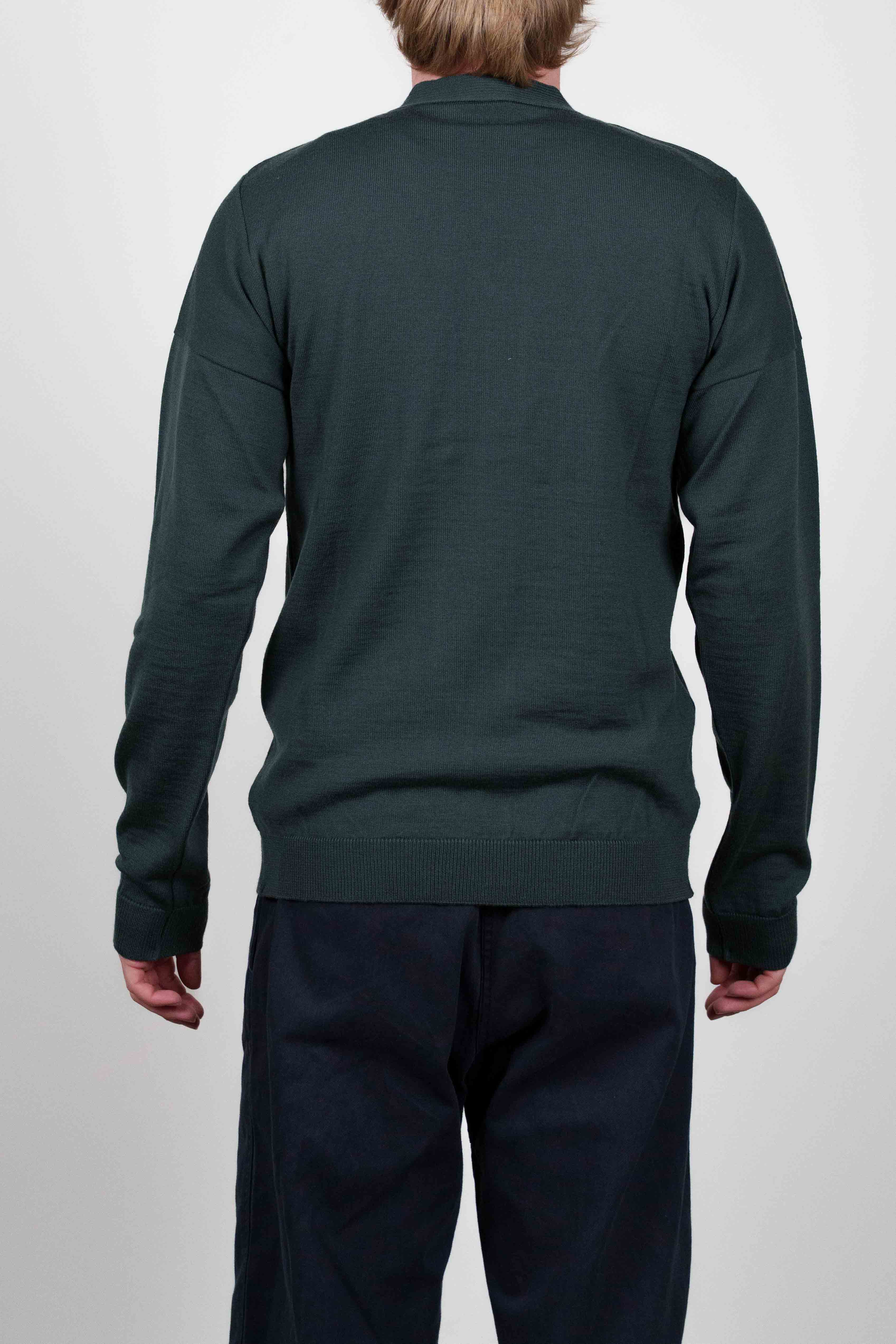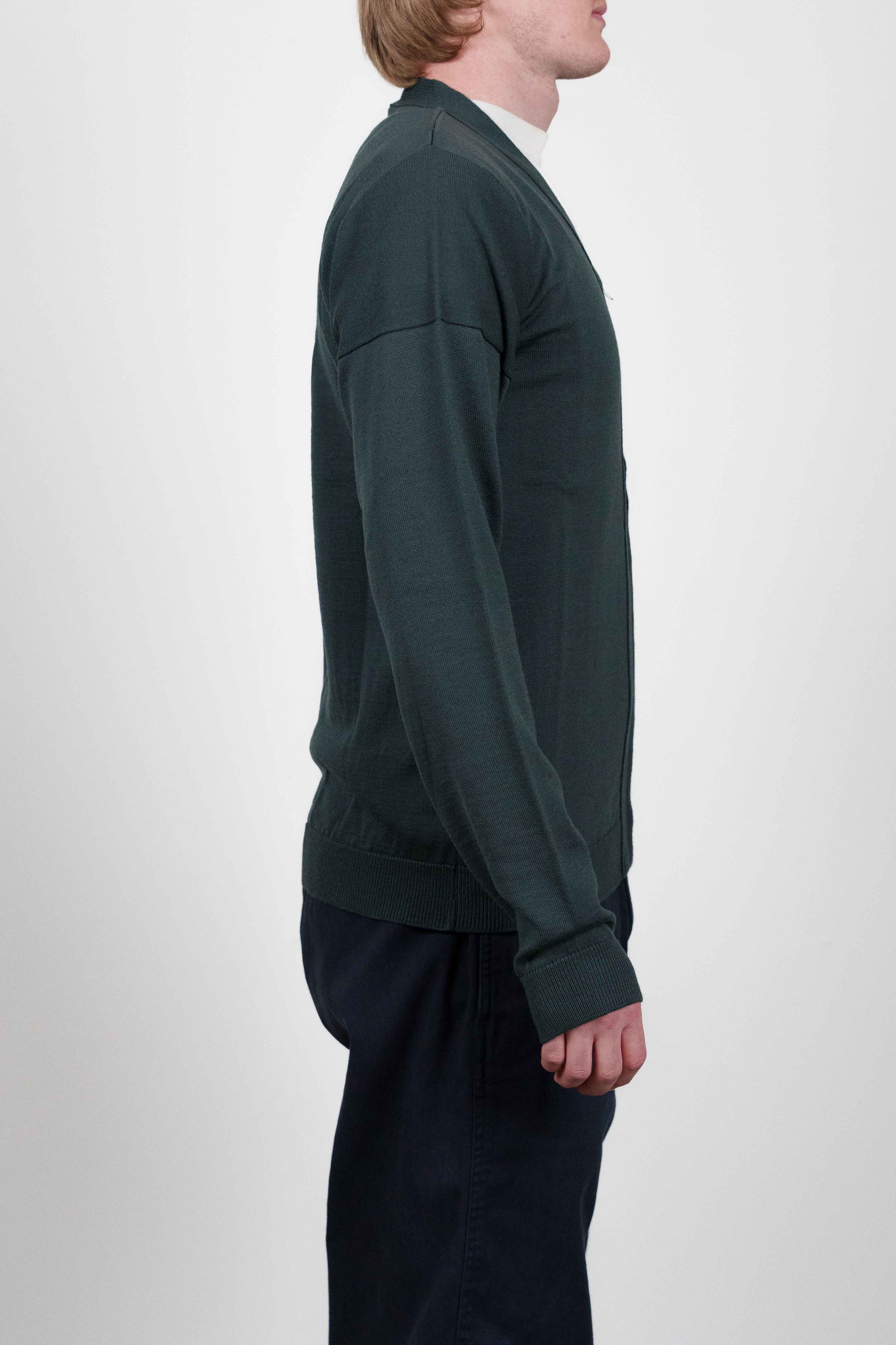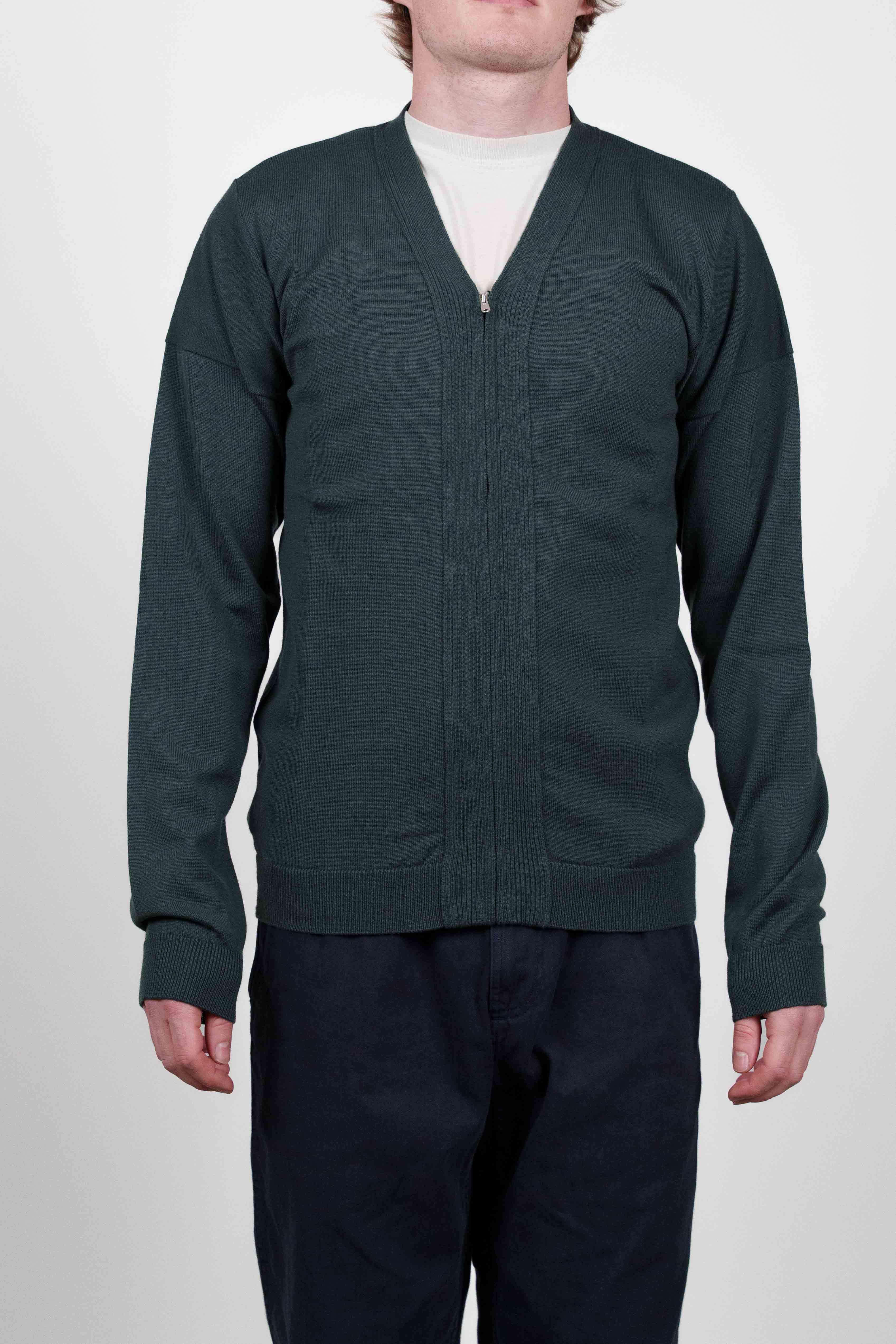 Mørkegrøn, finstrikket cardigan med fuld lynlås fra vores W012-kollektion, designet med en V-hals krave samt ribkanter ved ærmer og forneden.