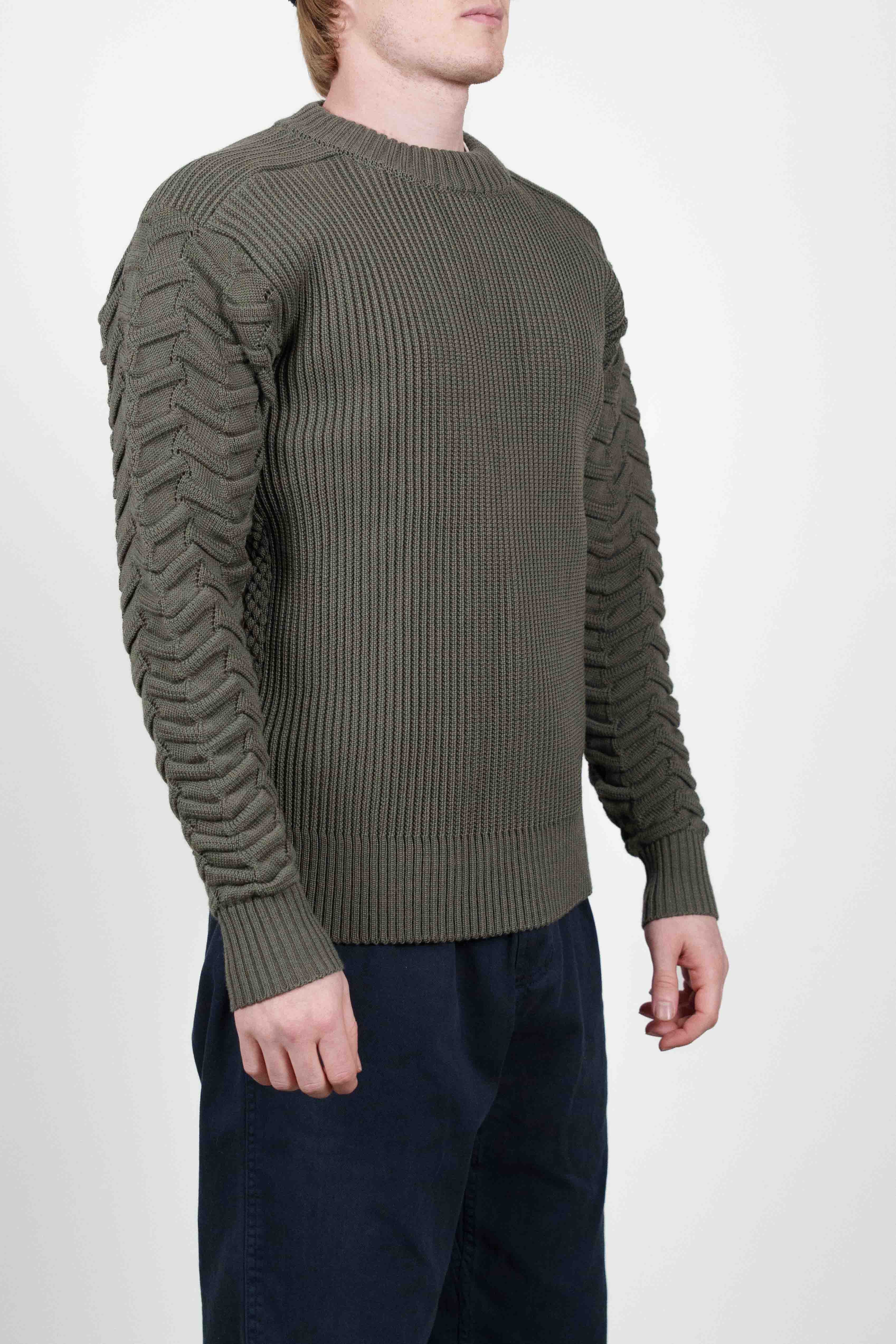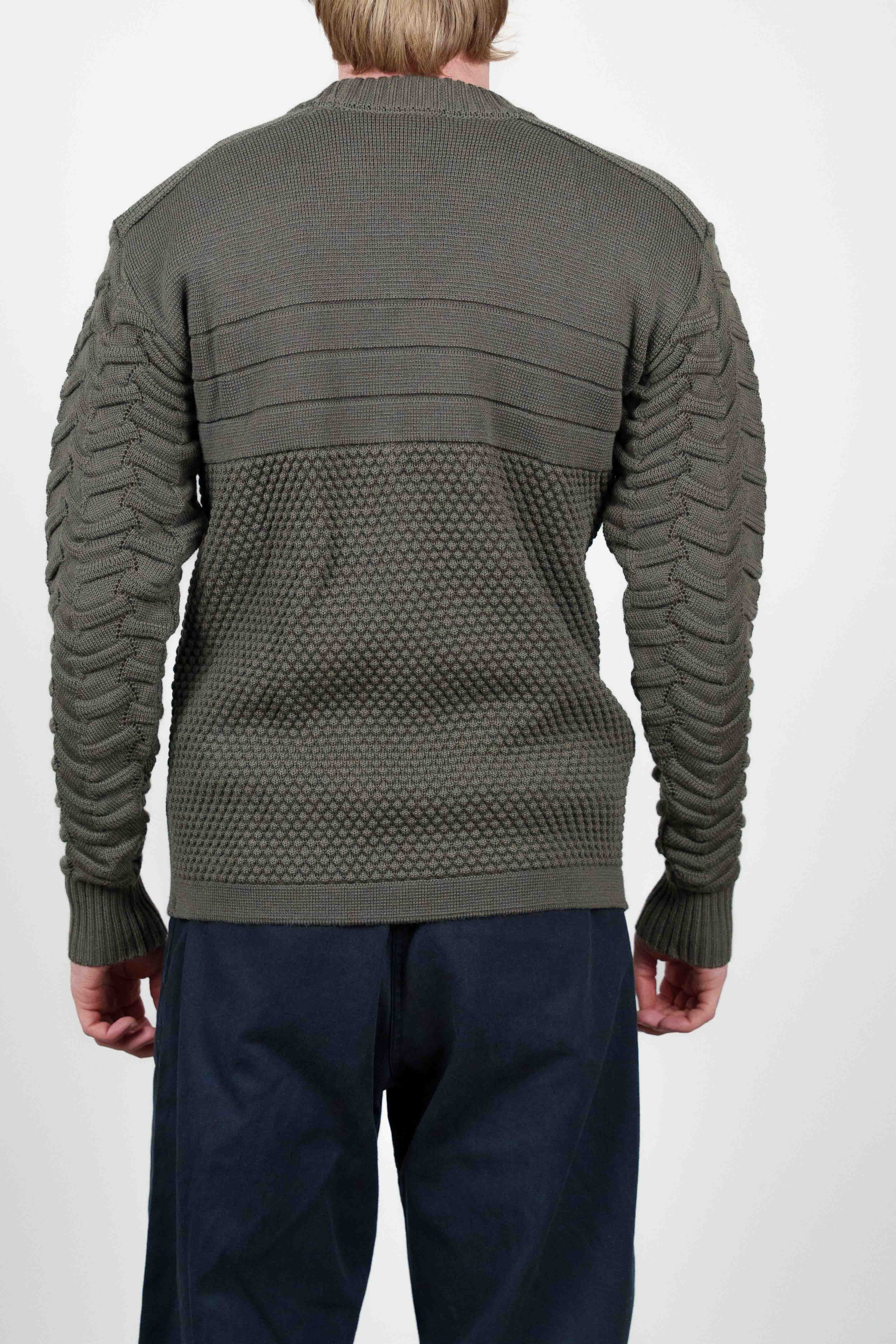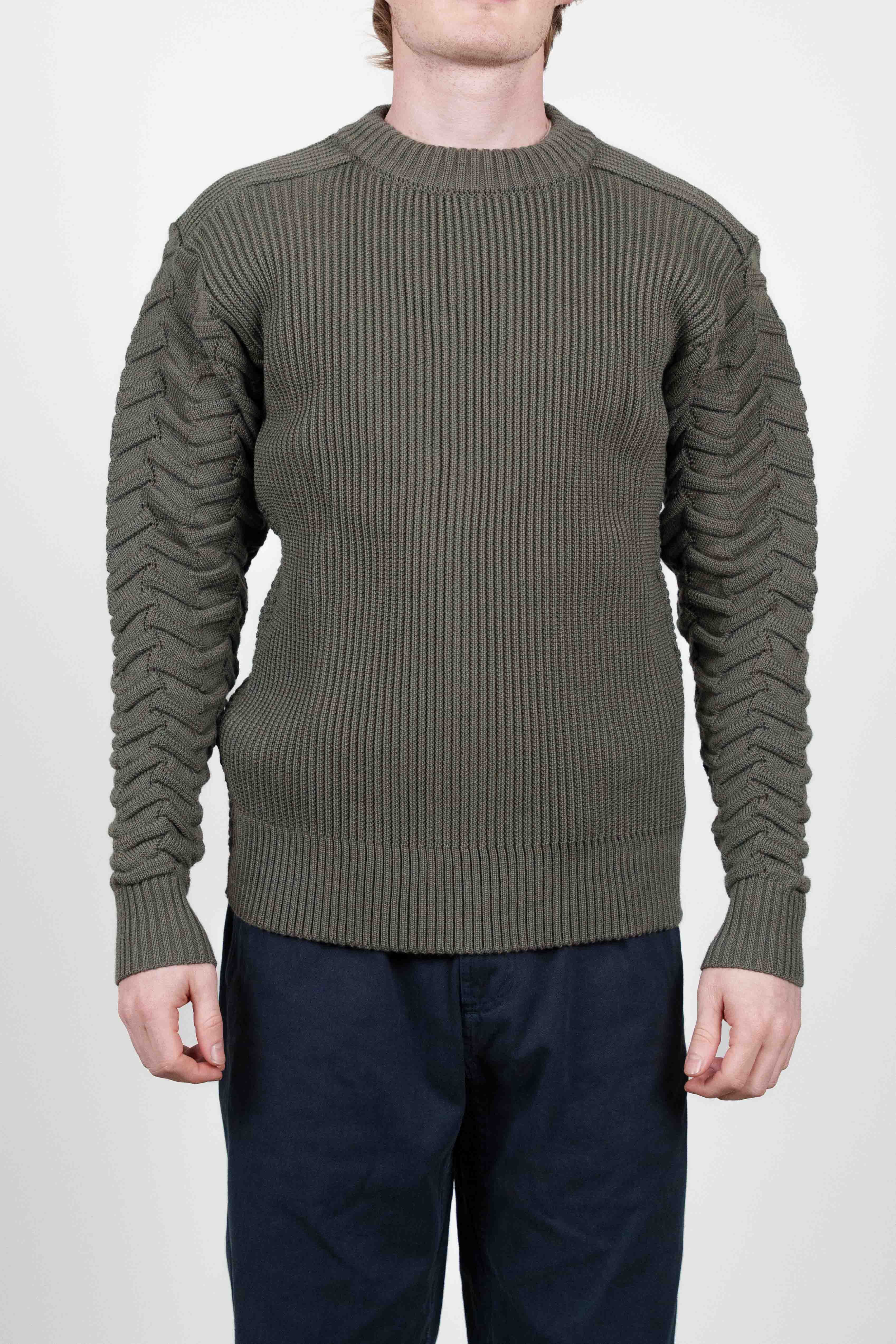 Mørk olivengrøn sweater med rund hals fra vores W015-kollektion. Den har en fremtrædende lodret ribstrik på kroppen, med unik zig-zag tekstureret rib på ærmerne, og klassiske ribbede manchetter og krave.