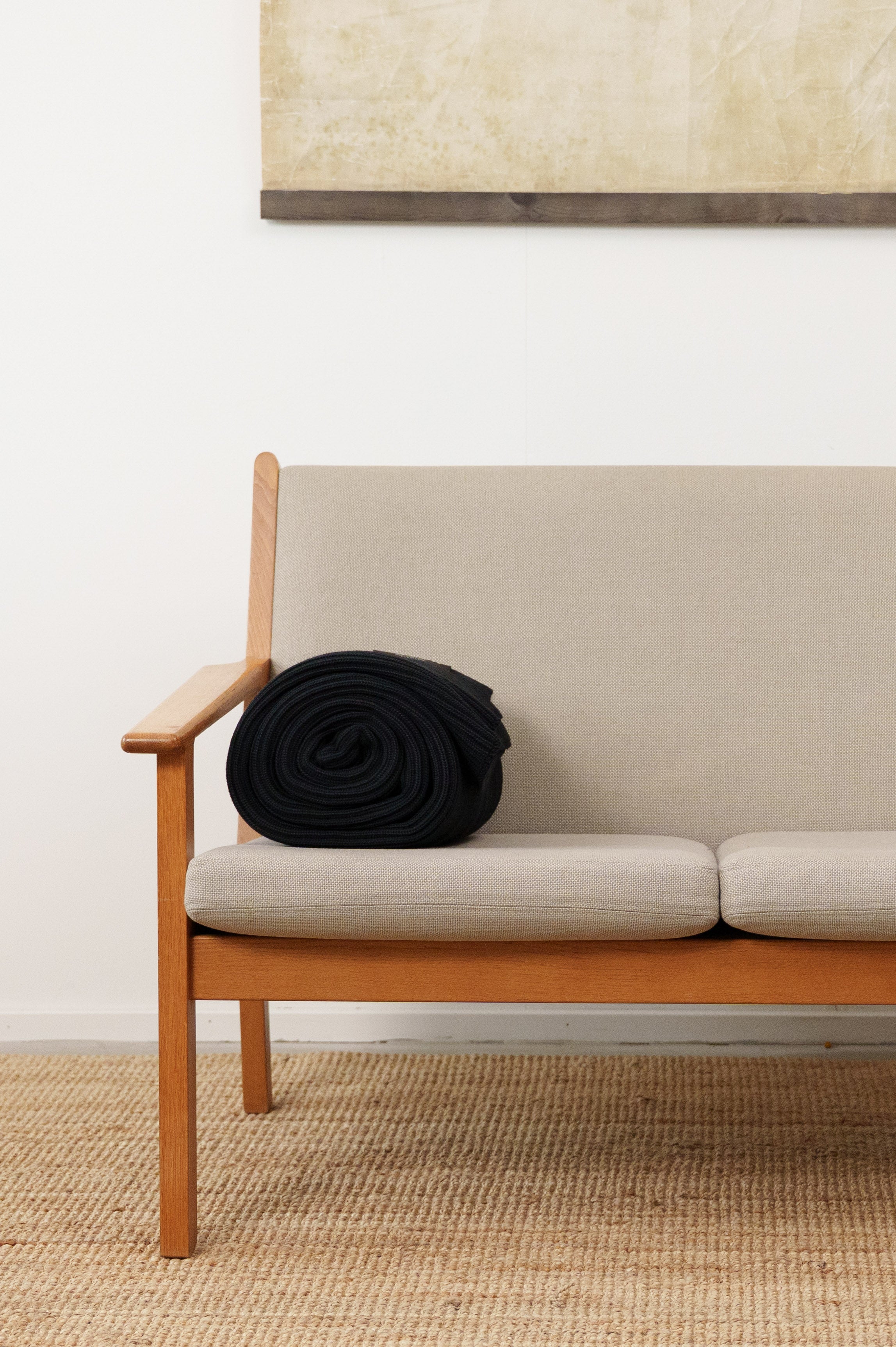HAVEN er vores ribstrikkede tæppe, strikket på tyske fladstrikmaskiner fra 1960'erne, bygget til at køre med mere garn og strikke tættere end moderne maskiner. Hvor LOYAL tæppet bærer sit mønster i 2 farvet jacquard, arbejder HAVEN i rene farveflader, enten ensfarvet eller som et mekanisk melange af flere garner der skaber dybde og variation i overfladen. Strikket af garn fra vores trøjeproduktion. Tæt strikket for vægtens skyld, med en fjedrende smidighed der lader tæppet falde og forme sig.