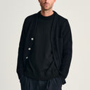 DESIGN | Robust cardigan med reference til 1970’ernes danske Civilforsvarsstrik. Teknisk indstrikket skulder- og albueforstærkning. Tung men raffineret med præget signaturknapper og indstrikket forlomme. |
